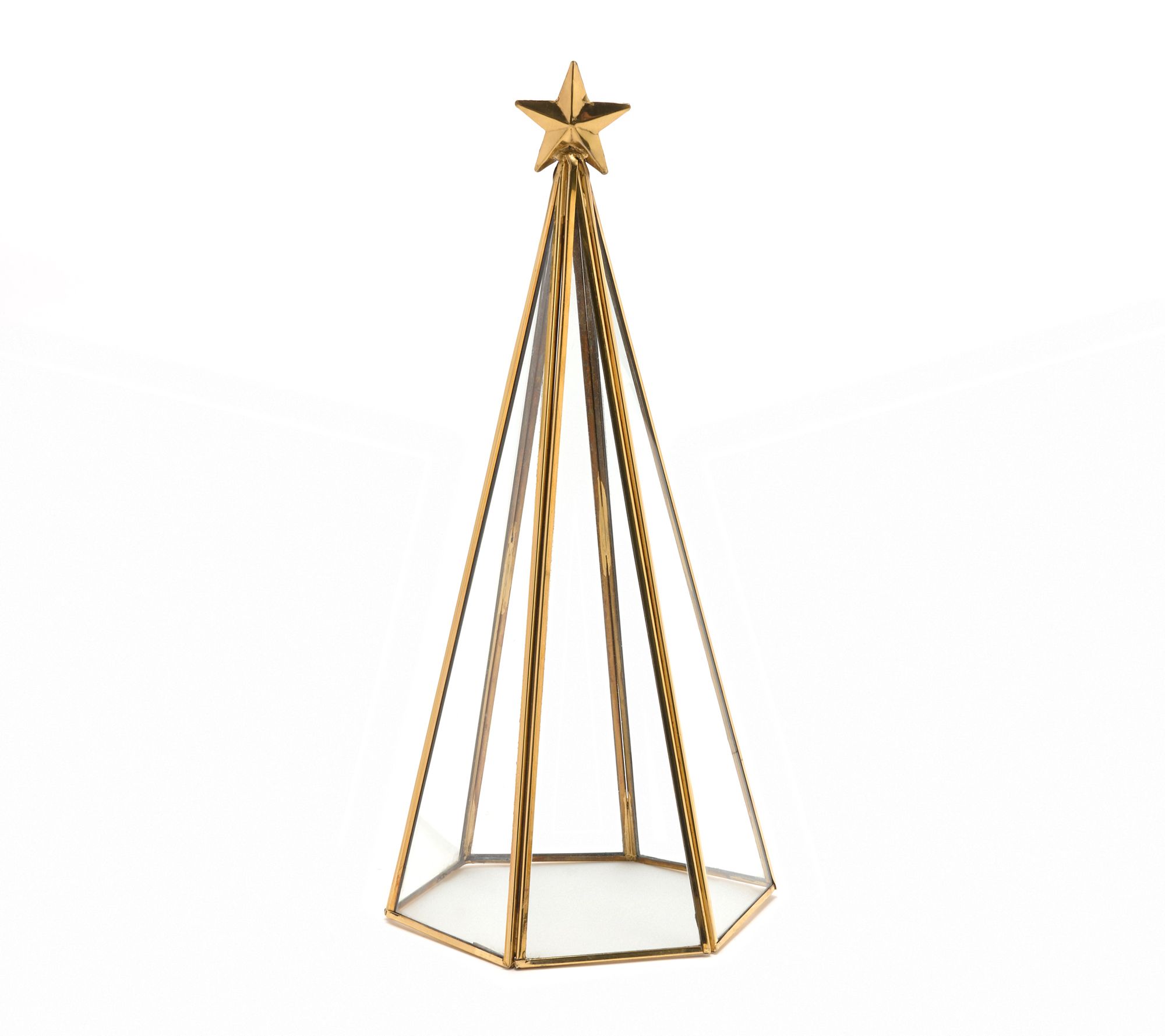 A gleaming tree cloche offers an elegant way to showcase ornaments, keepsakes, or seasonal treasures. The metal base and glass dome create a stylish centerpiece that instantly enhances a mantel or side table, whether you fill it with flameless candles or let it shine all on its own. From Primrose Hill.