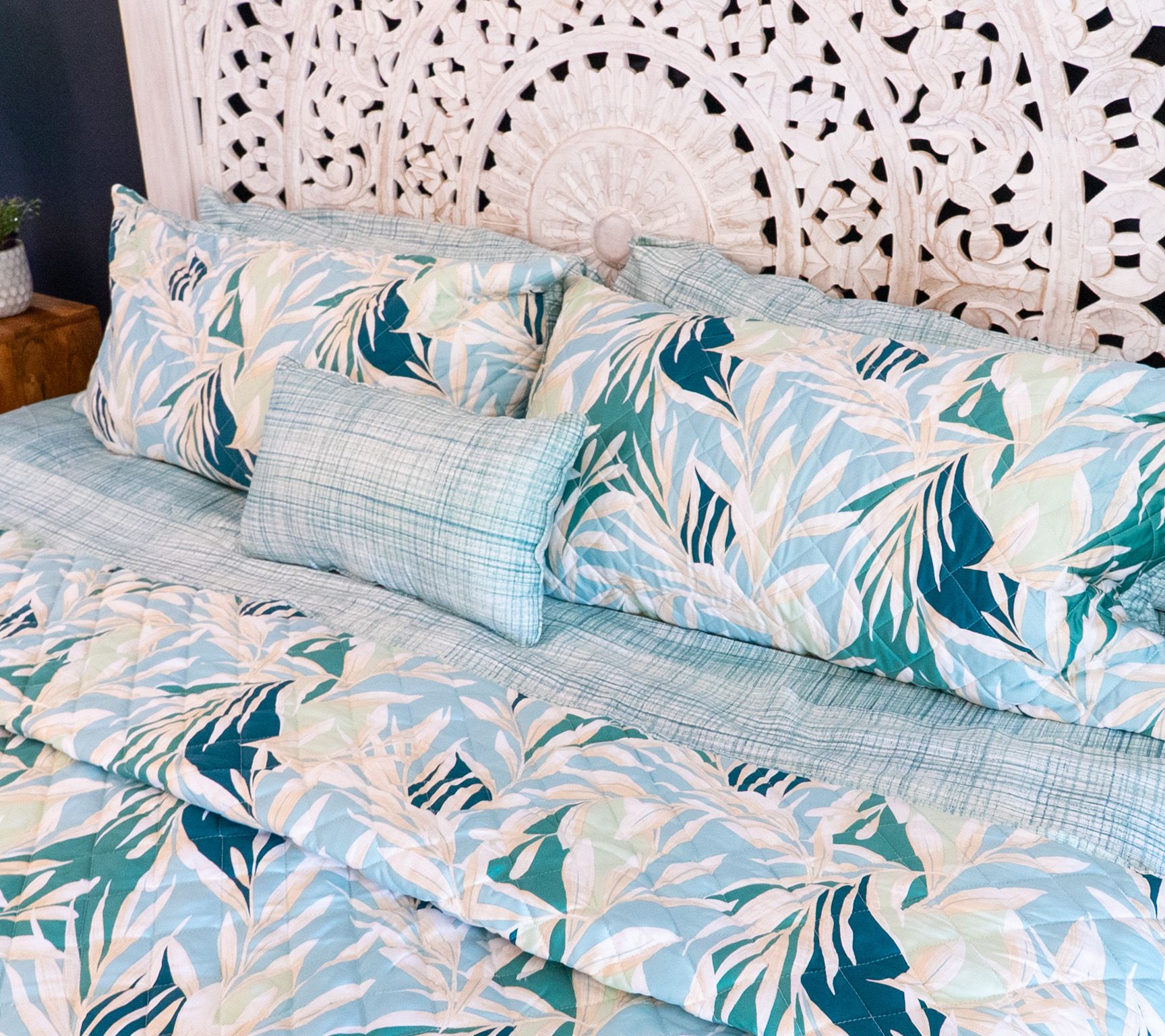 Seasonal bedding need a refresh? We're frond of this palm-printed quilt set by Kim Gravel! Styled with Kim's attention to lounge-in-bed comfort and playful looks, the set features a super-soft quilt, a coordinating sham, and a decorative pillow -- perfect for updating your bedroom or invigorating a guest room. Effortlessly switch up your style by reversing the quilt and shams. From Kim Gravel.