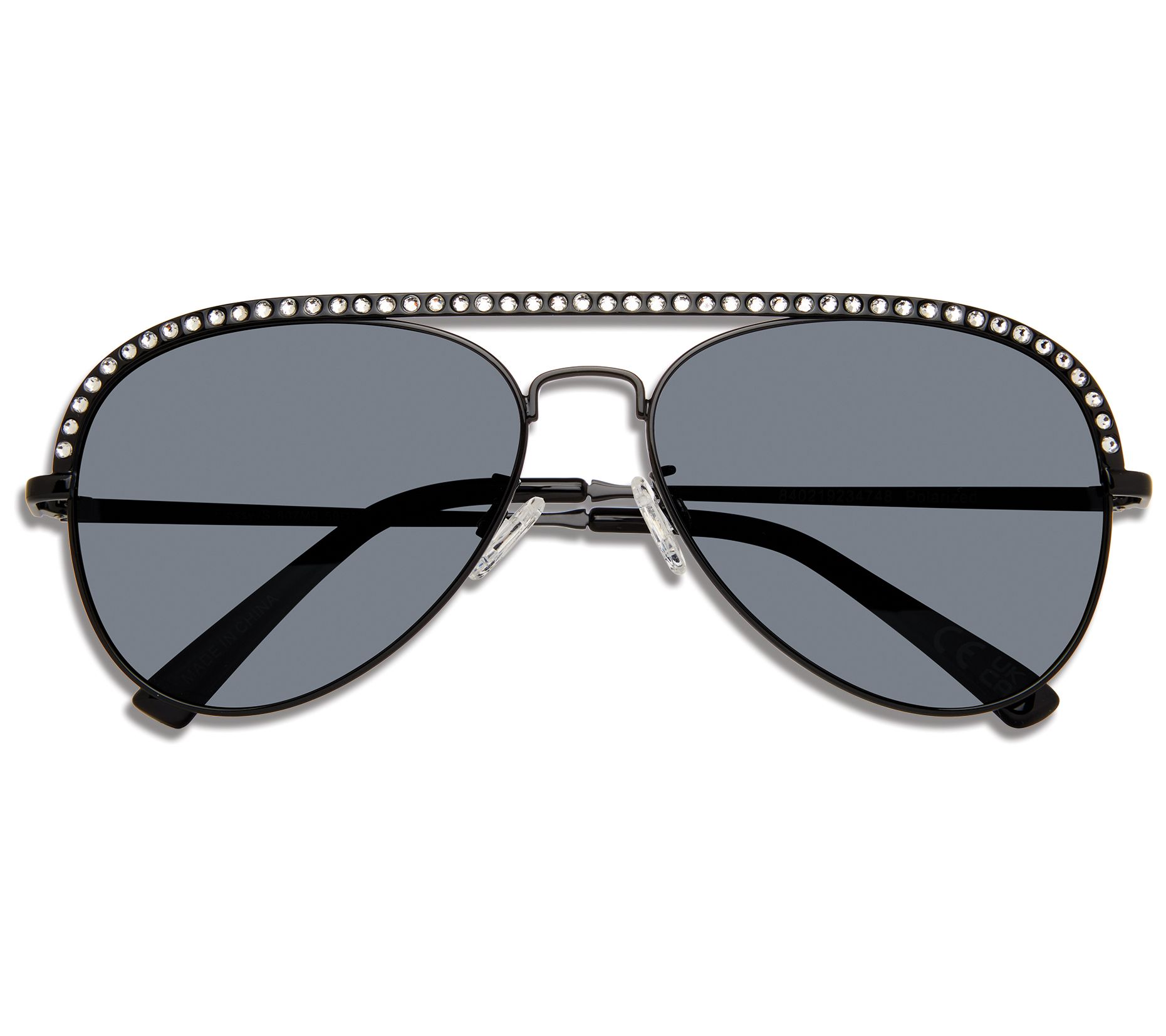 • Features: aviator shape, blue-light blocking, pave crystal-embellished top bar, stainless steel frame, polarized, plastic lenses