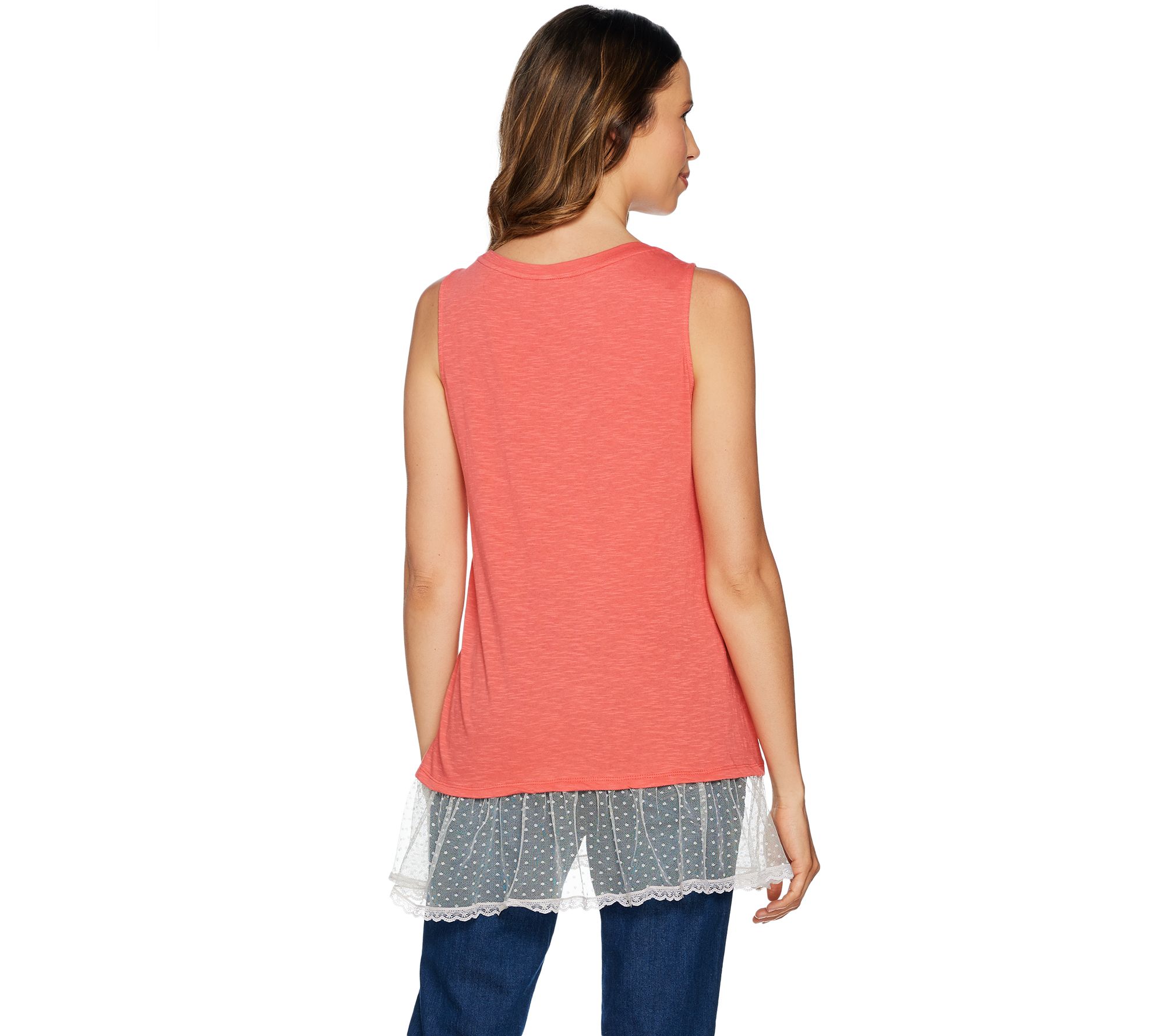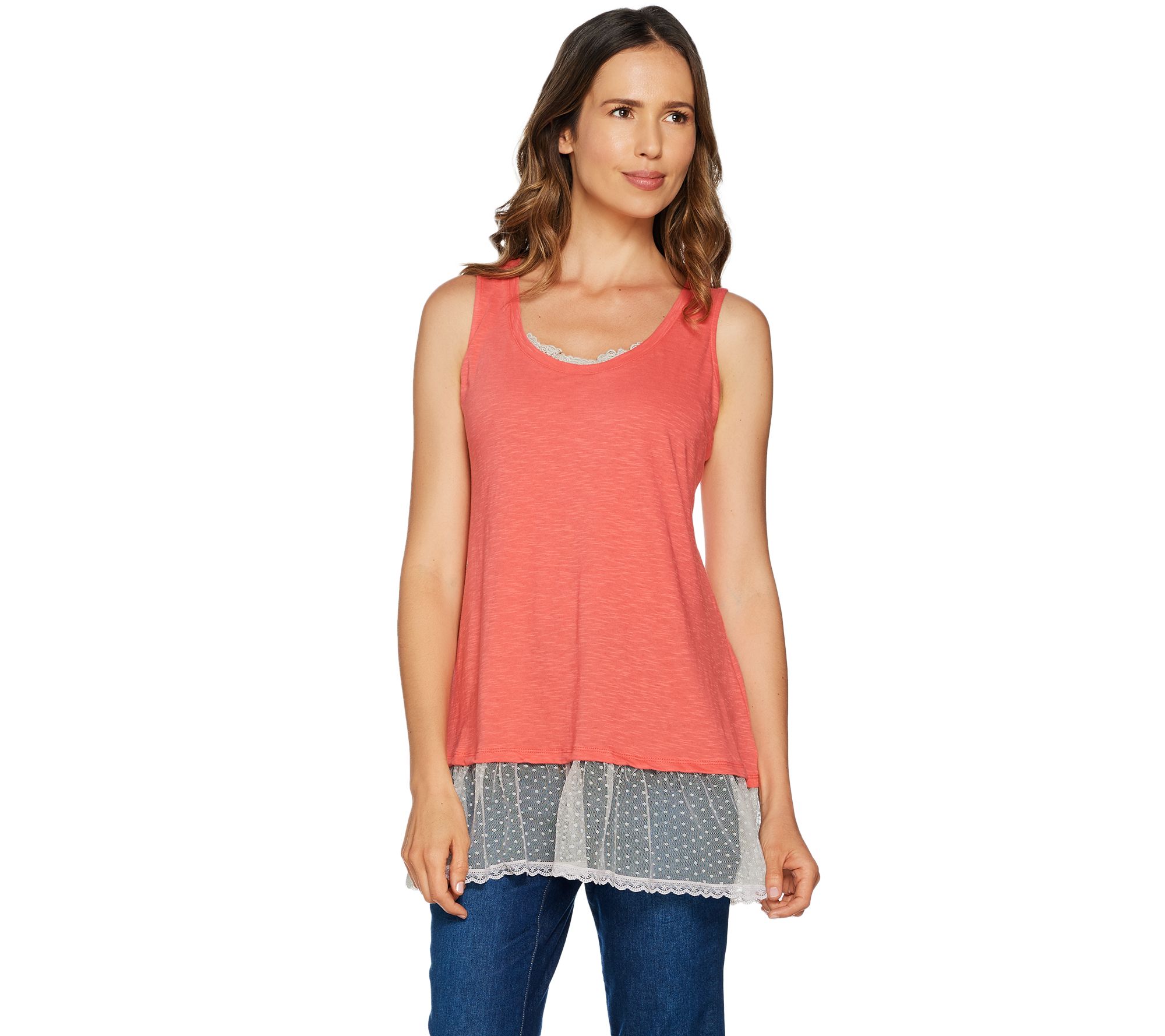 Lace peeks from the top of this LOGO tank and accents the Swiss dot trimmed hem for a lovely look that can be layered or featured on its own. LOGO by Lori Goldstein.