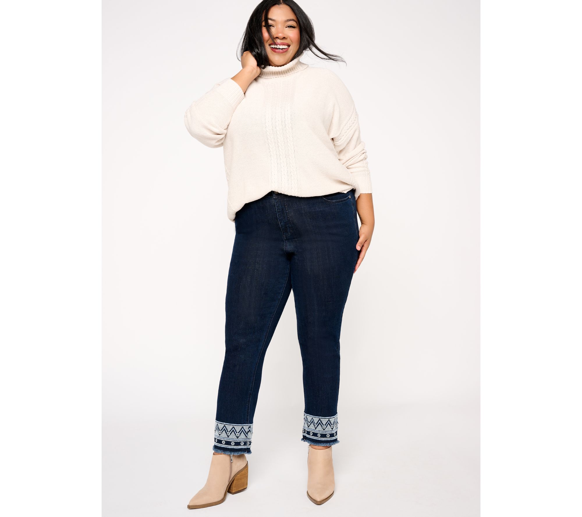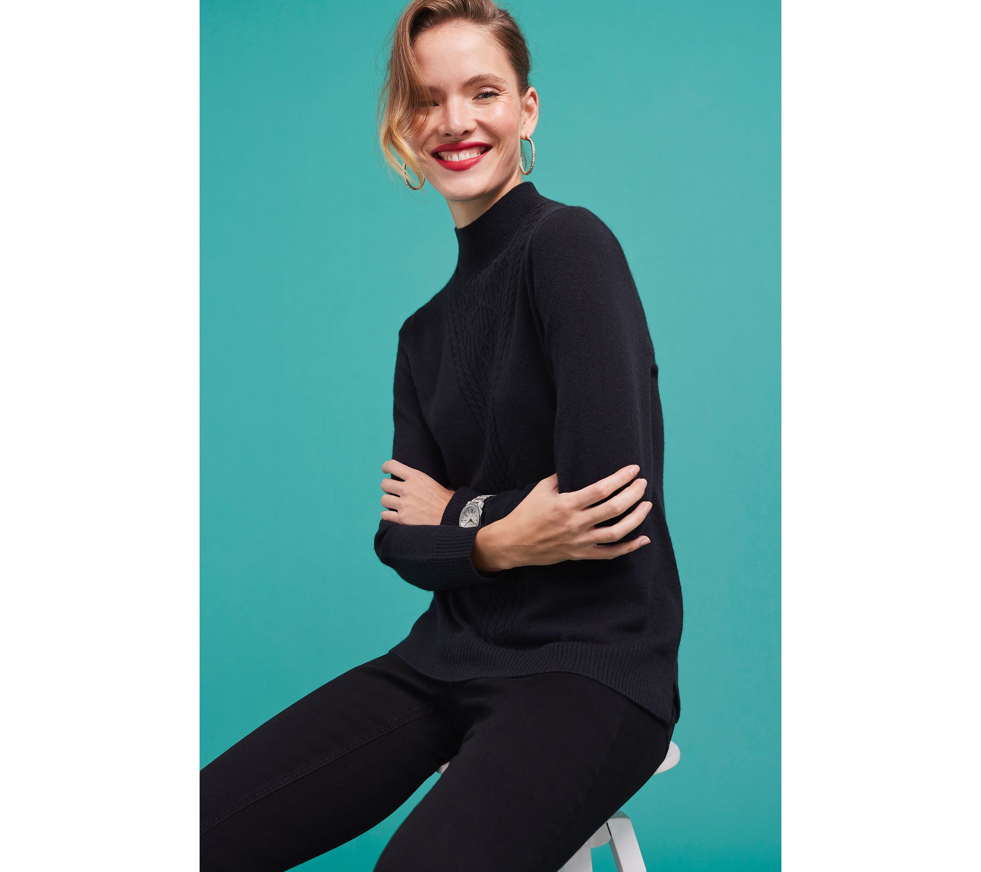 From the standout cable stitching to the cozy turtleneck, this sweater exudes laid-back luxury. From Isaac Mizrahi Live!