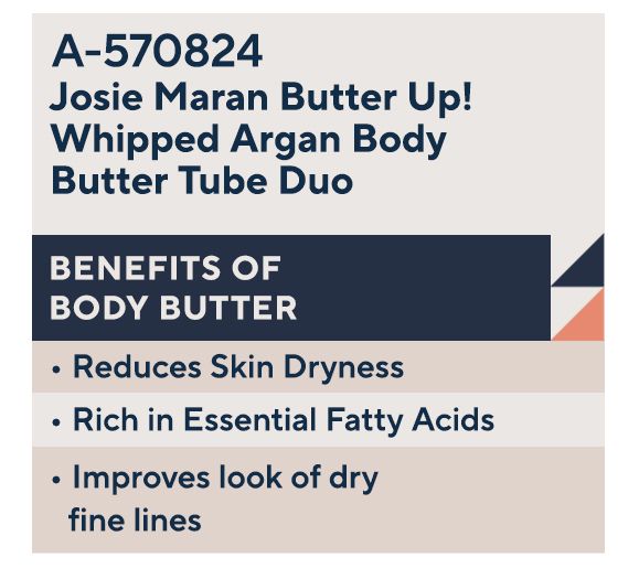 Double the Argan fun in this Whipped Body Butter tube set from Josie Maran, featuring two sizes in a refreshing Cucumber Melon scent. Replenish, condition, and revitalize your skin with the nourishing power of Josie's signature Argan Oil whipped to buttery perfection. Whipped Argan Oil Body Butter is formulated with antioxidants that help nourish and revive skin as you indulge your senses with a subtle aroma. Formulated with nourishing Argan oil, this moisturizing body cream instantly softens and revives skin with a lightweight, velvety texture that quickly absorbs without feeling heavy or greasy.