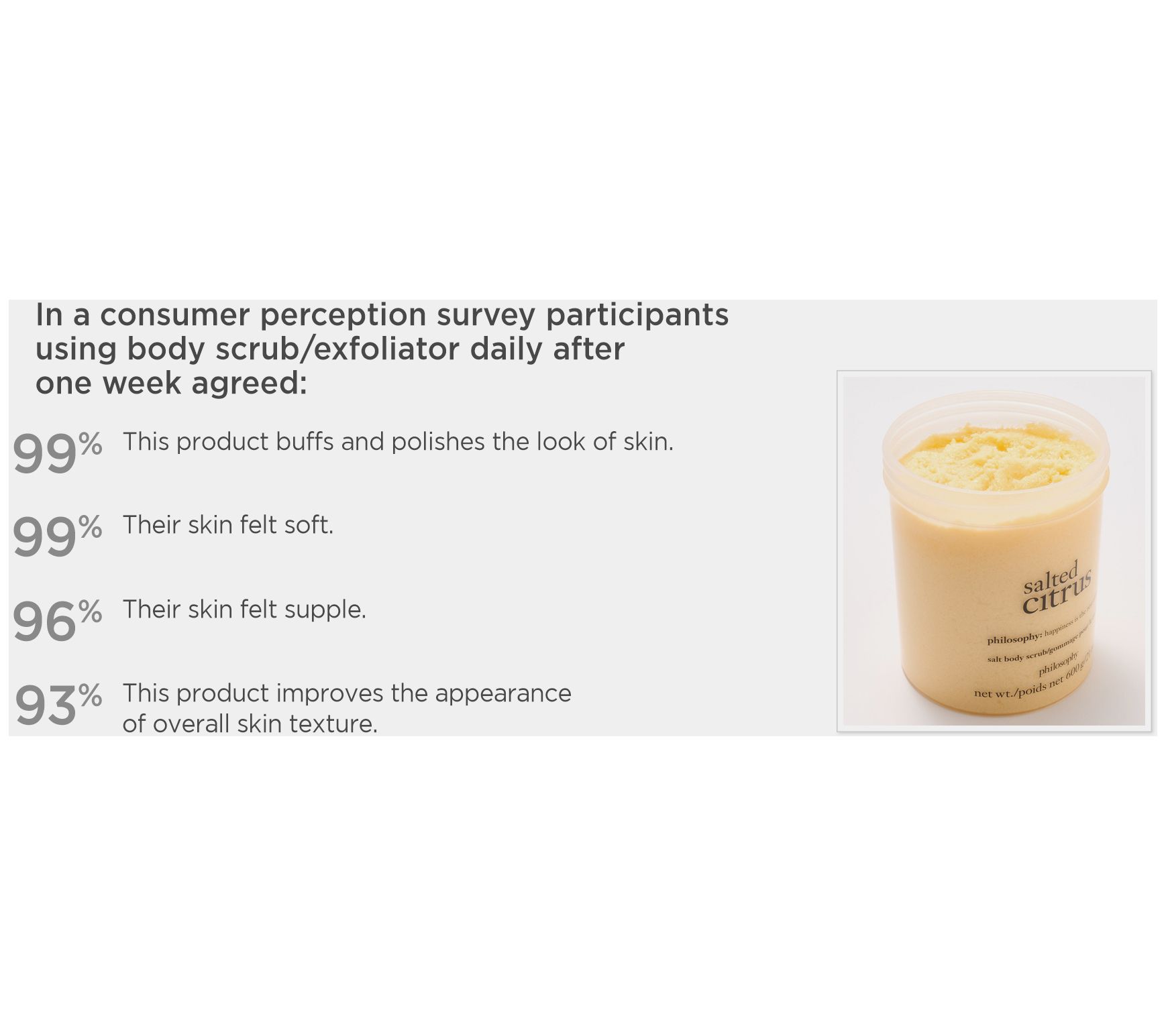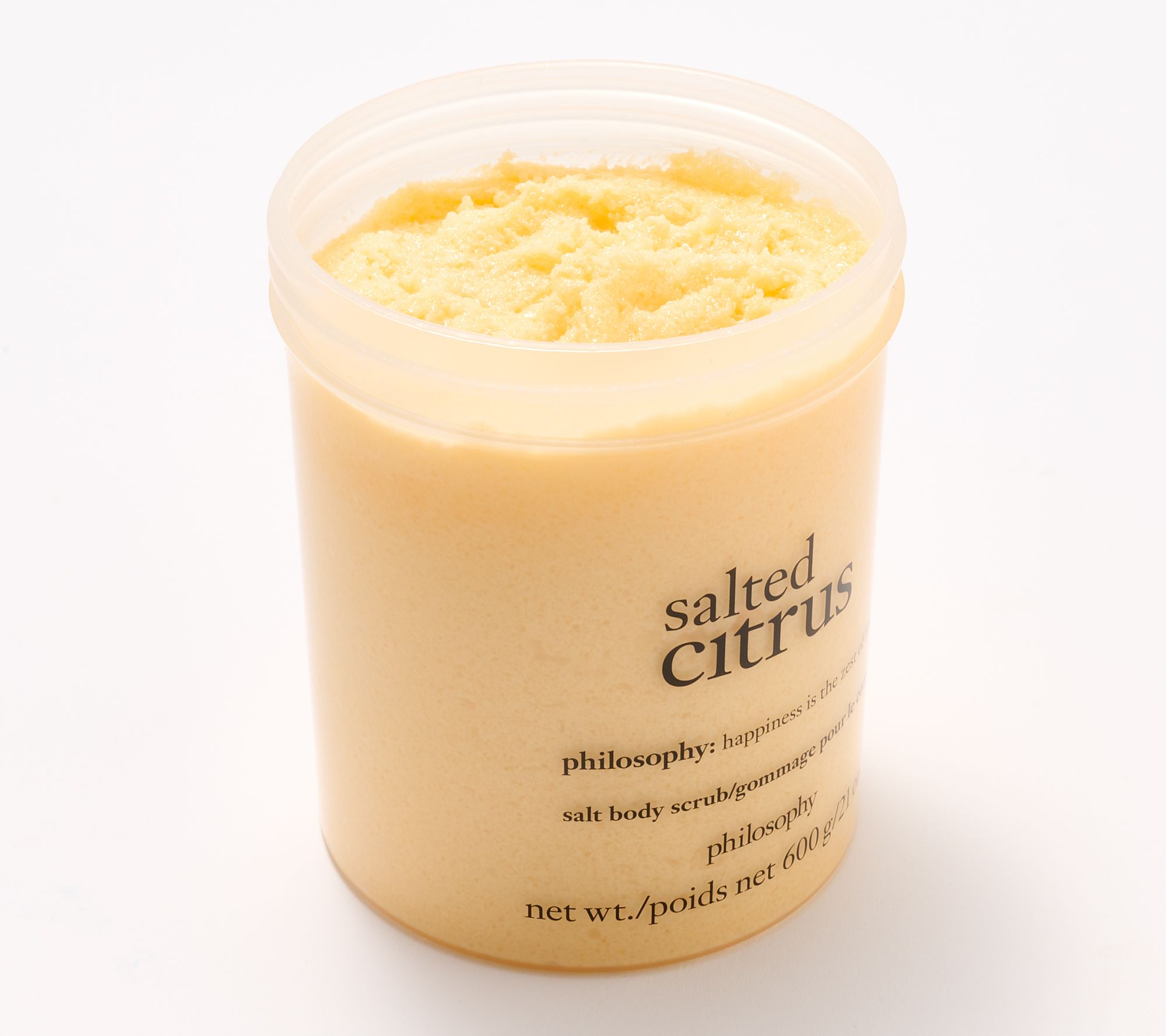 The perfect way to polish skin, this philosophy sea salt body scrub blends sea salt in a cushioned glycerin base to provide polishing action and simultaneously delivering a wash of hydration. The unique formula exfoliates away dry skin, leaving your skin soft and noticeably more smooth.