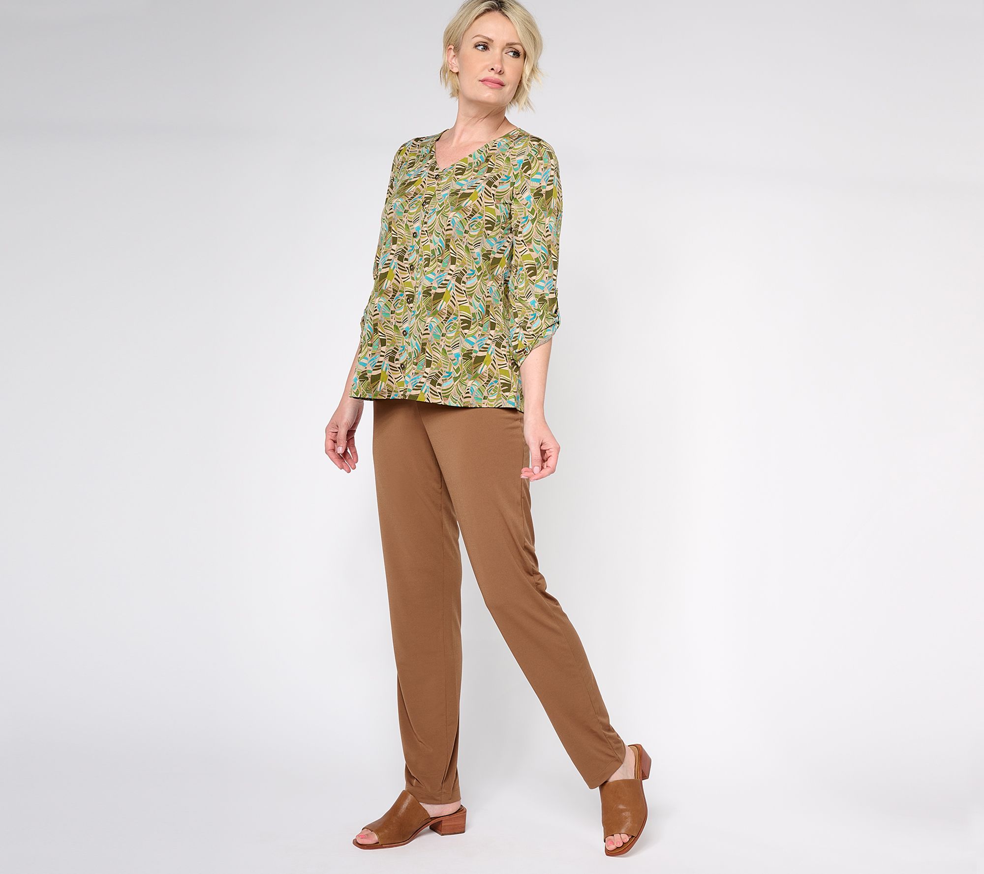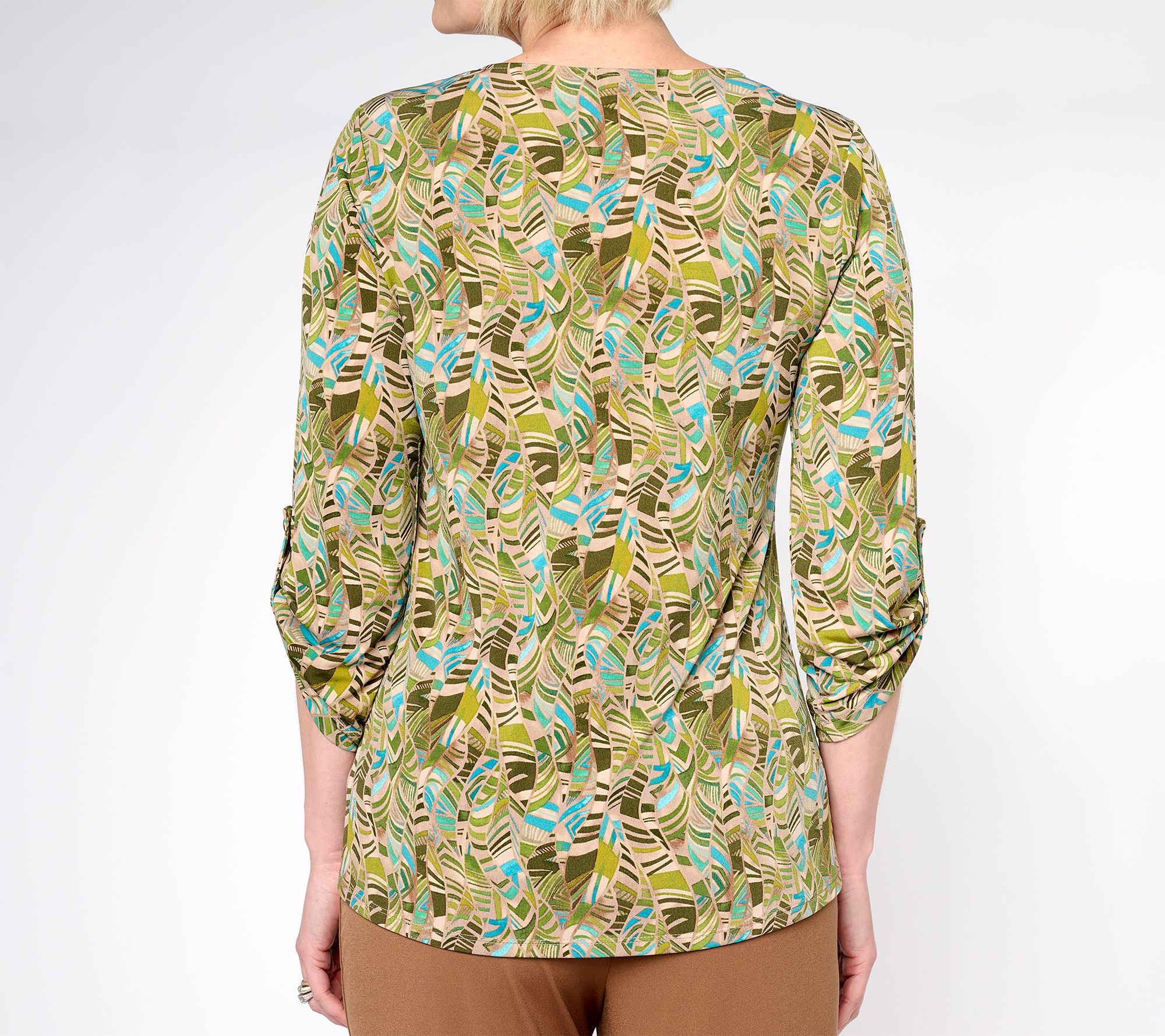A lovely print and a V-neckline add to the beauty of this Liquid Knit top. The 3/4-length sleeves are fashioned with tabs for a stylish finishing touch. From Susan Graver.