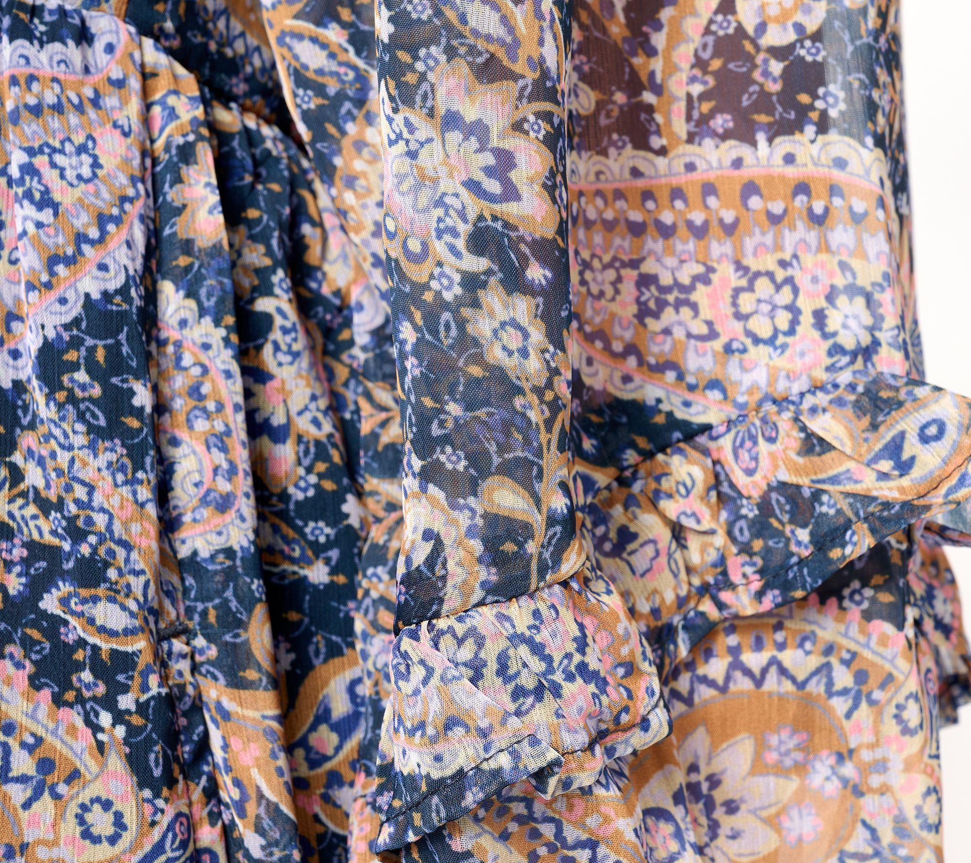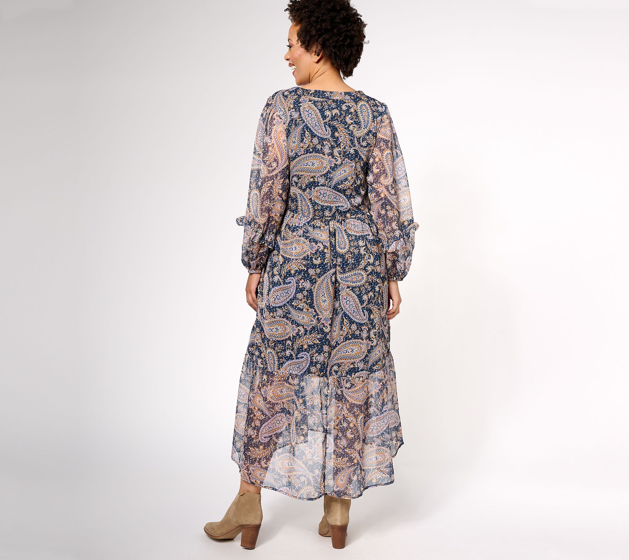 The epitome of femininity, this printed chiffon dress is beautifully fashioned with long gathered sleeves and a tiered sweeping hem. From Destination 365.