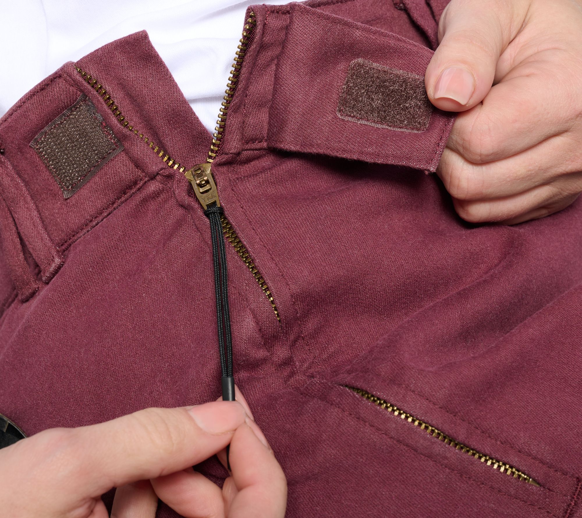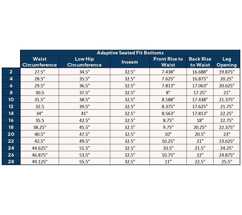 • Adaptive Features: seated fit, three pull loops inside waistband, metal zipper set in wearer's right top side