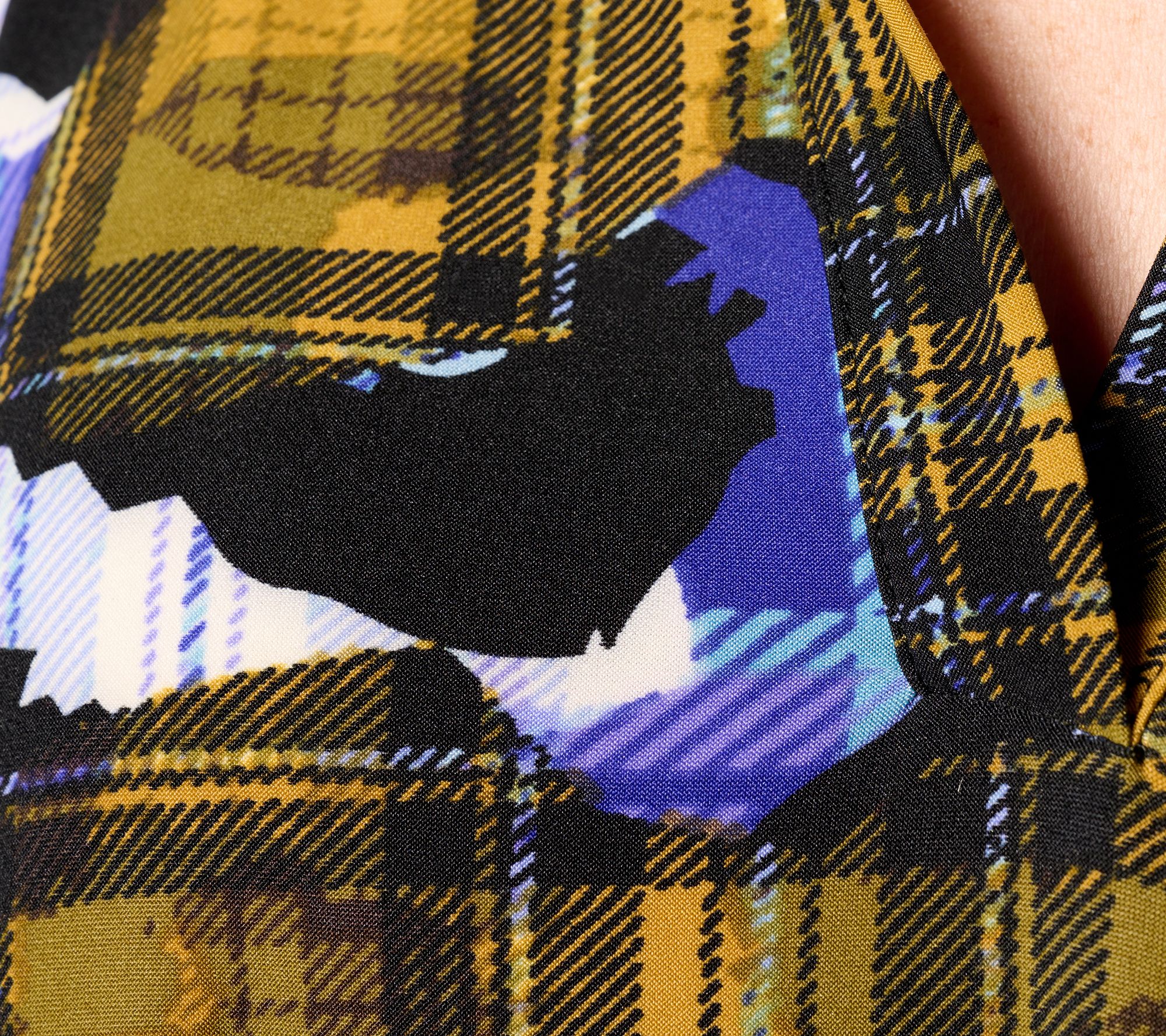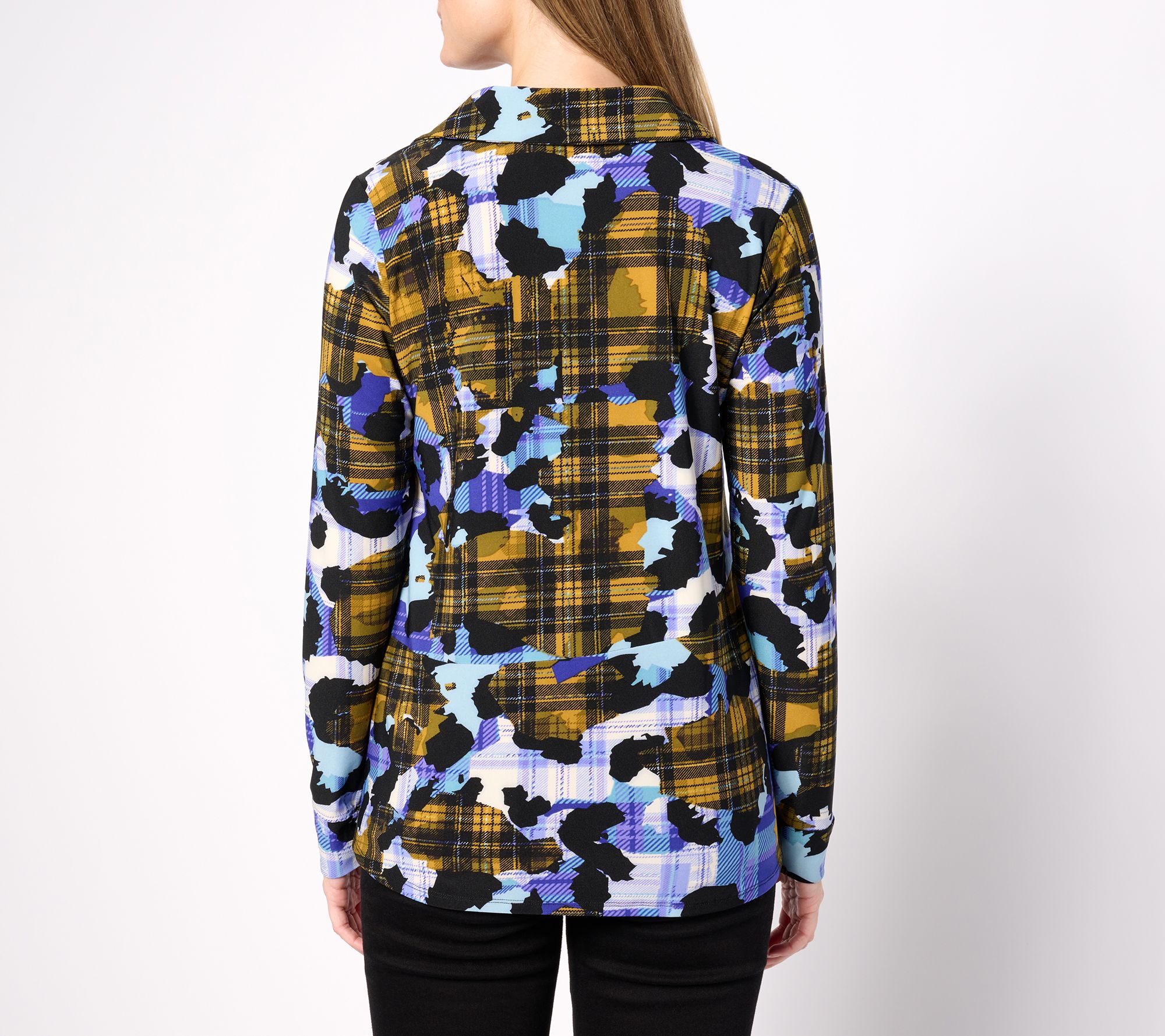 Features: collared, printed, asymmetric hem, long sleeves