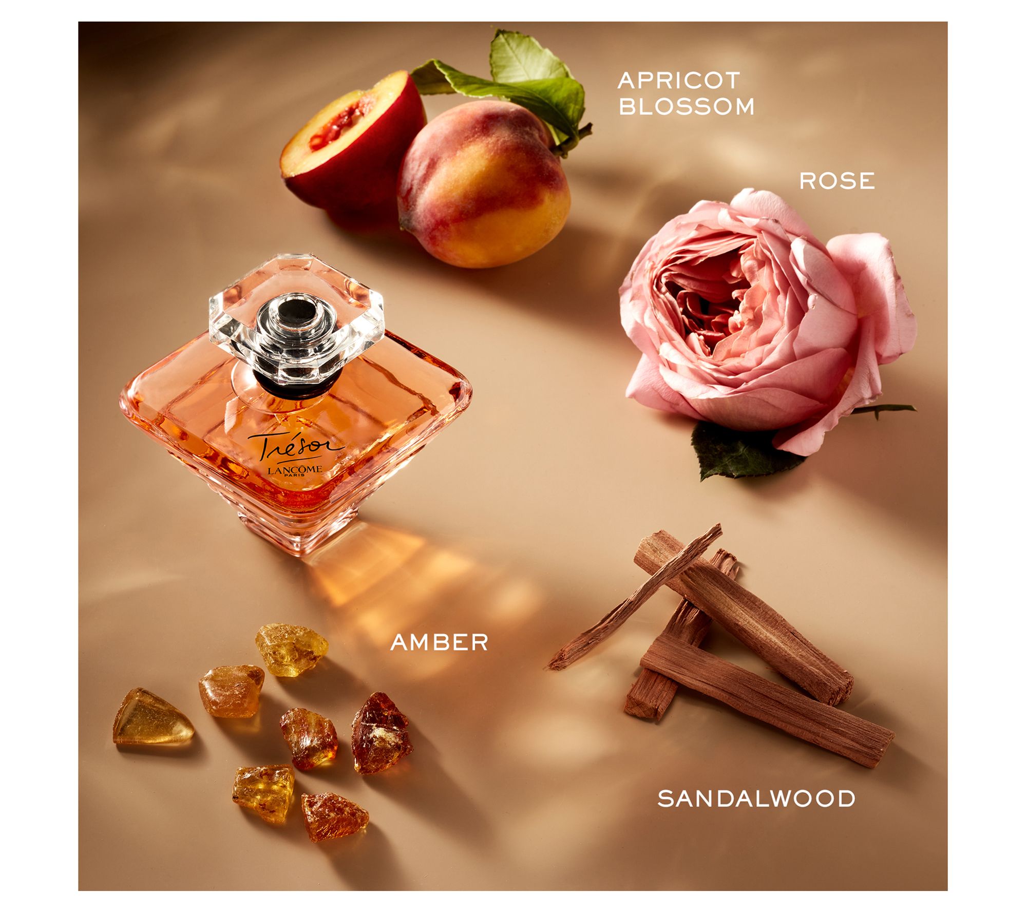 The sensual fragrance includes top notes of apricot blossom and rose, mid notes of lilac, iris, and peach; and base notes of amber, sandalwood, musk, and vanilla.