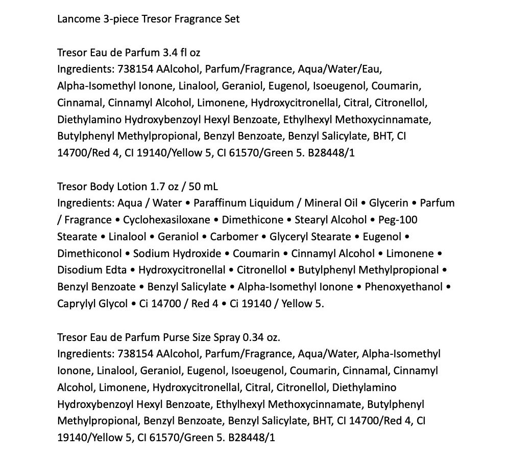Indulge in three versions of the romantic Lancome Tresor fragrance: an eau de parfum to keep on your dresser, a purse-size spray to keep in your handbag, and a body lotion so you can layer the head-turning scent. The elegance of rose, muguet. and lilac, the sparkle of apricot blossom; a glorious golden coral, so every drop opens like petals on the skin.