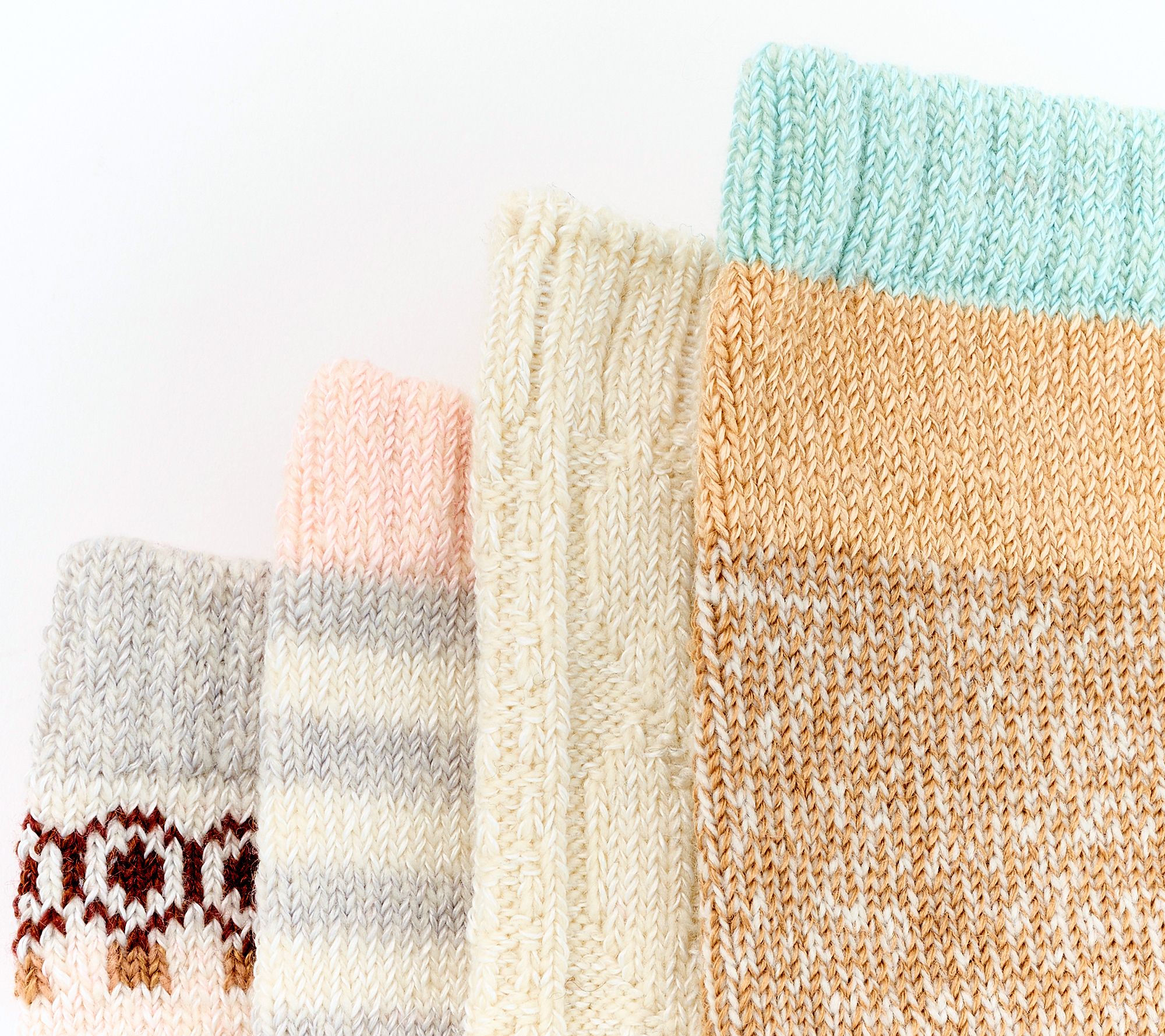 • Content: Sock 1/2 58% polyester/11% nylon/11% rayon/10% cashmere/9% acrylic/1% spandex; Sock 3 62% polyester/11% nylon/10% rayon/9% cashmere/7% acrylic/1% spandex; Sock 4 60% polyester/11% rayon/10% cashmere/10% nylon/8% acrylic/1% spandex, exclusive of elastic