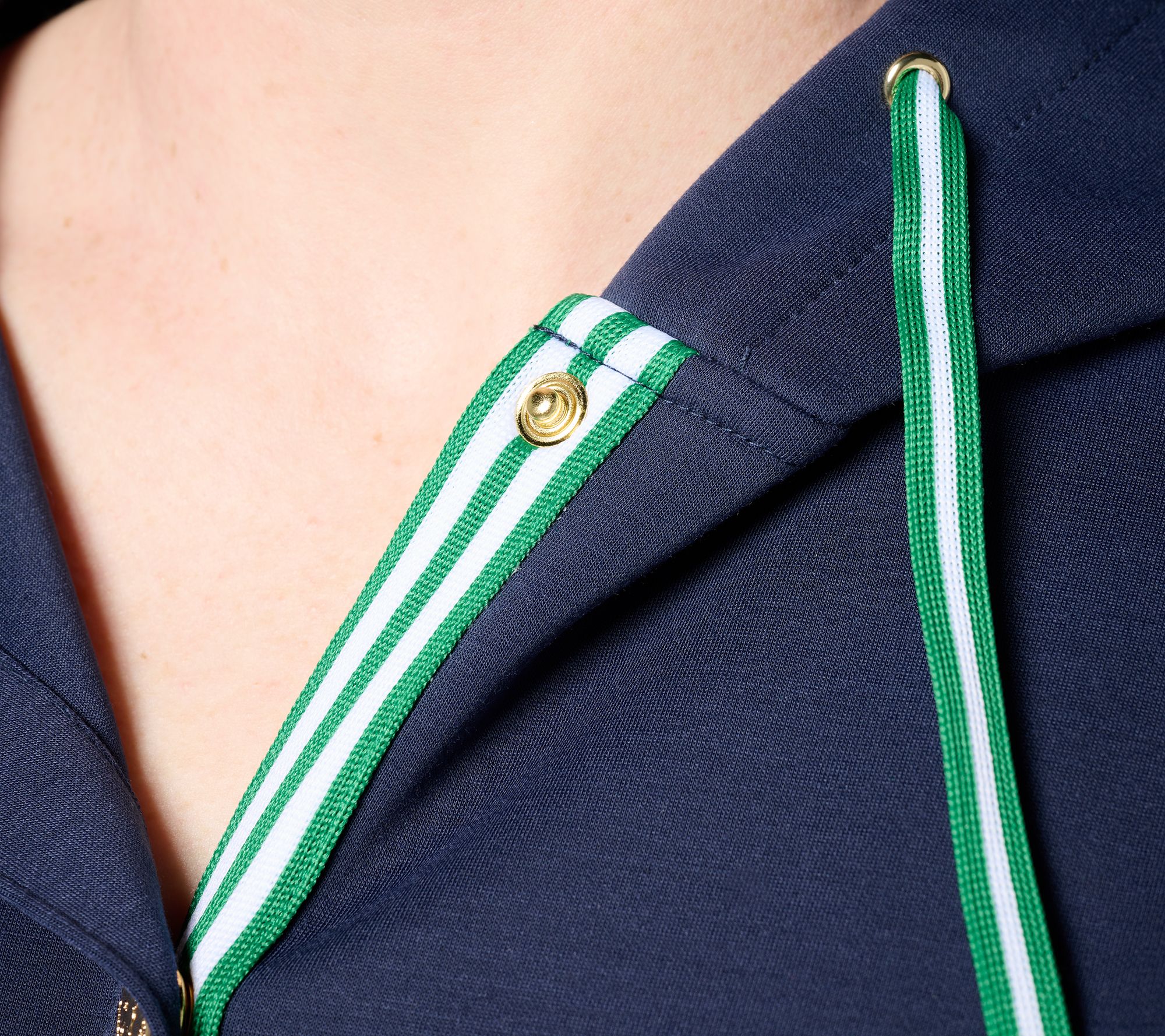 Features: snap front, hood with bi-color trim and draw cord, center-front placket with functional snap button closure, forward side seam with bi-color trim, on-seam pockets, straight hem with side slits