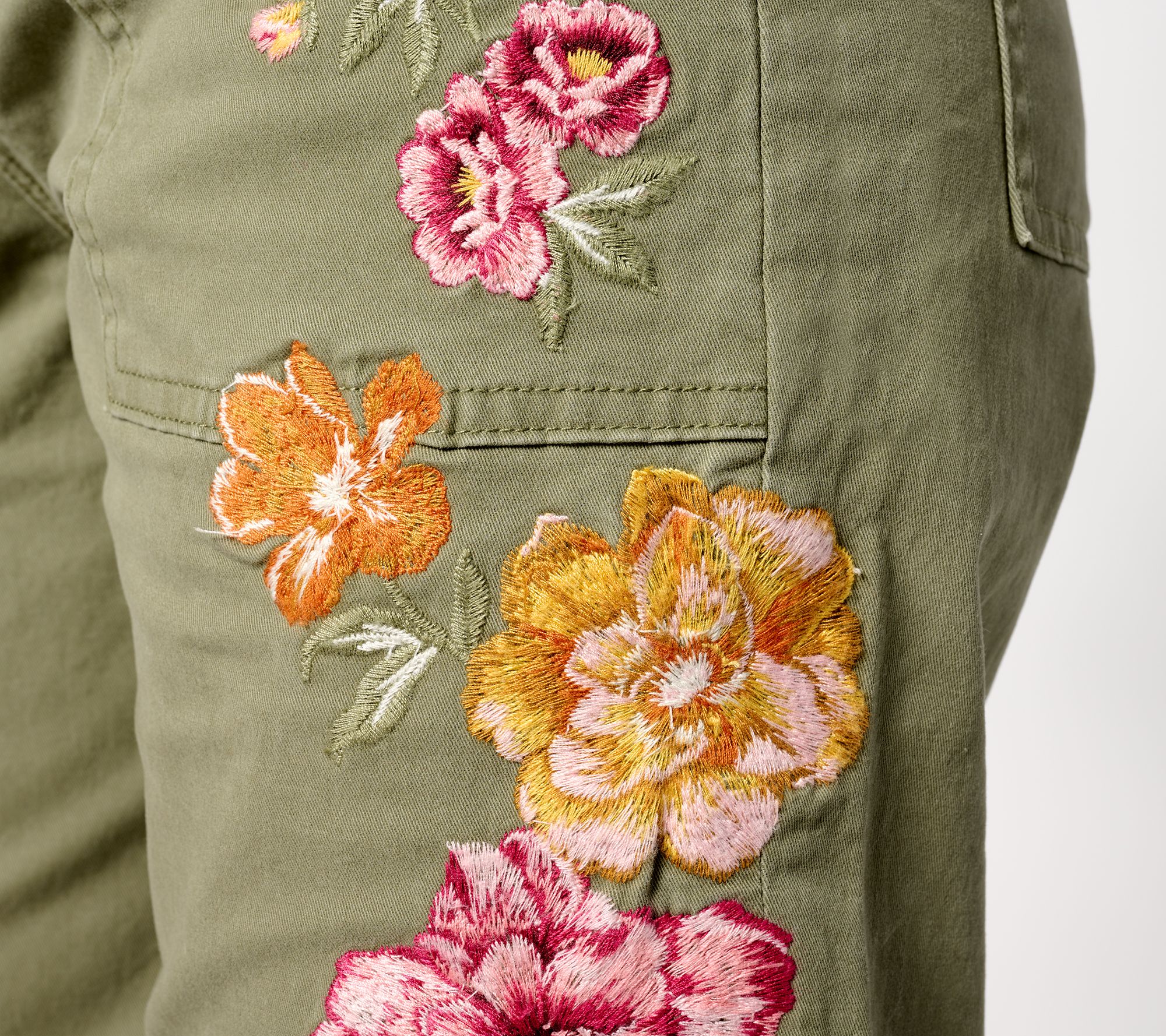 Stitch a statement look together with these relaxed-fit boyfriend crops. Fun floral embroidery customizes these utility-style pants with your own brand of personal flair. From Driftwood Jeans.
