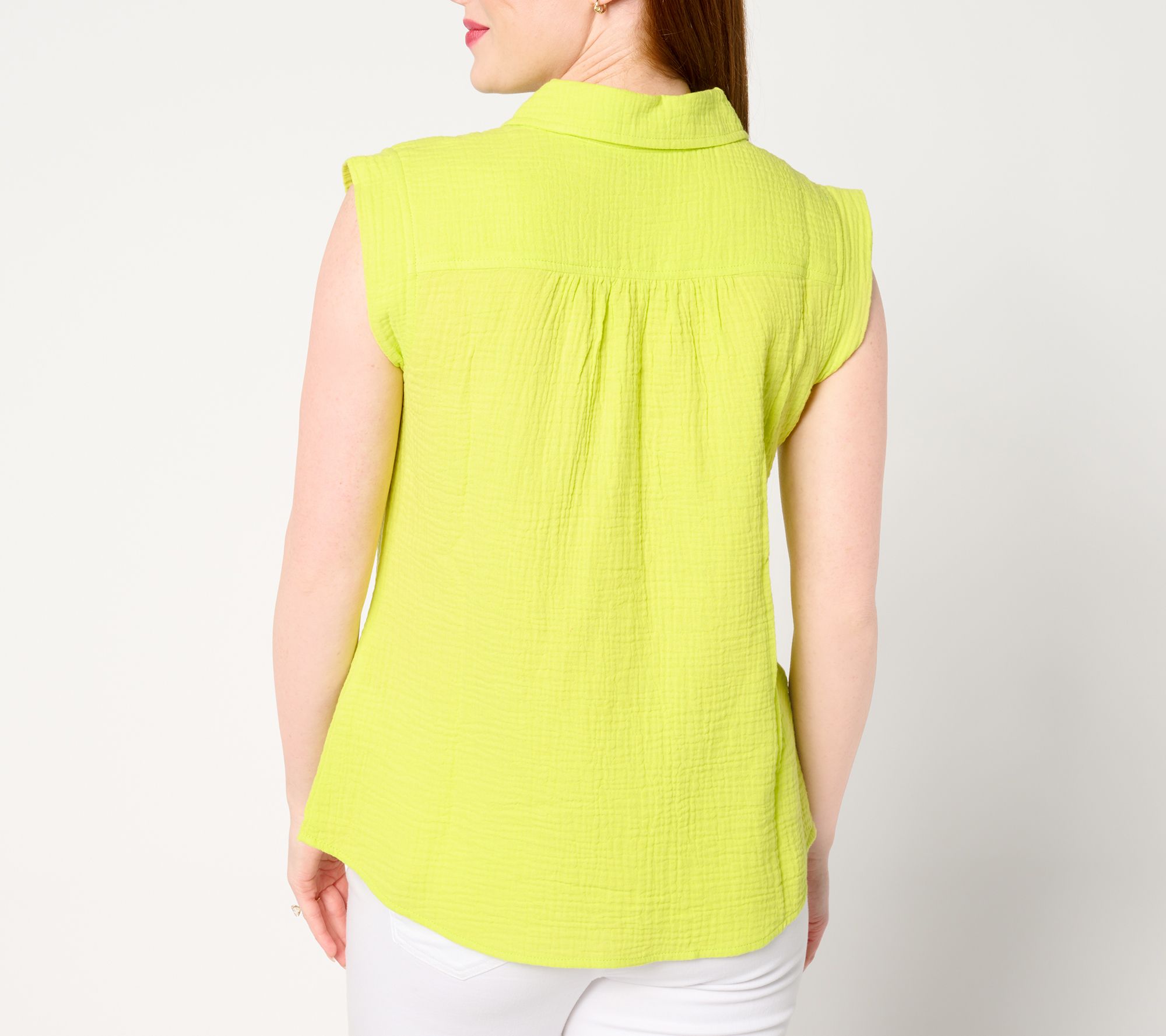 Headed to the beach for a cool-down? Don't forget to pack this boardwalk-to-bistro sleevless shirt for waterless activities. Headed into the office on a hot day? This all-cotton gauze button-up gets you there without breaking a sweat (and keeps you looking cute while doing it!). From Belle by Kim Gravel.