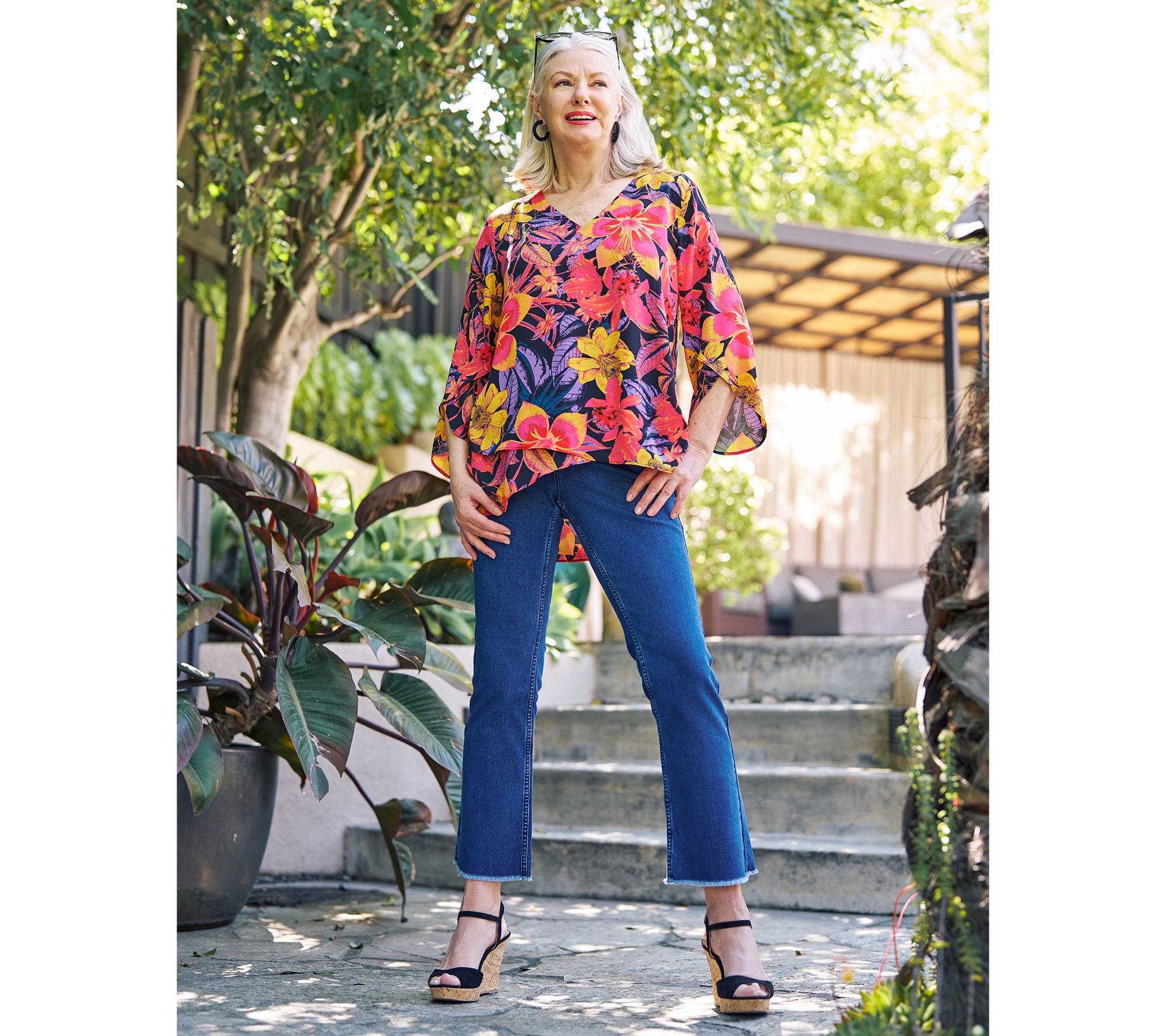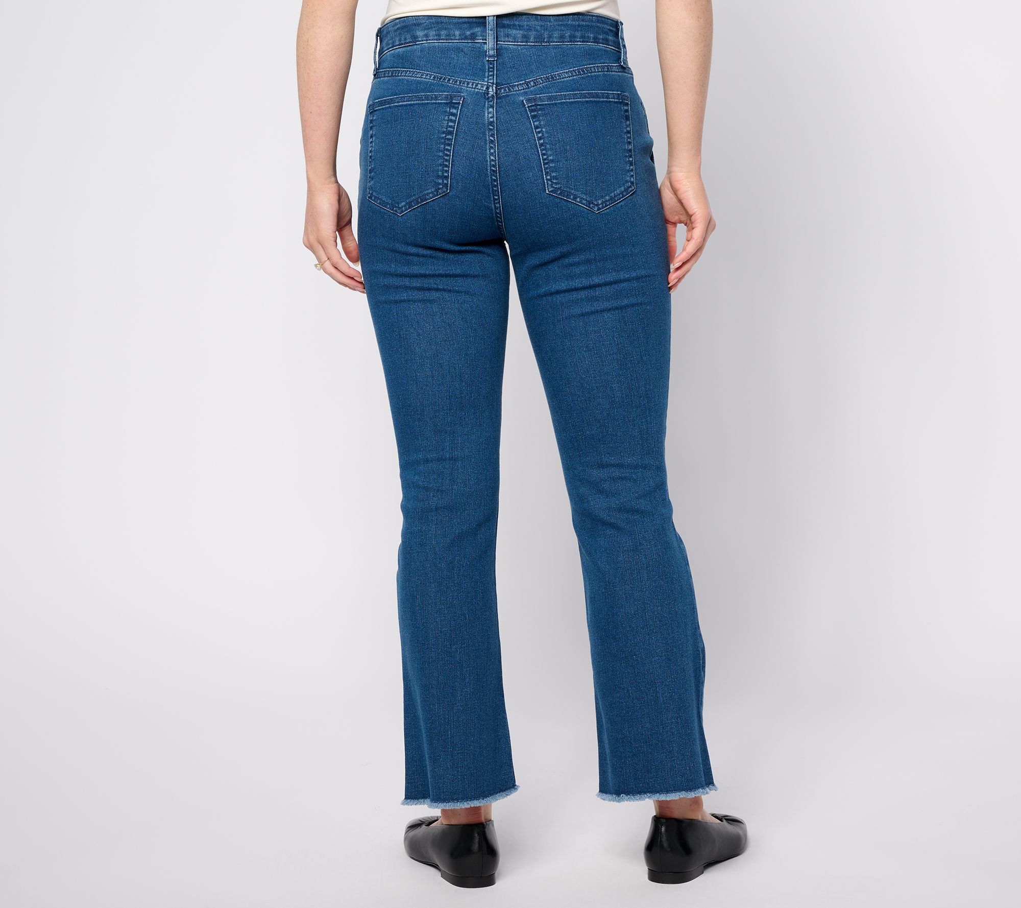 Casual yet chic, these ankle-length jeans boast a boot-cut silhouette that widens from the knee to the leg opening. The frayed hem adds a cool factor to this darling denim. From BEAUTIFUL by Lawrence Zarian.