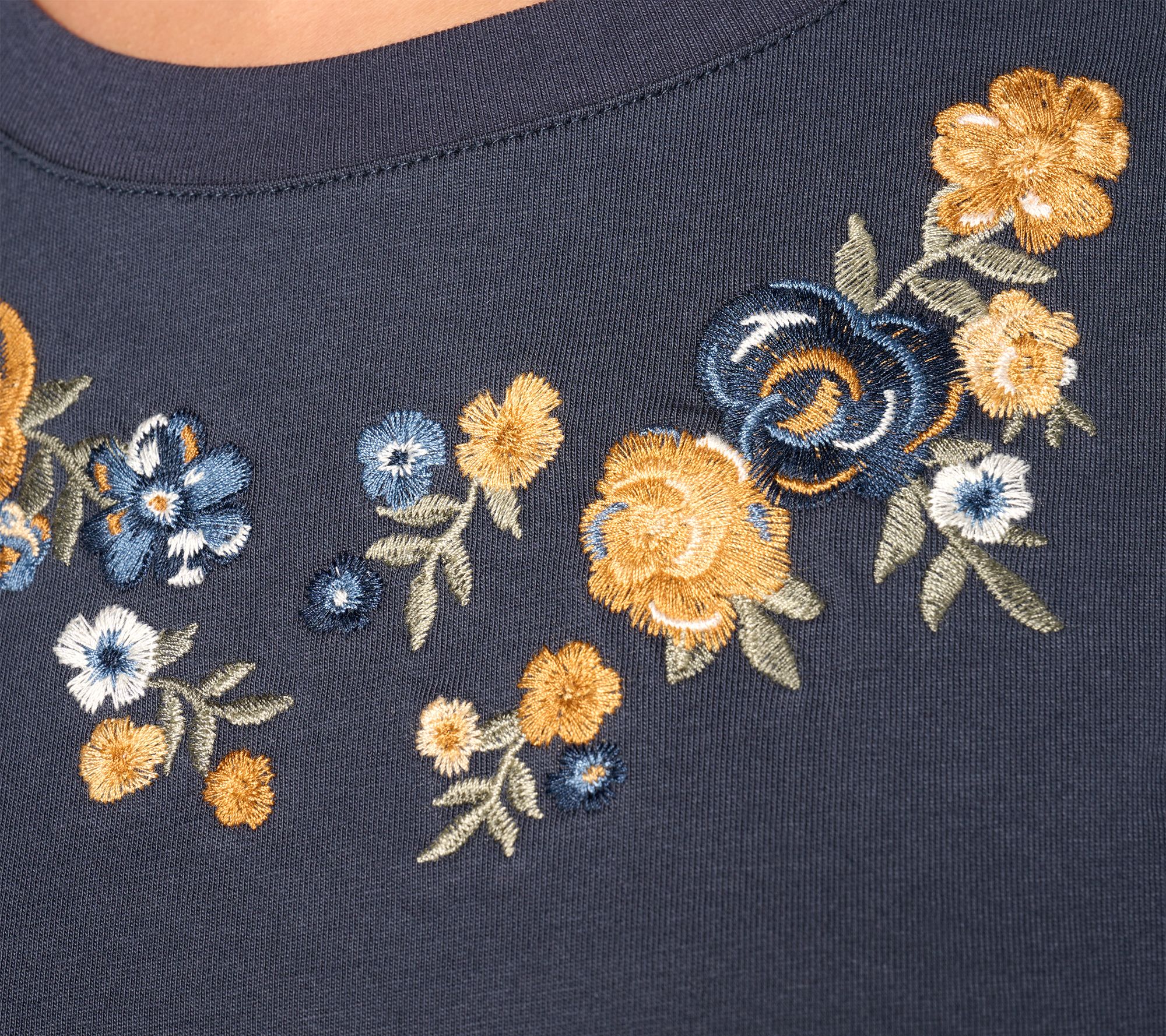 Features: embroidered design, small gathers at shoulder cap, set-in sleeves