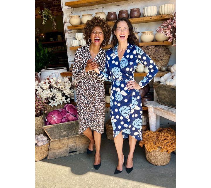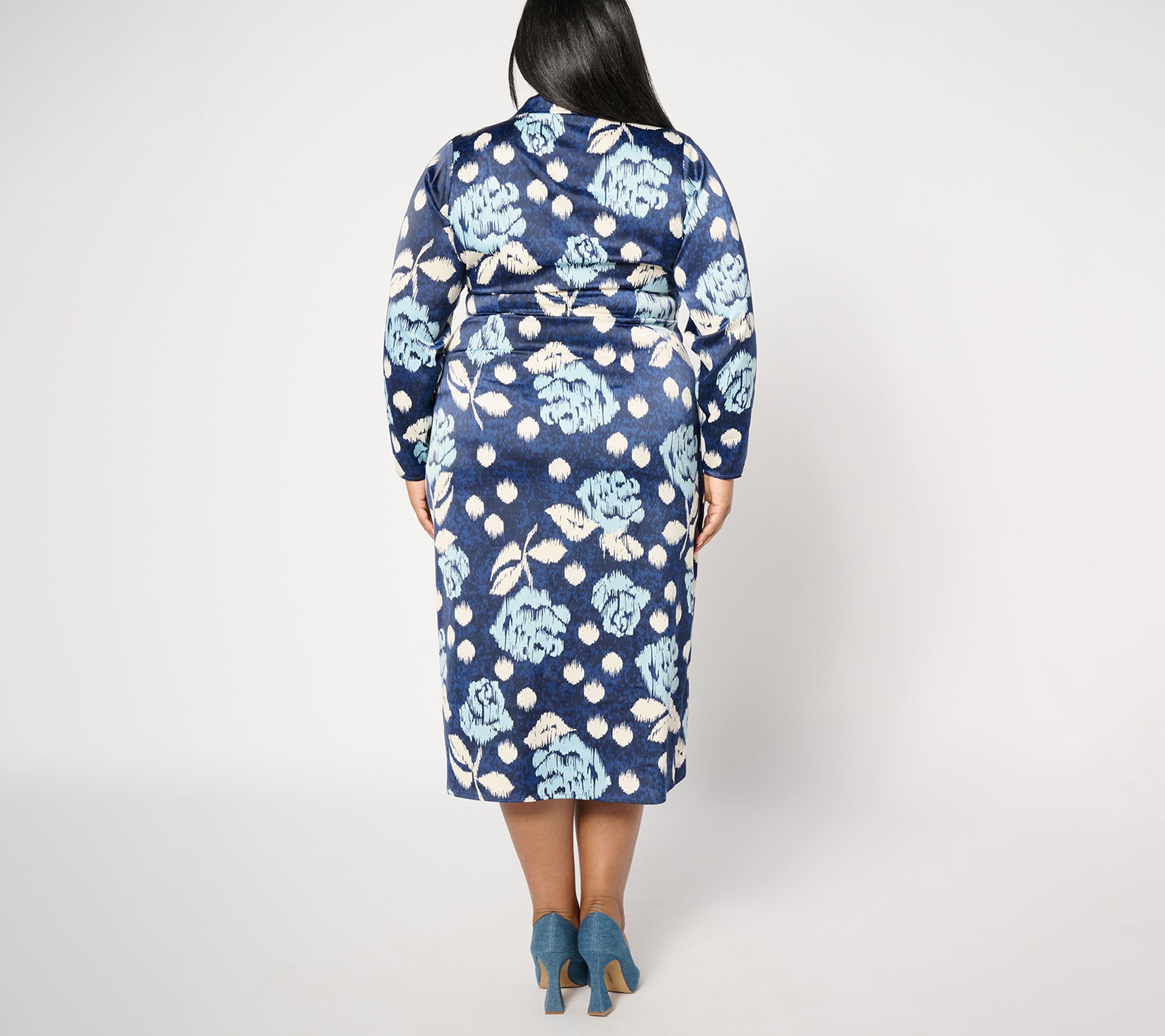 Features: clean-finished front wrap, faux wrap sewn into side seam, light shirring at front midsection, two-ply collar, back darts, double turnback hem