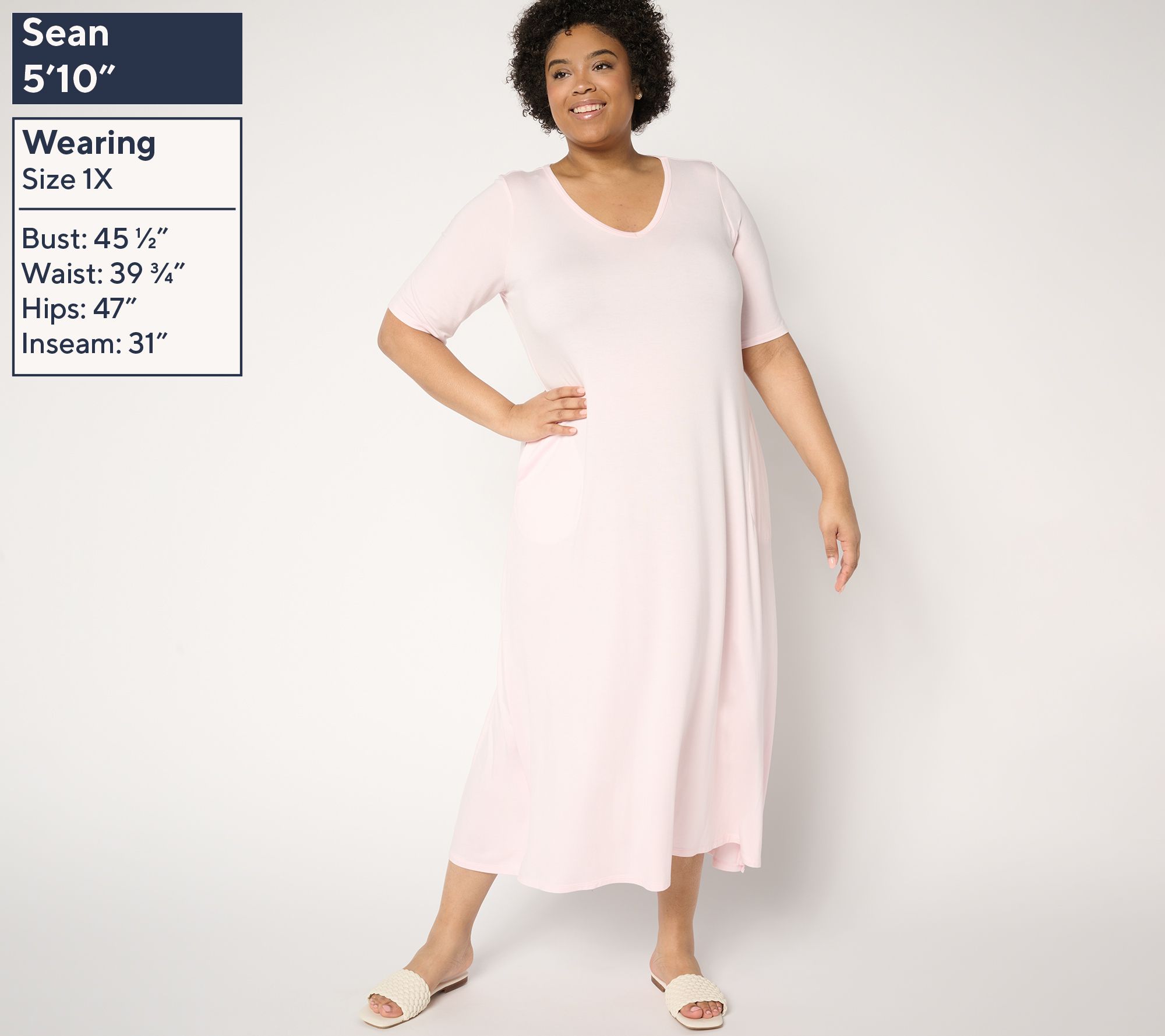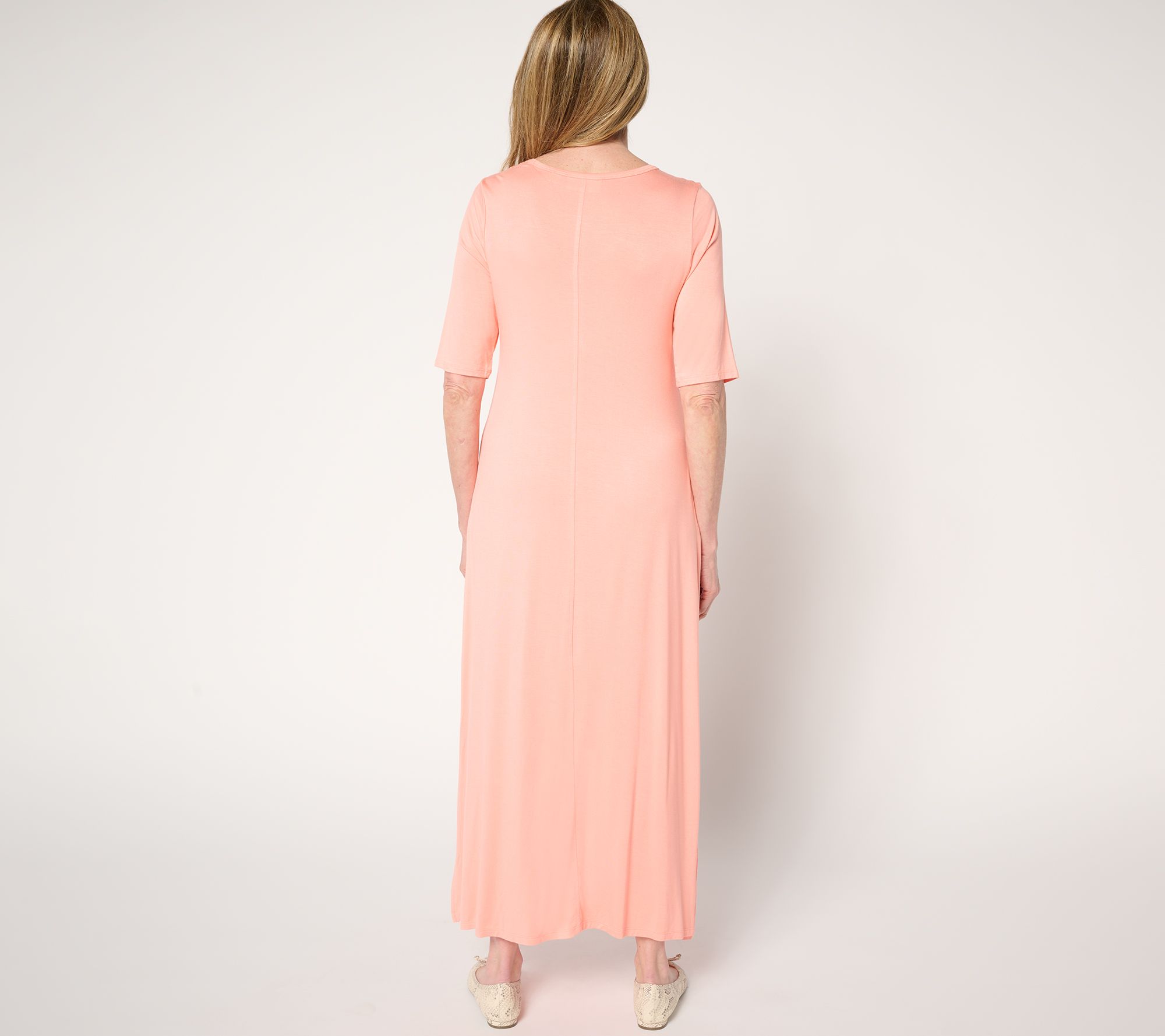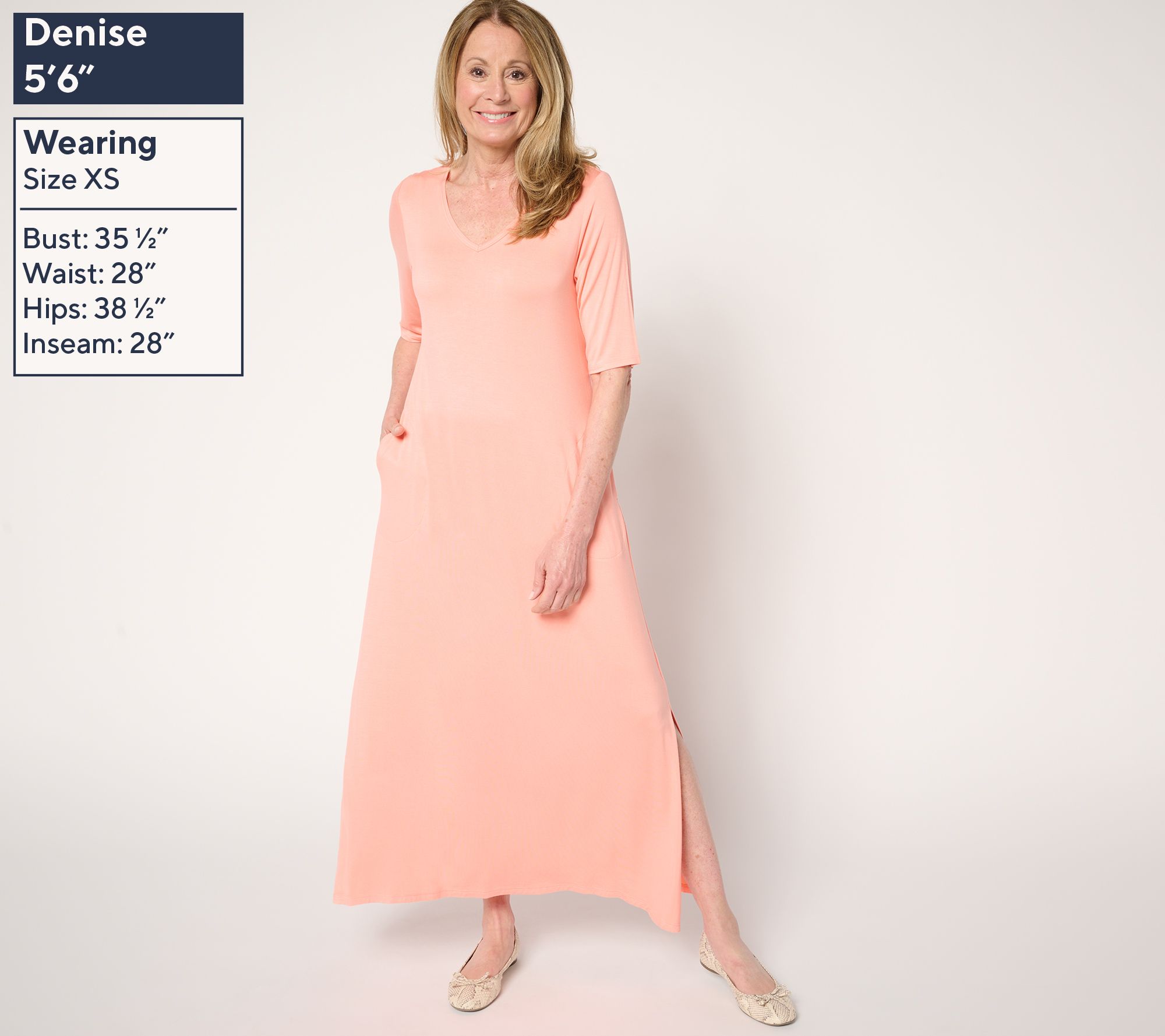 Features: maxi length, V-neckline, elbow-length sleeves, pockets, straight bottom hem, side slits