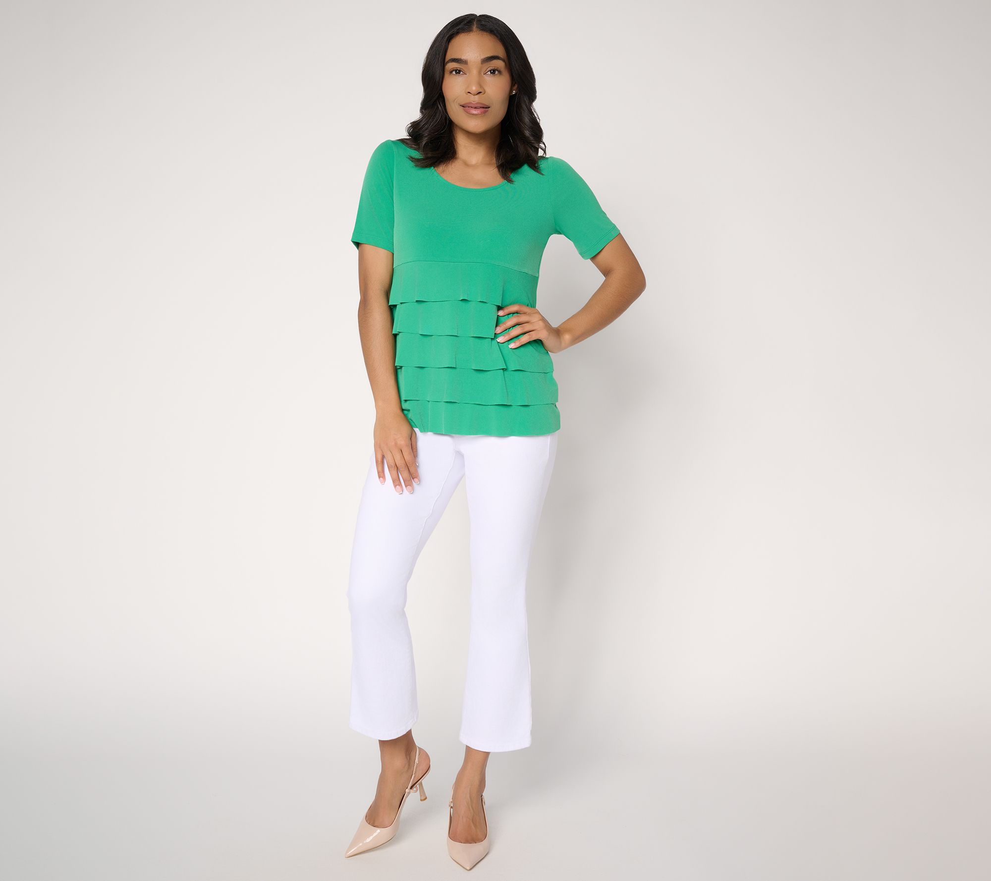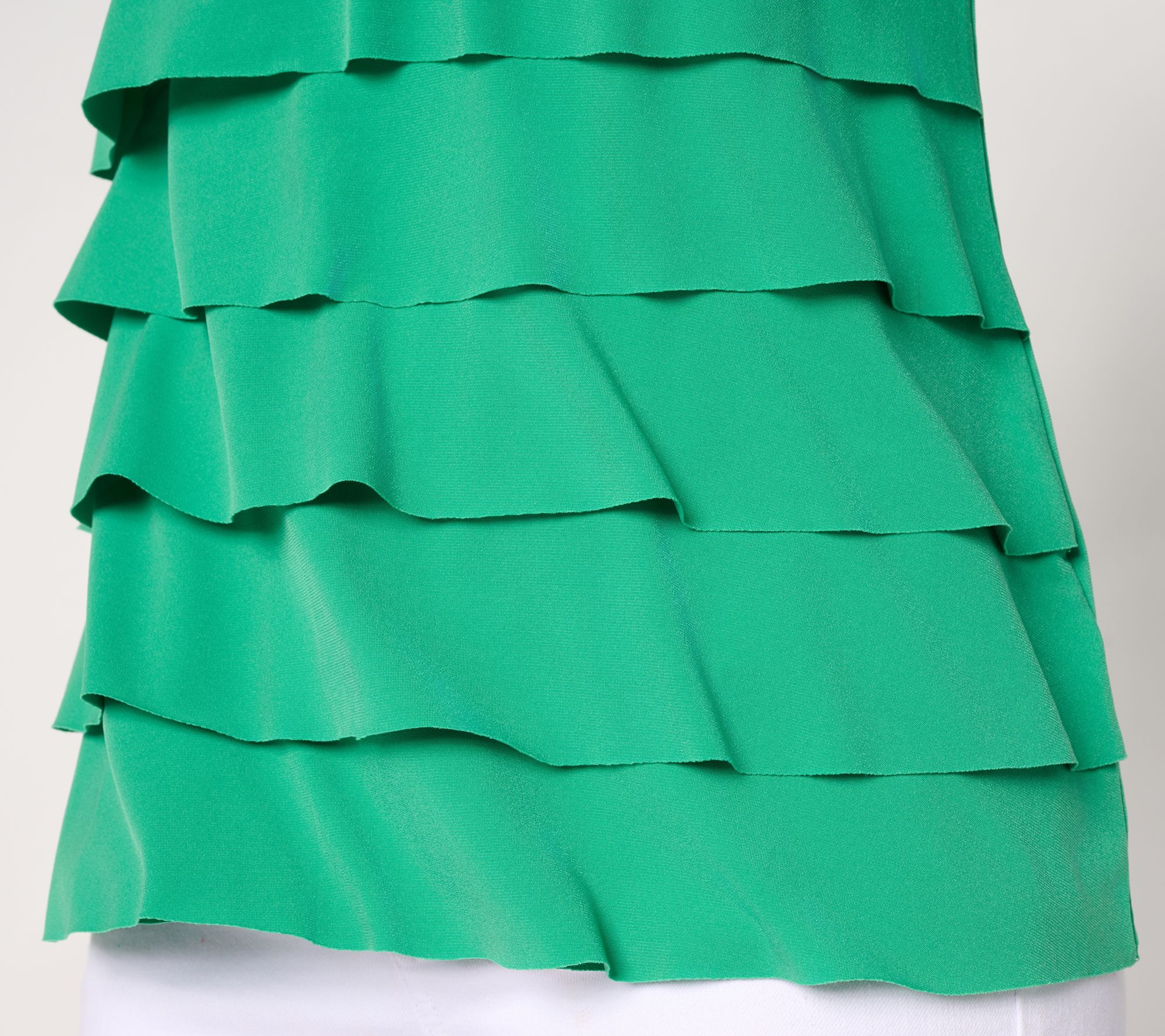 A waterfall of graceful tiers elegantly cascade down this attention-getting Liquid Knit® top from Susan Graver. Flattering, fluid, and so fun, you'll dominate any occasion with main character energy. From Susan Graver.