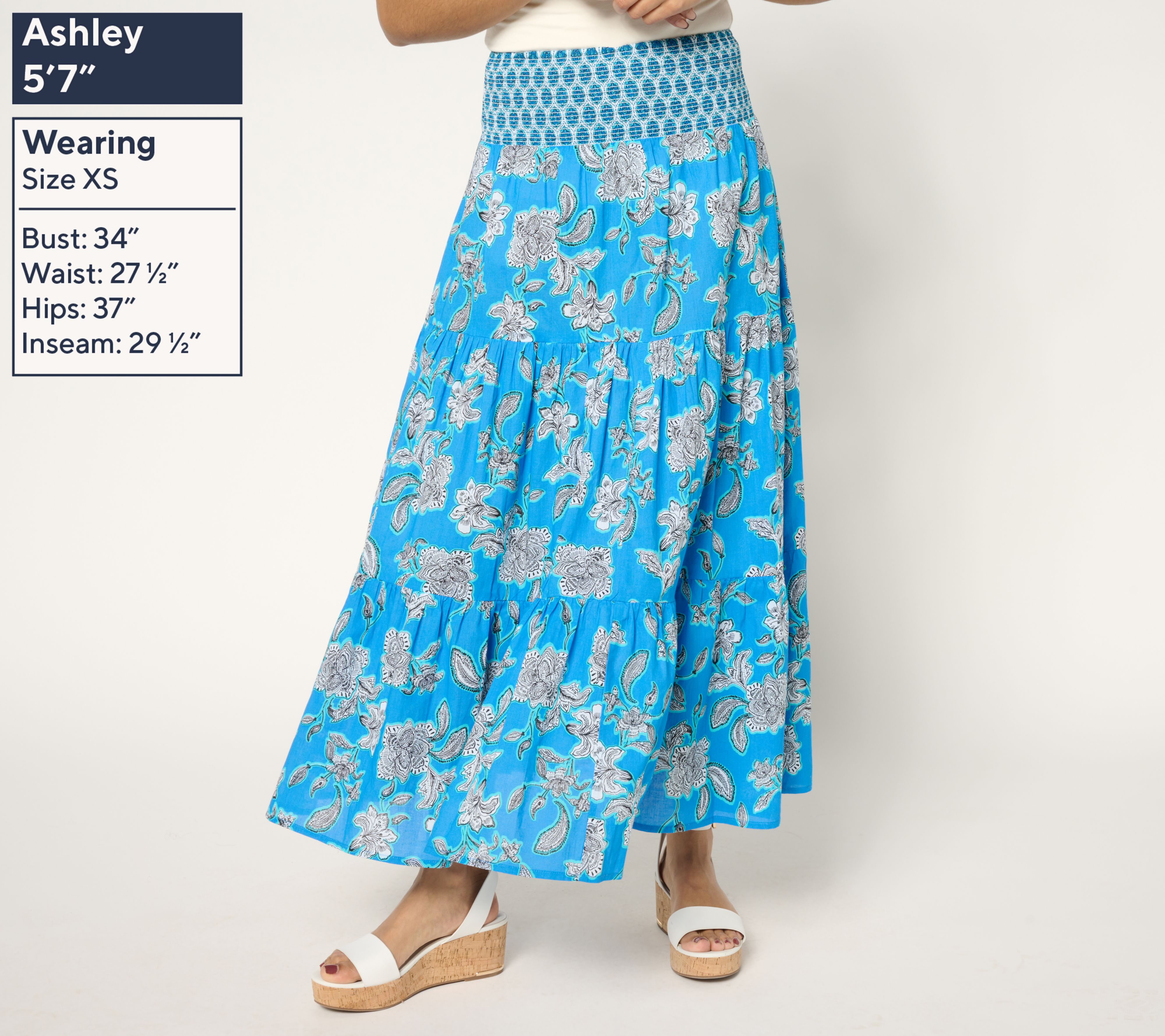 With this printed maxi skirt in 100% cotton in your closet, you always have something comfortable and joyful to slip into for warm-weather parties, vacation dinners, or the kids' recitals. Tuck in your top when you want to show off the pretty (and flattering) smocked waist. From Susan Graver.