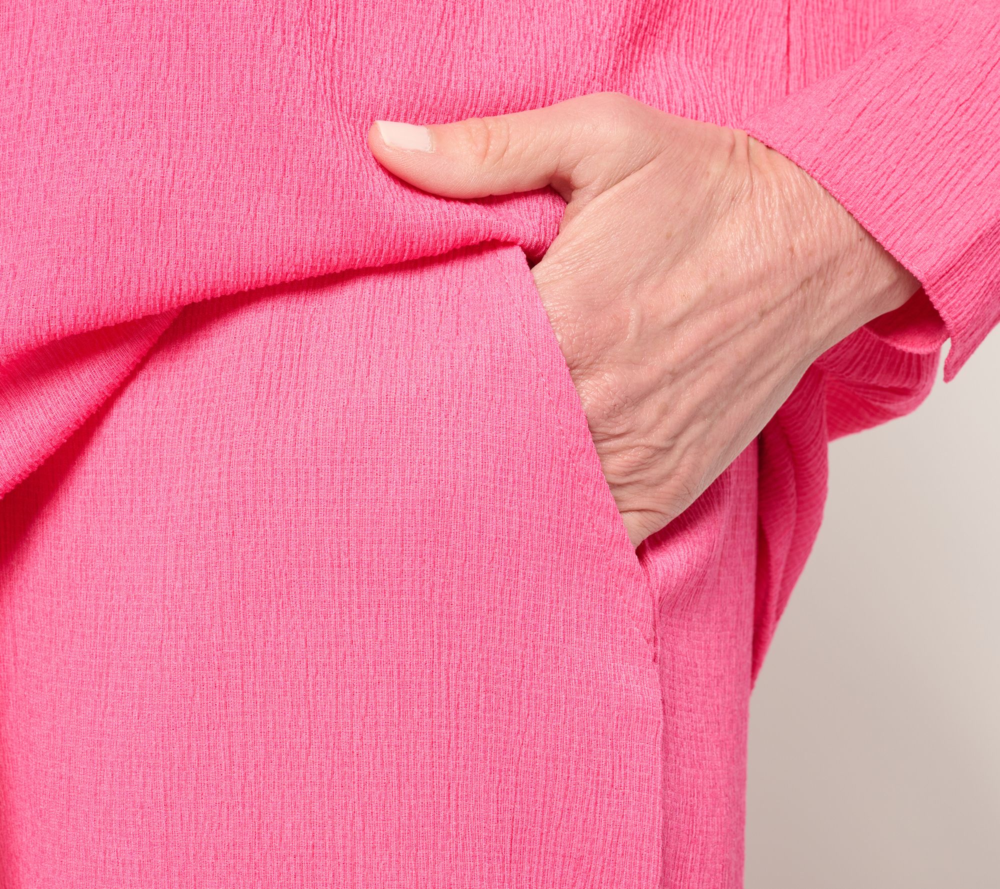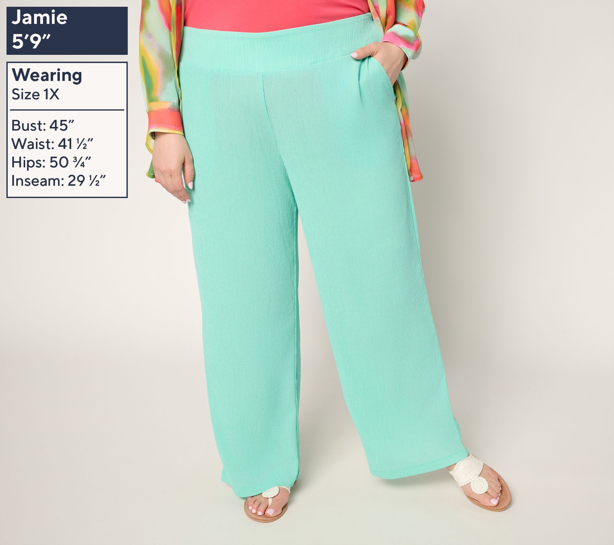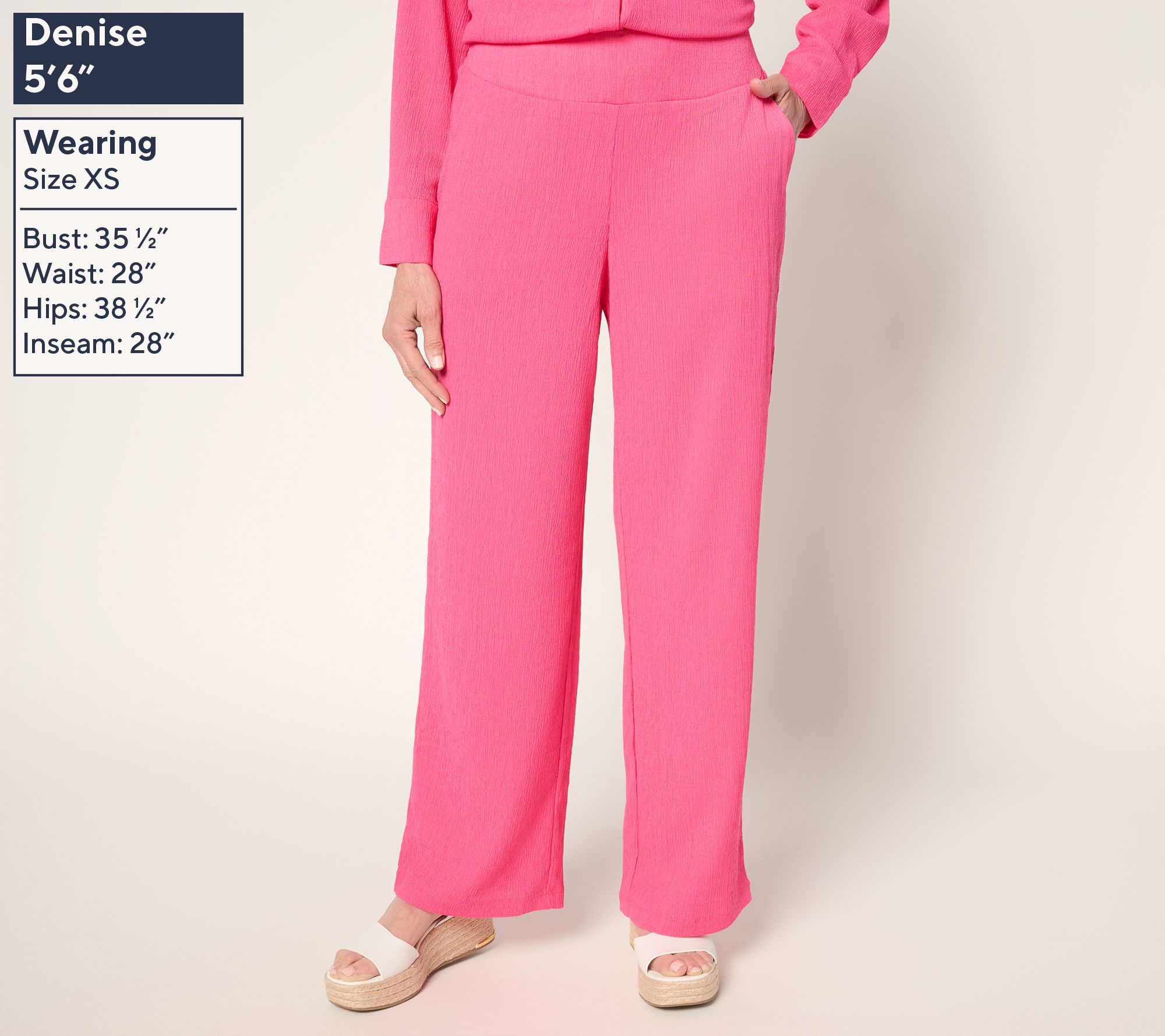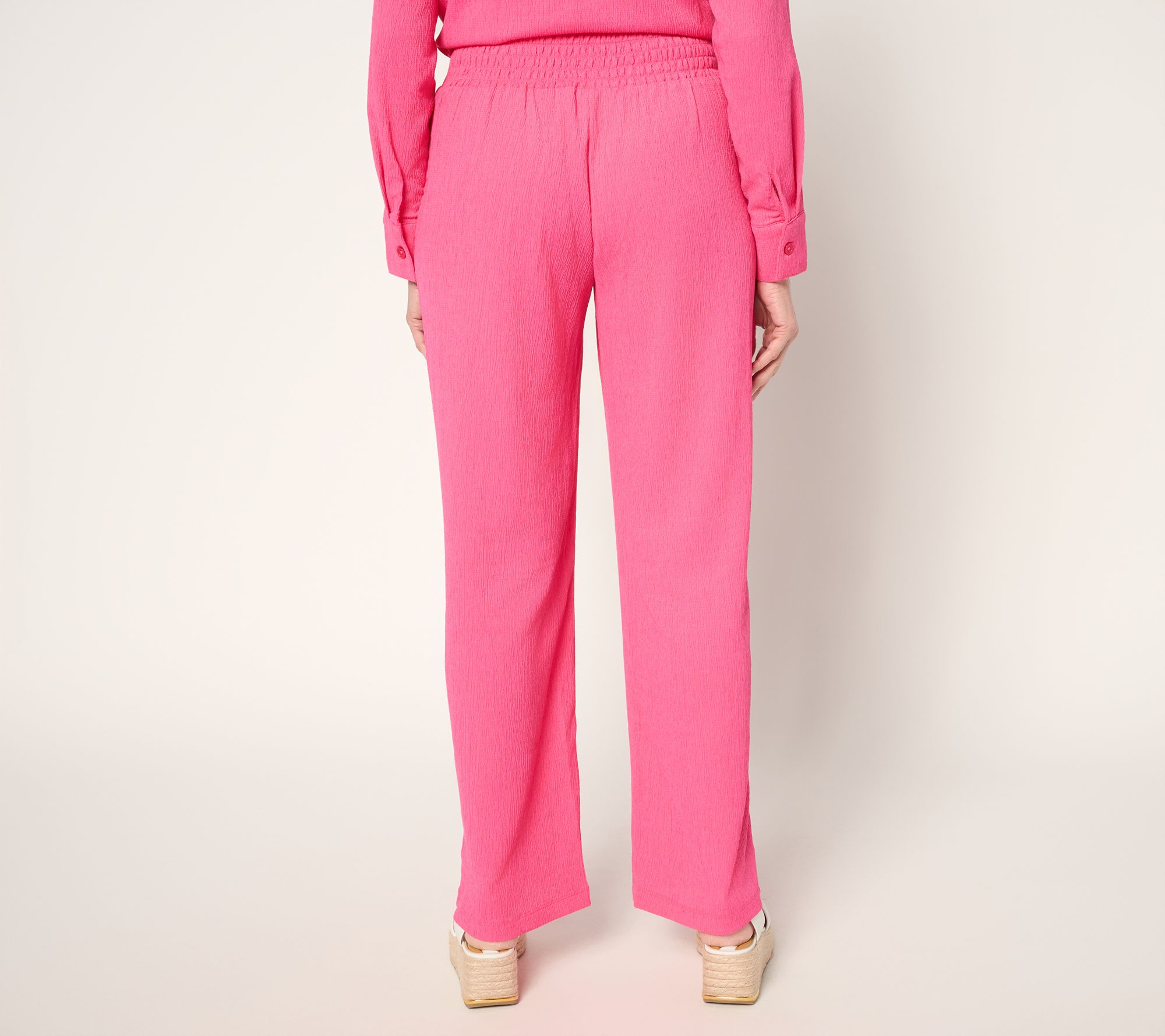 Features: crinkle textrue, pull-on waistband, side seam pockets, straight hem