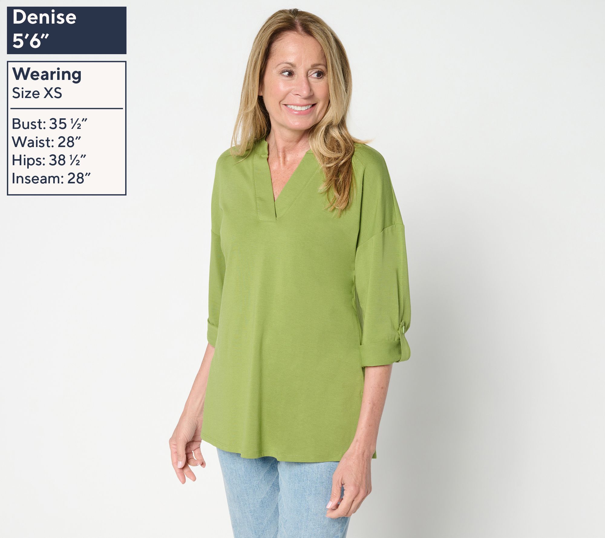 Everyday moments? They deserve a little style, too. This split-collar design from Kim Gravel, with easy drop shoulders and sleeve tabs, lends a modern yet relaxed vibe in smooth TripleLuxe, while side slits at the straight hem add comfort for on-the-go plans and laid-back afternoons. From Belle by Kim Gravel.