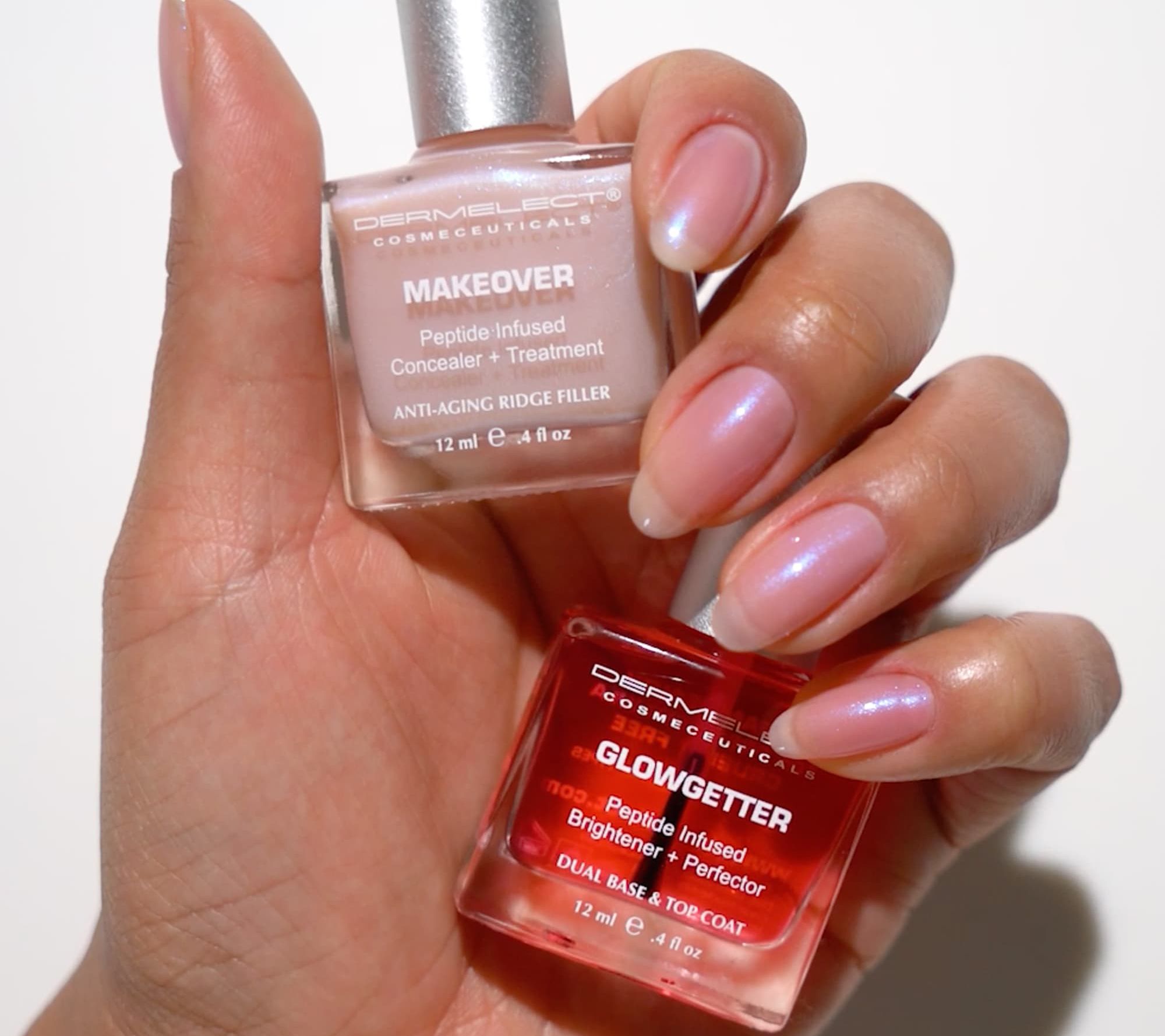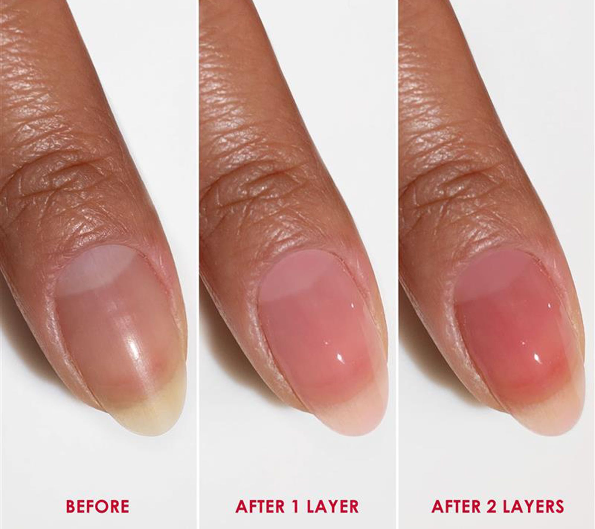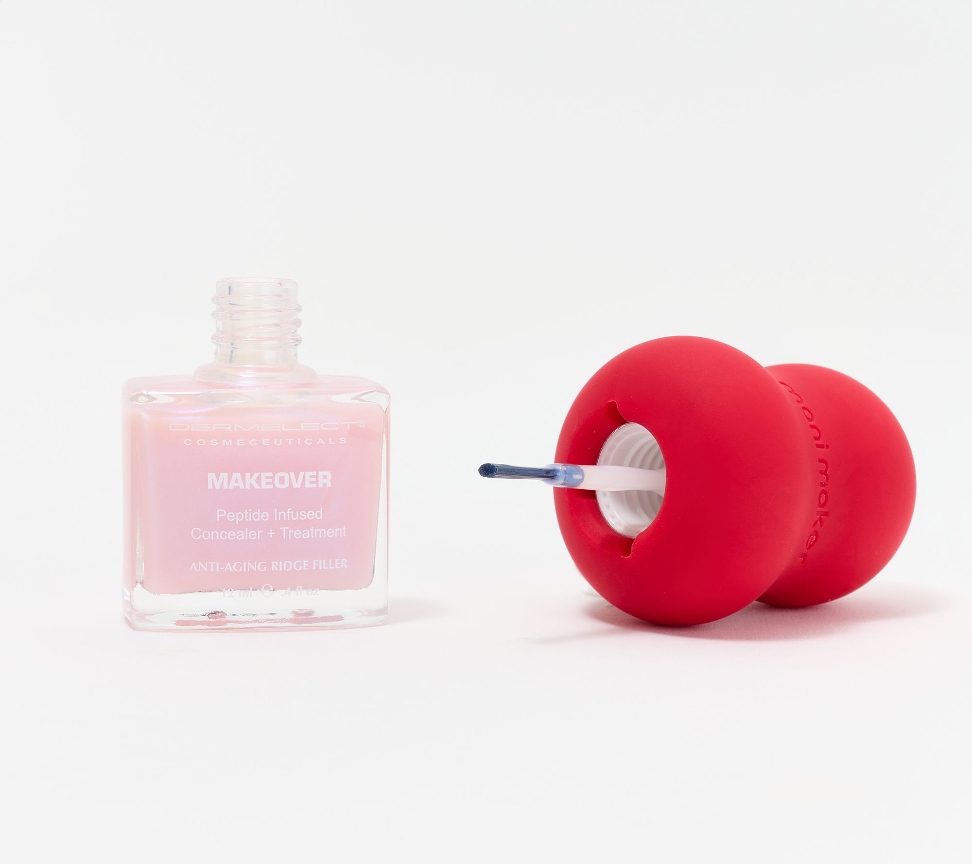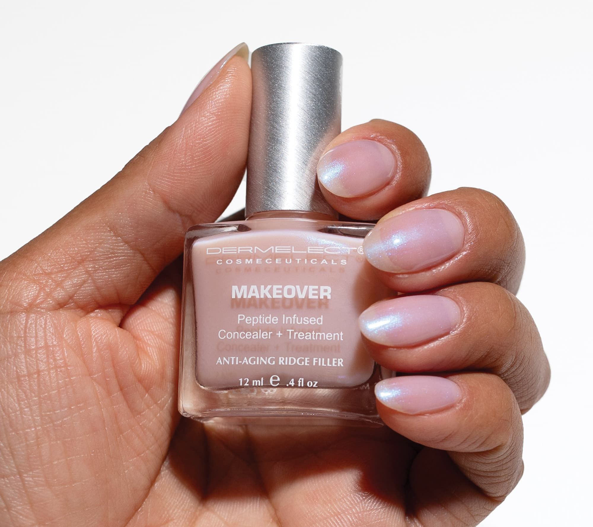 Makeover Smoothing Ridge Filler instantly camouflages nail imperfections with a shimmering pink hue.