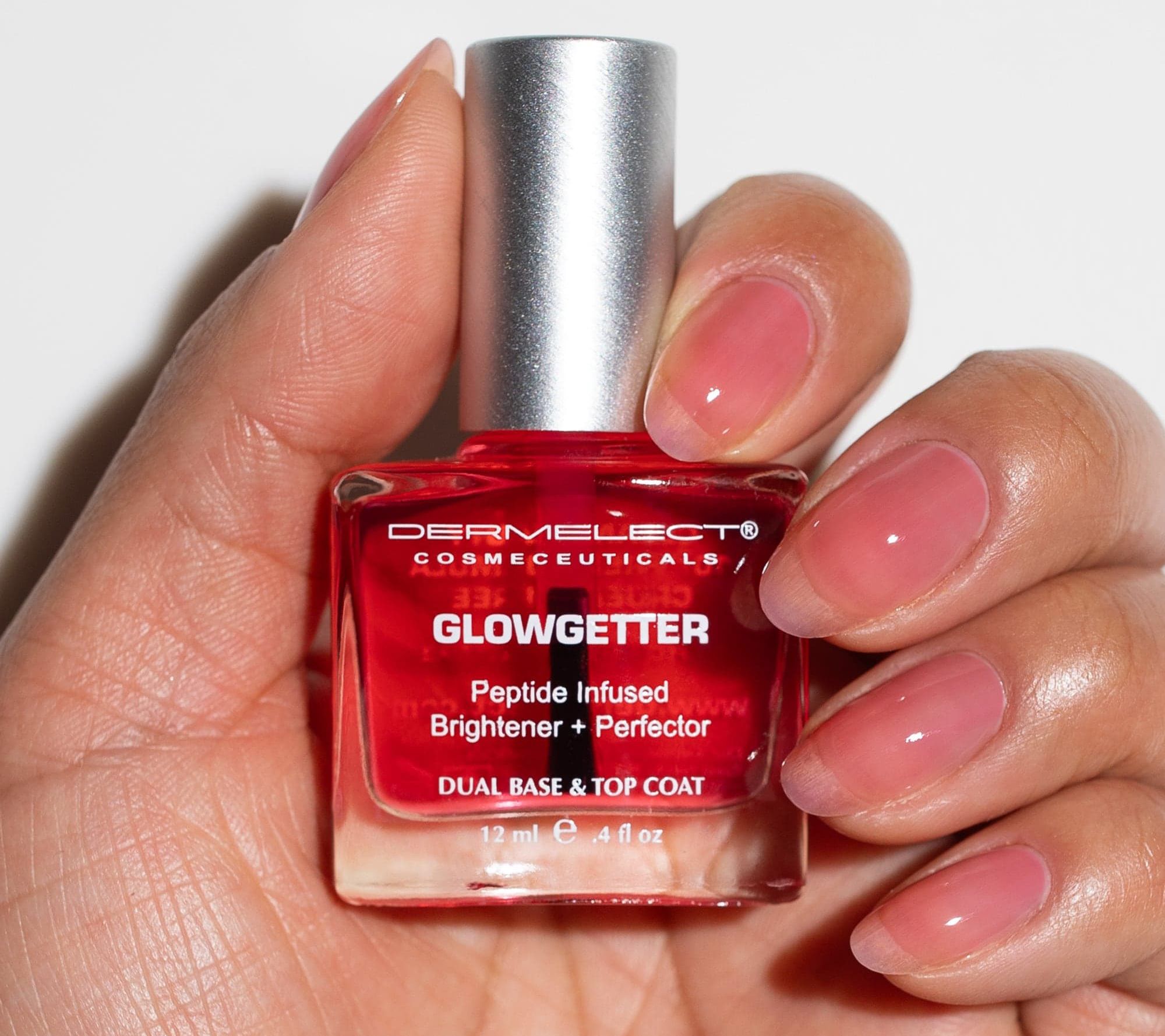 Glowgetter Nail Brightener + Perfector brightens the look of nails and improves the look of nail texture with known exfoliating ingredients: glycolic acid, lactic acid, and malic acid. It features a rose jelly tint to acheive the look of vibrant, healthy-looking nails.