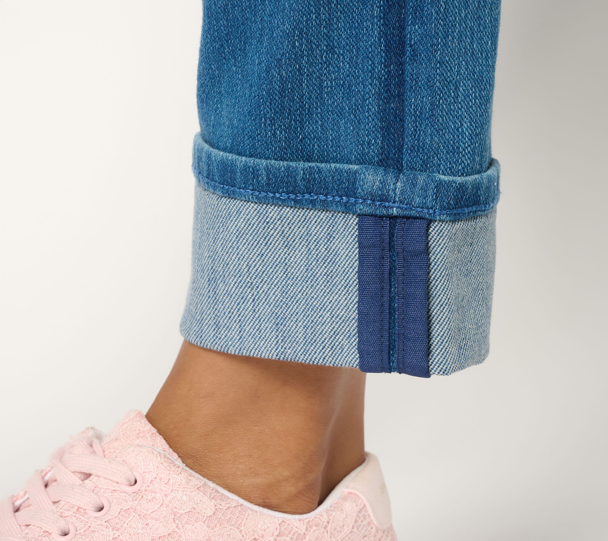 Features: pull-on, five-pocket style, turnback cuff at leg opening, ankle length