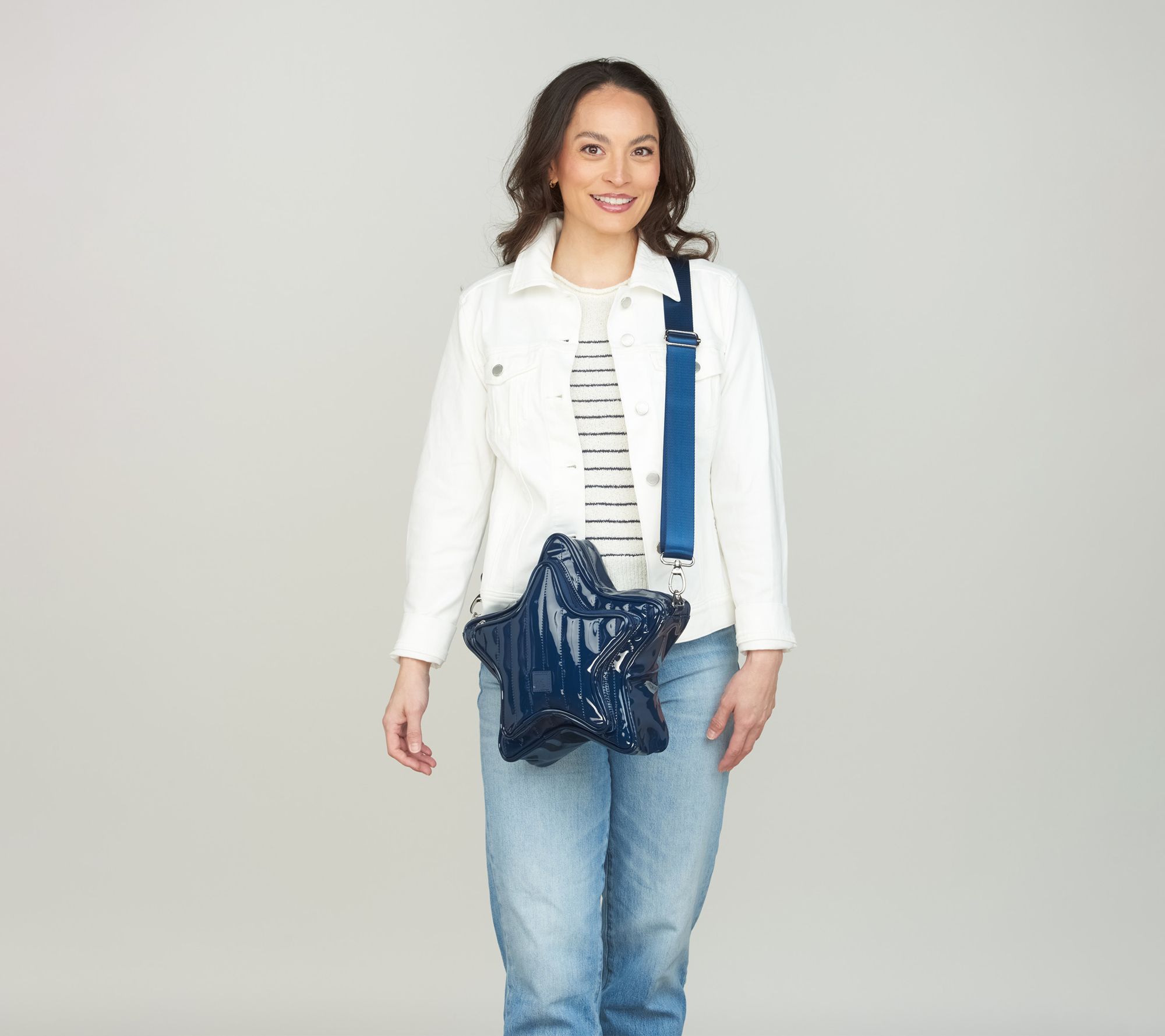 Star silhouette, water-repellent exterior, zip-top closure, adjustable removable crossbody strap, front zip pocket