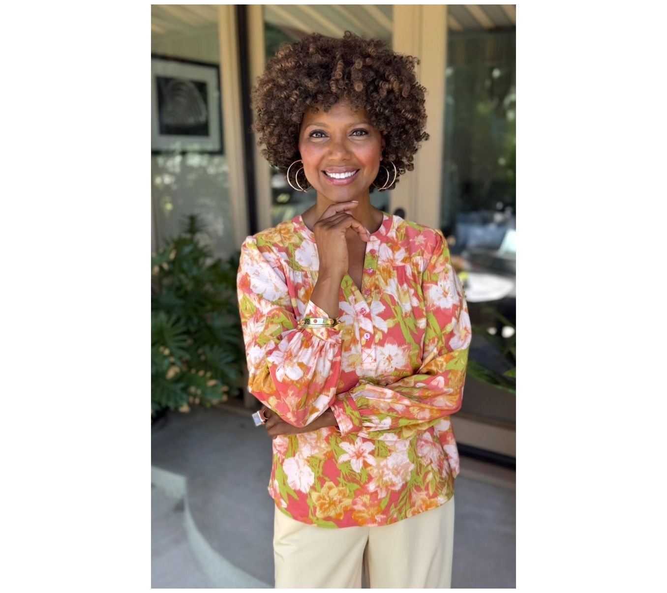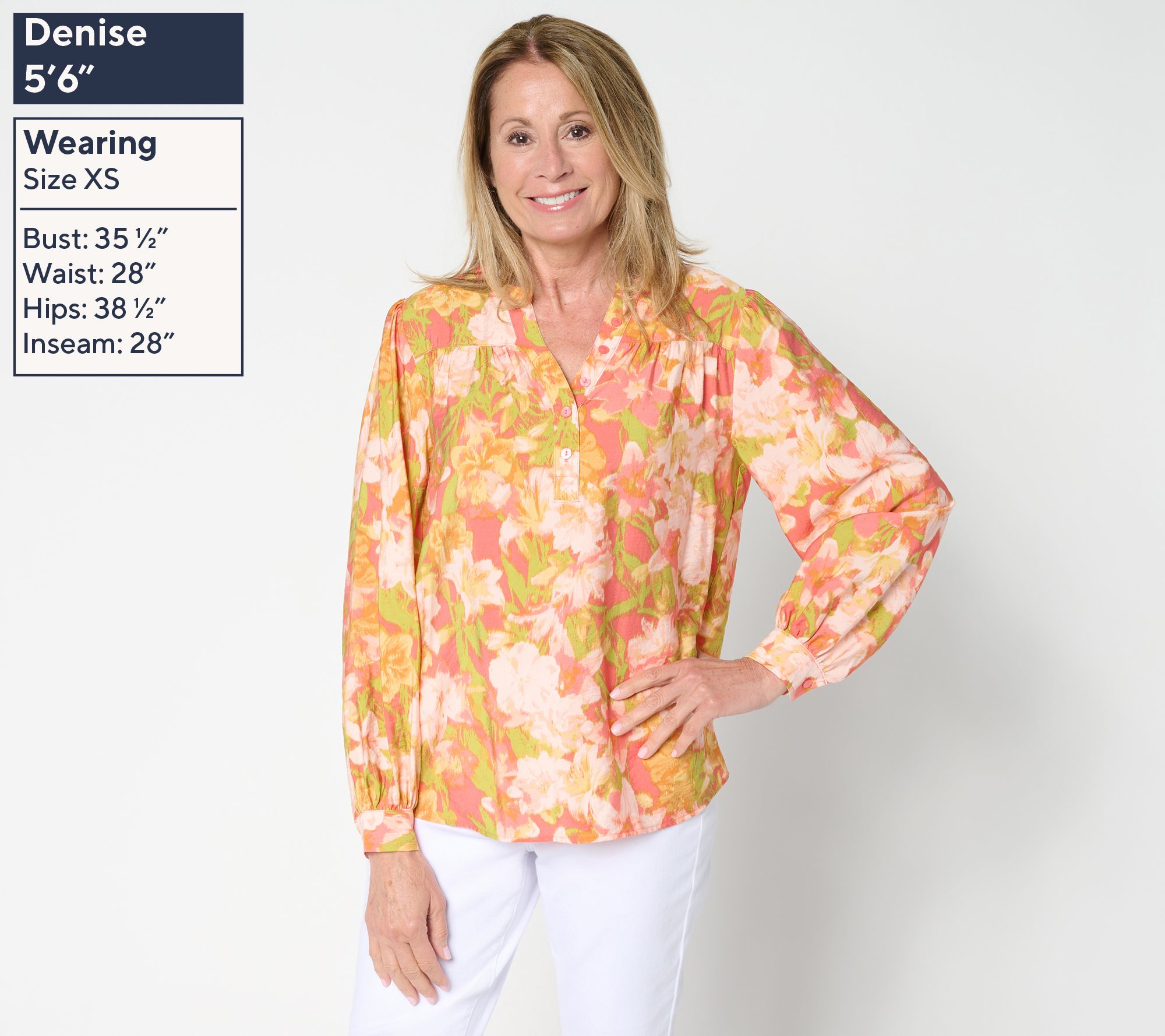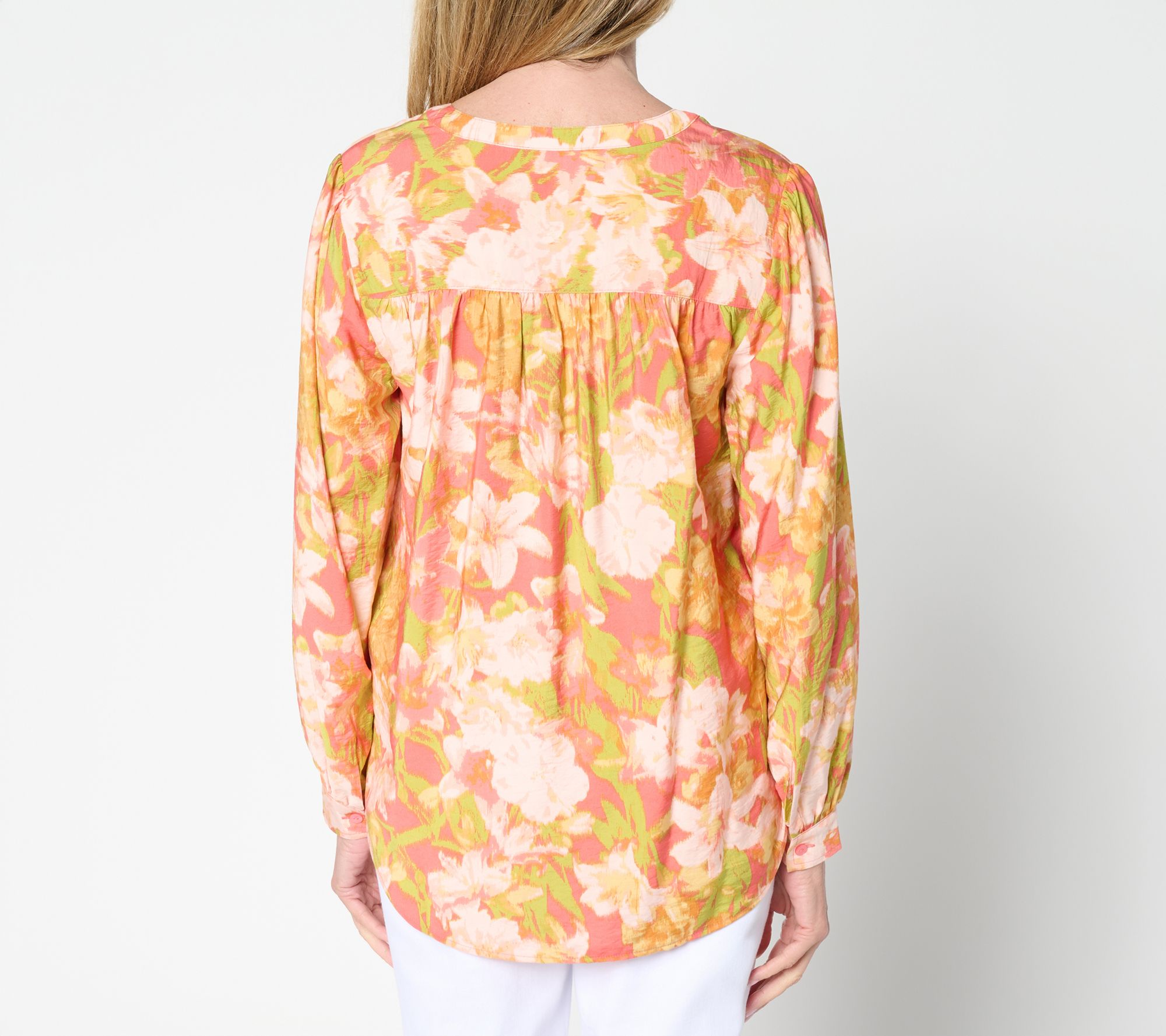 Features: allover print, collar band, Y-neck henley with button closure, gathered long blouson sleeves, curved bottom hem, back yoke, button cuffs, hi-low hemline