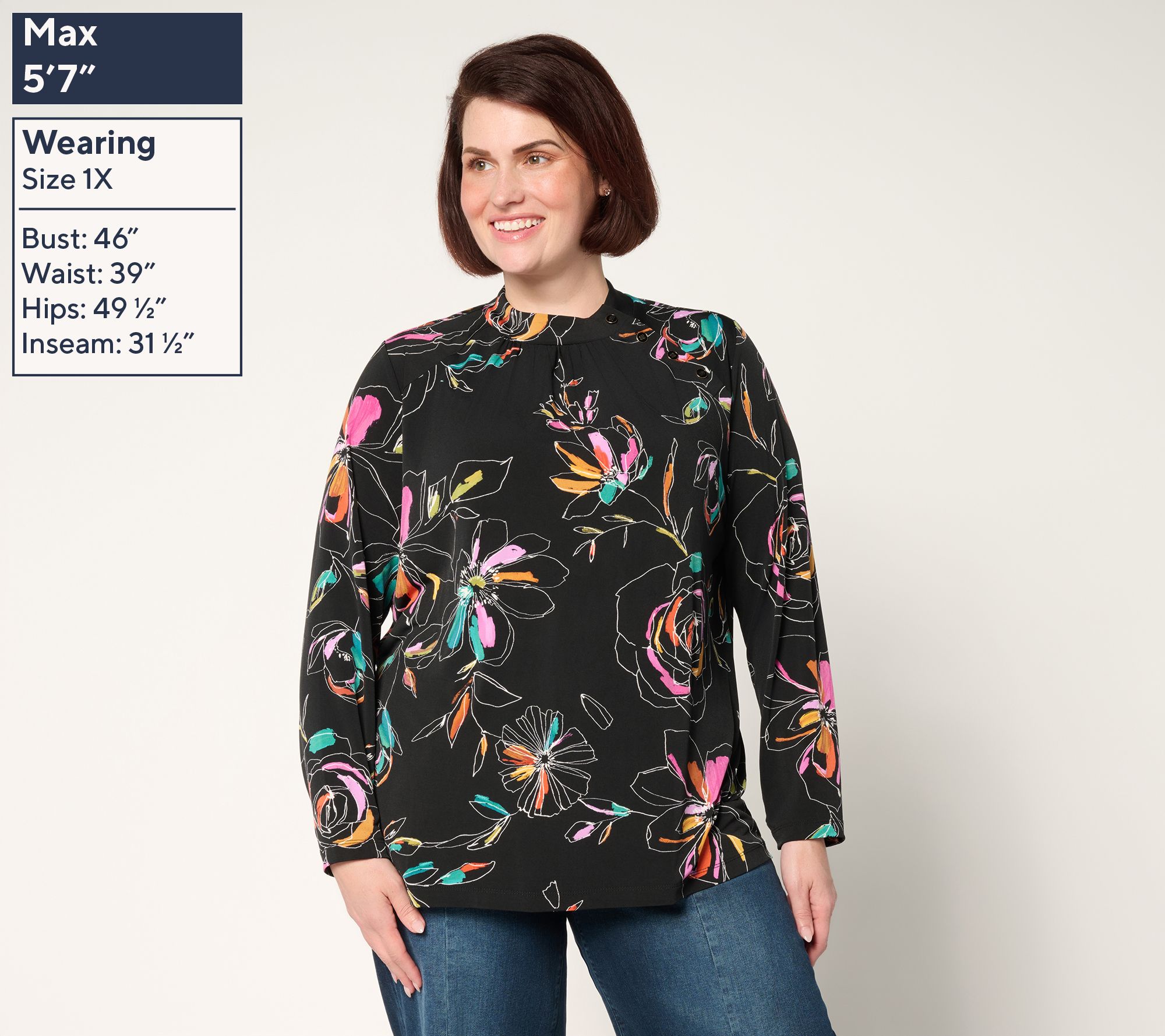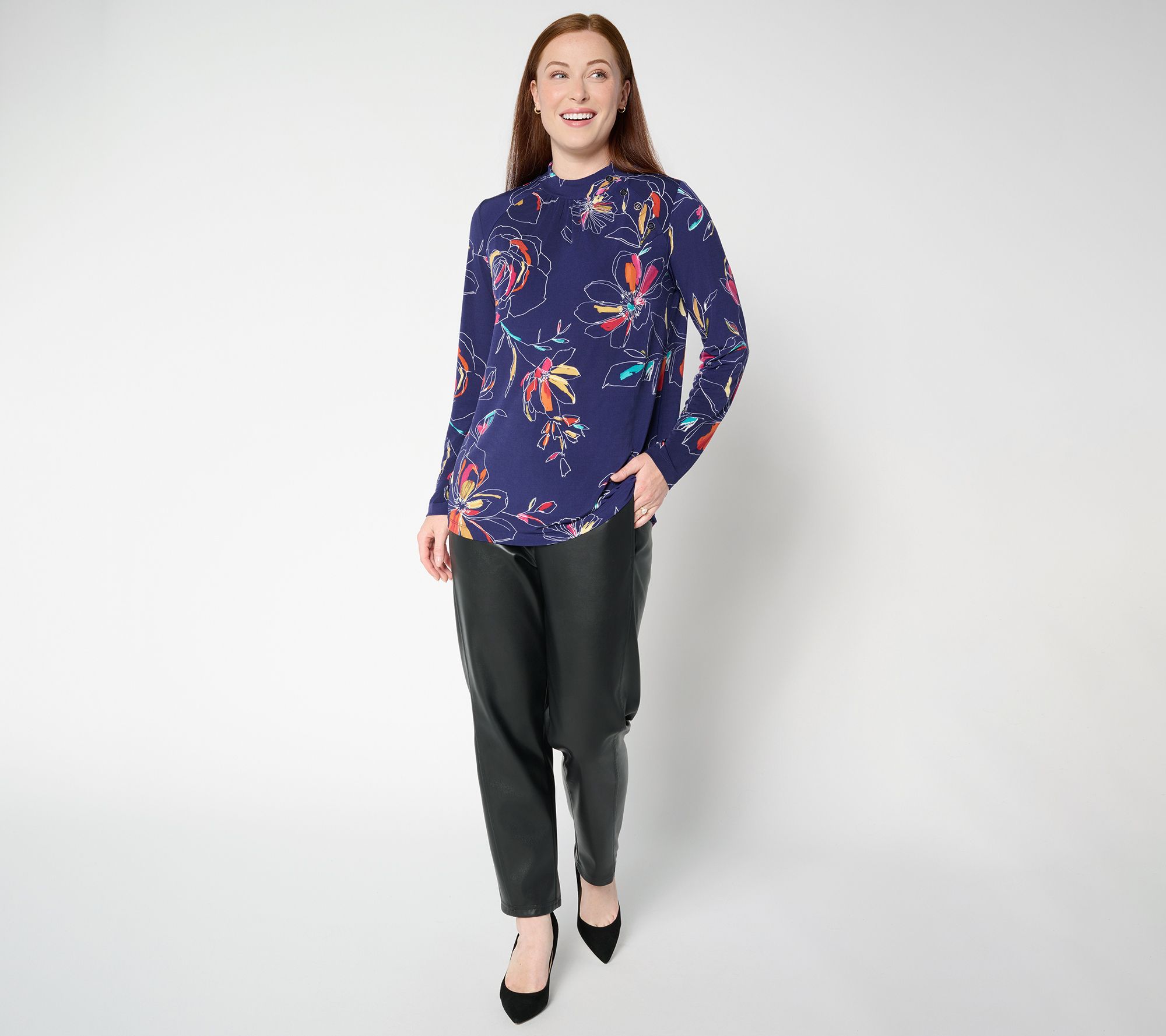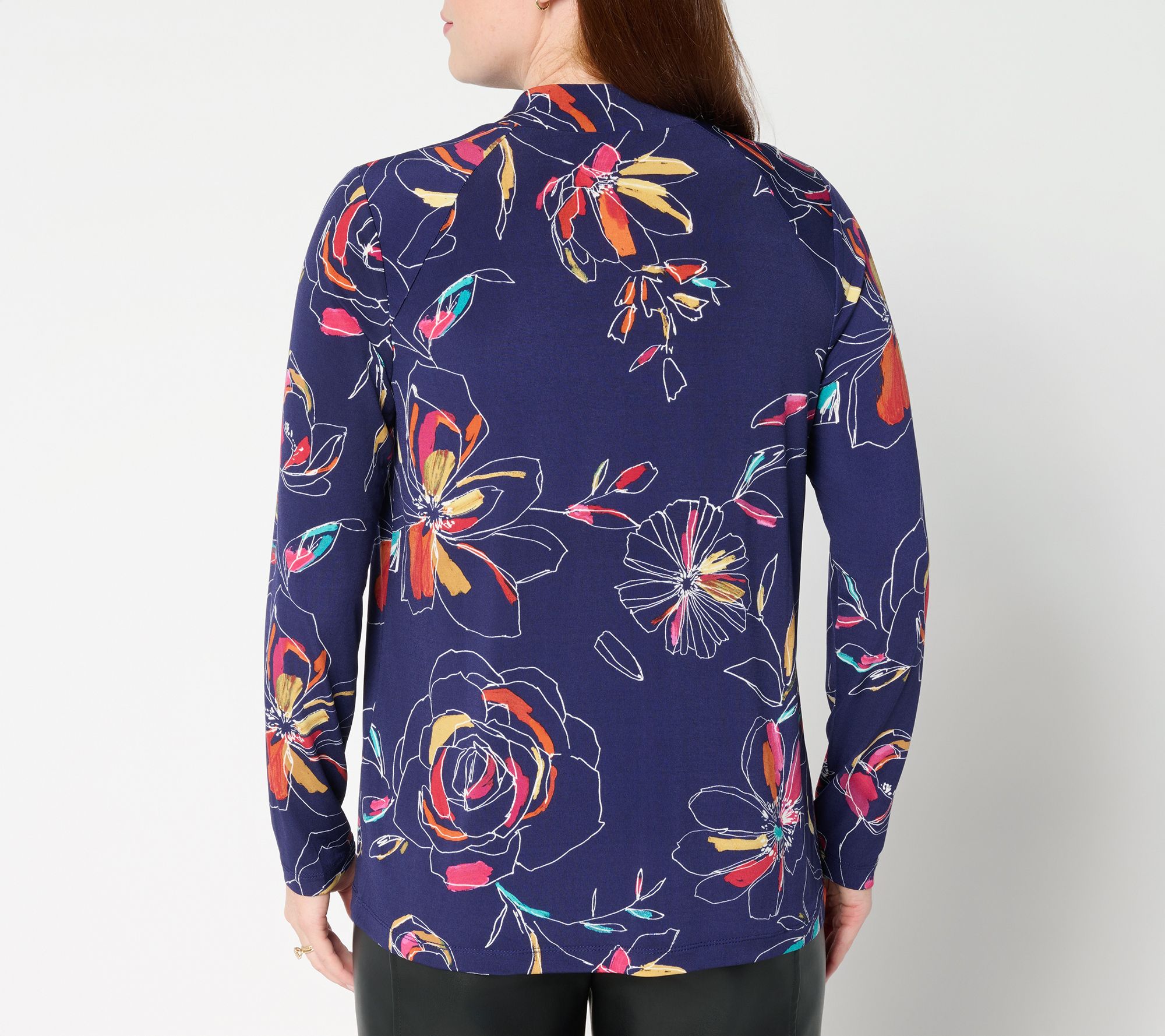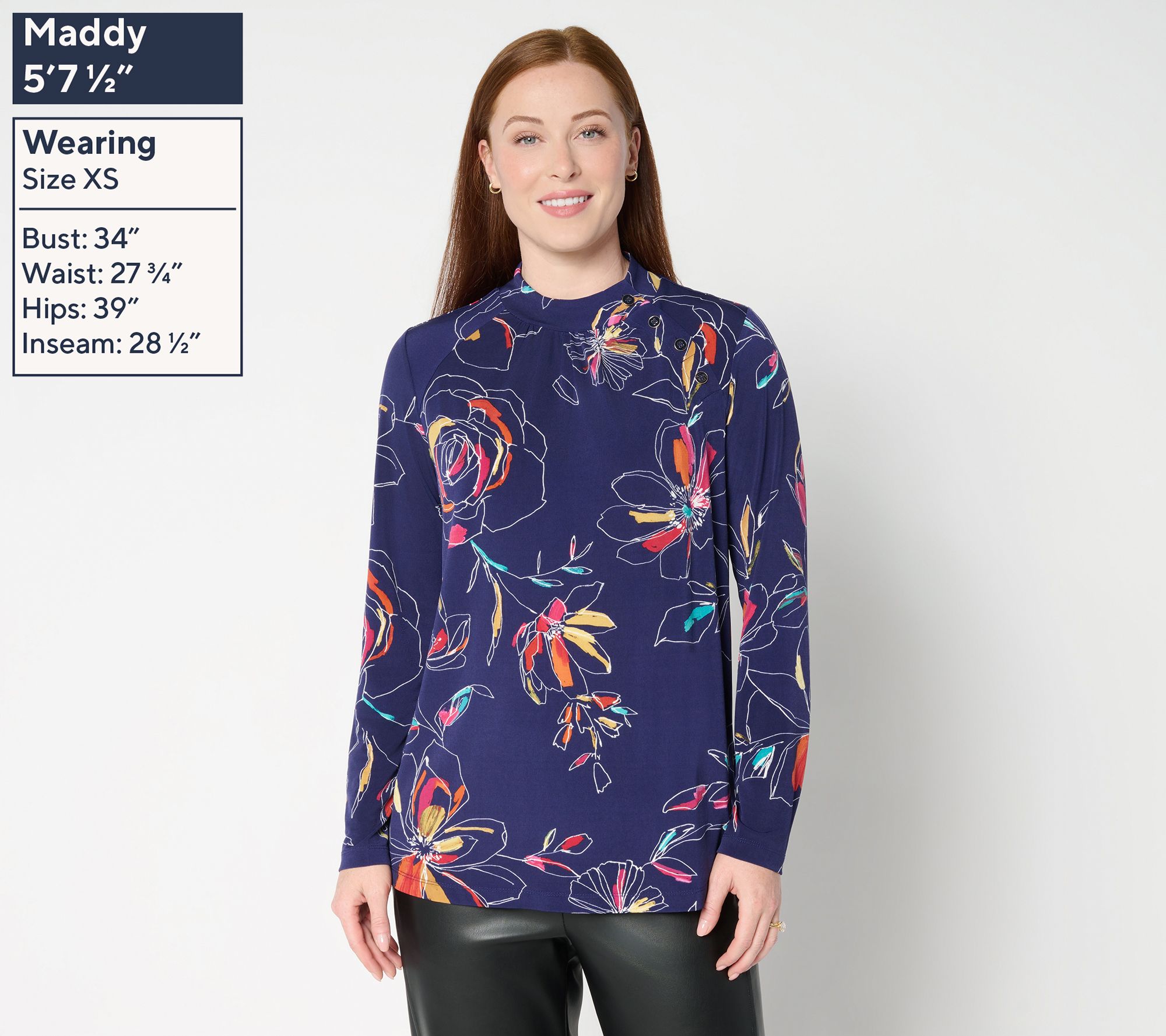 Susan Graver Printed Liquid Knit Long Slv Mock-Neck Top w/Button Detail