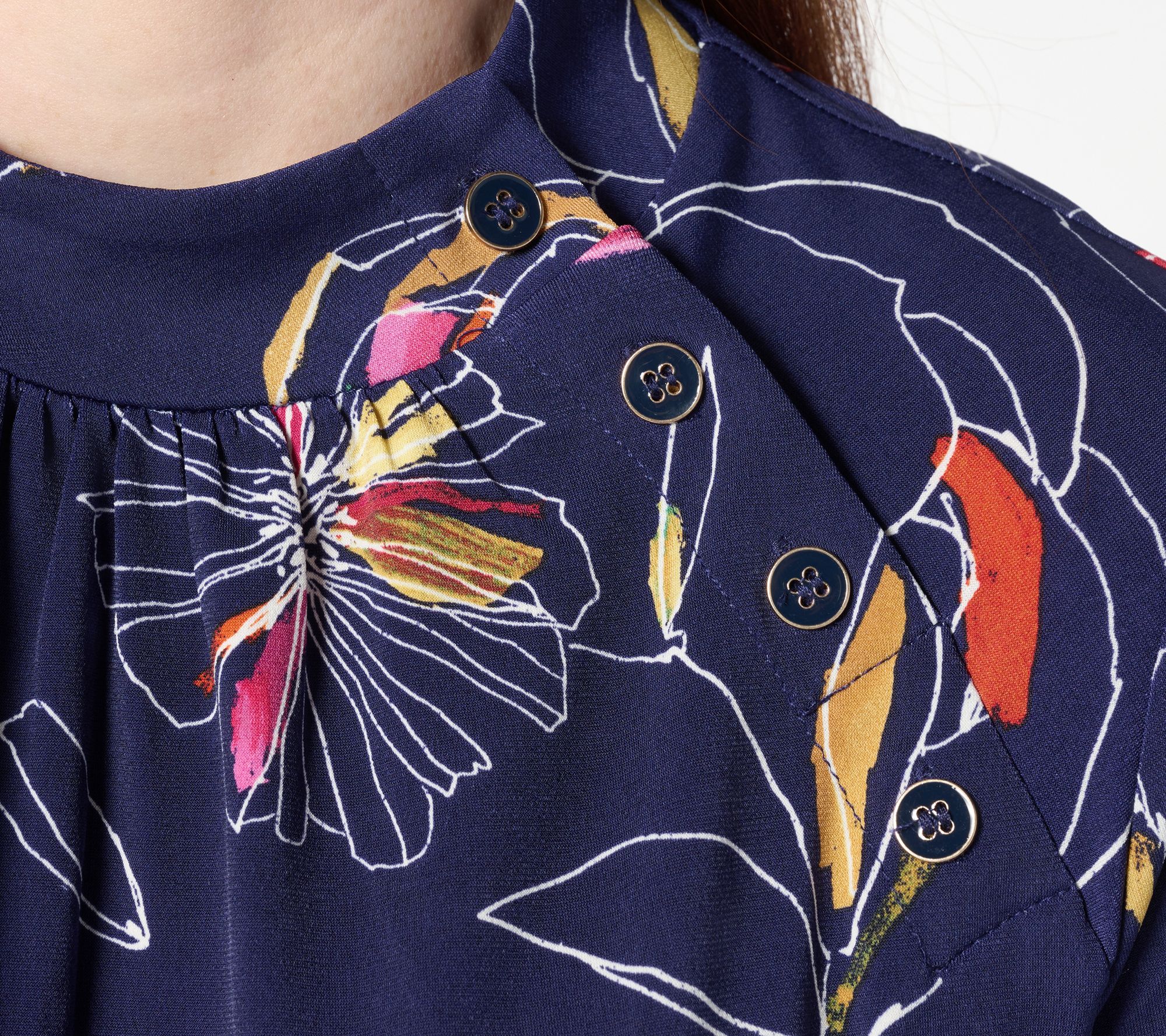 • Features: allover print, long sleeves, mockneck, diagonal four-button placket with three functional buttons at left front shoulder yoke, spot shirring at center front neckline, straight bottom hem