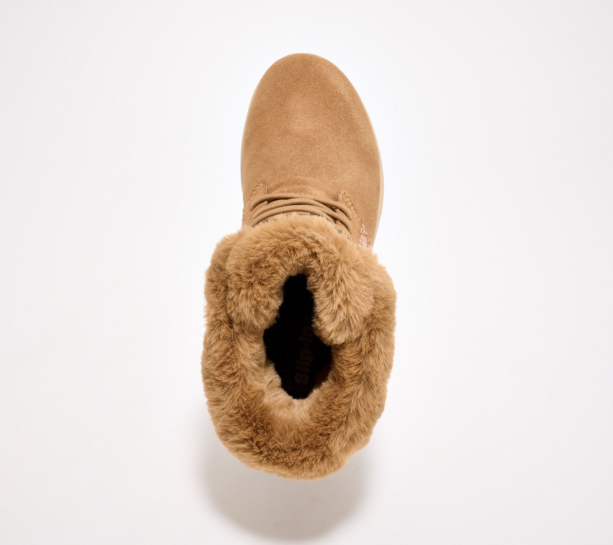 • Water-repellent upper, Slip-Ins style, suede upper, adjustable laces, boucle quarter detail, faux-fur trim, Heel PillowTM
