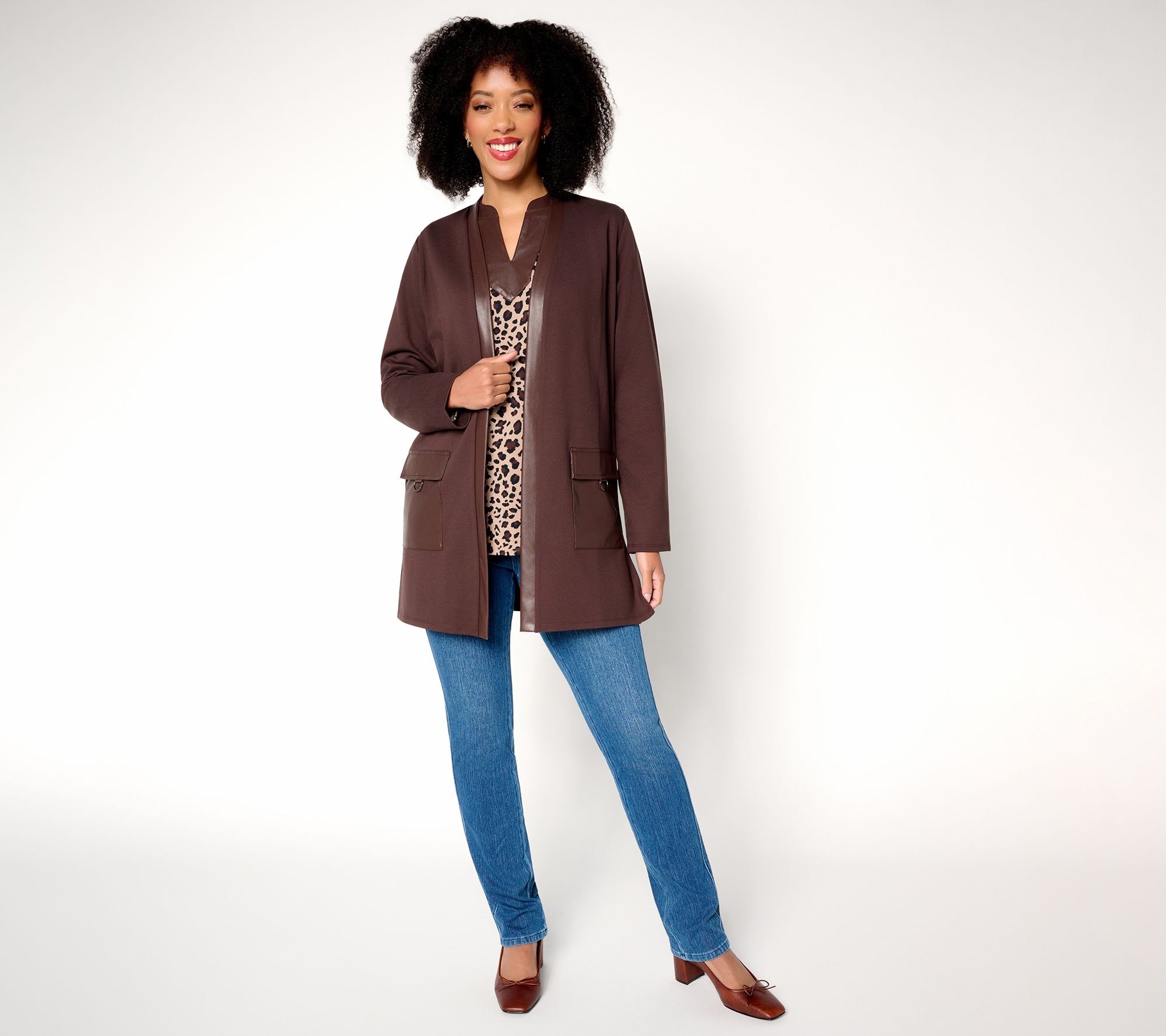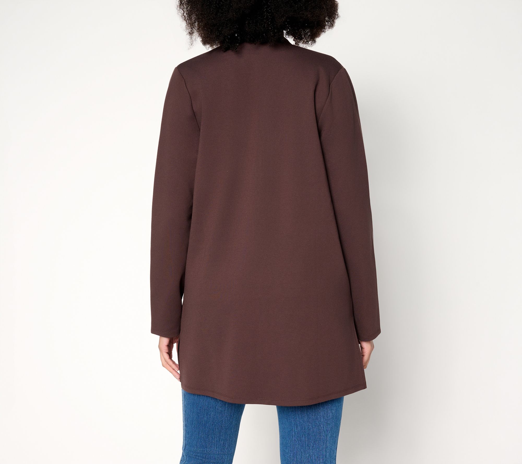 Layer this long-sleeve duster over jeans for appointments and lunch dates, or slip it on at your desk for an instant upgrade to any outfit. Elegant ponte knit and sleek faux-leather trim combine comfortable structure with subtle edge, while the open front and side slits offer easy movement from day to night. From Belle by Kim Gravel.
