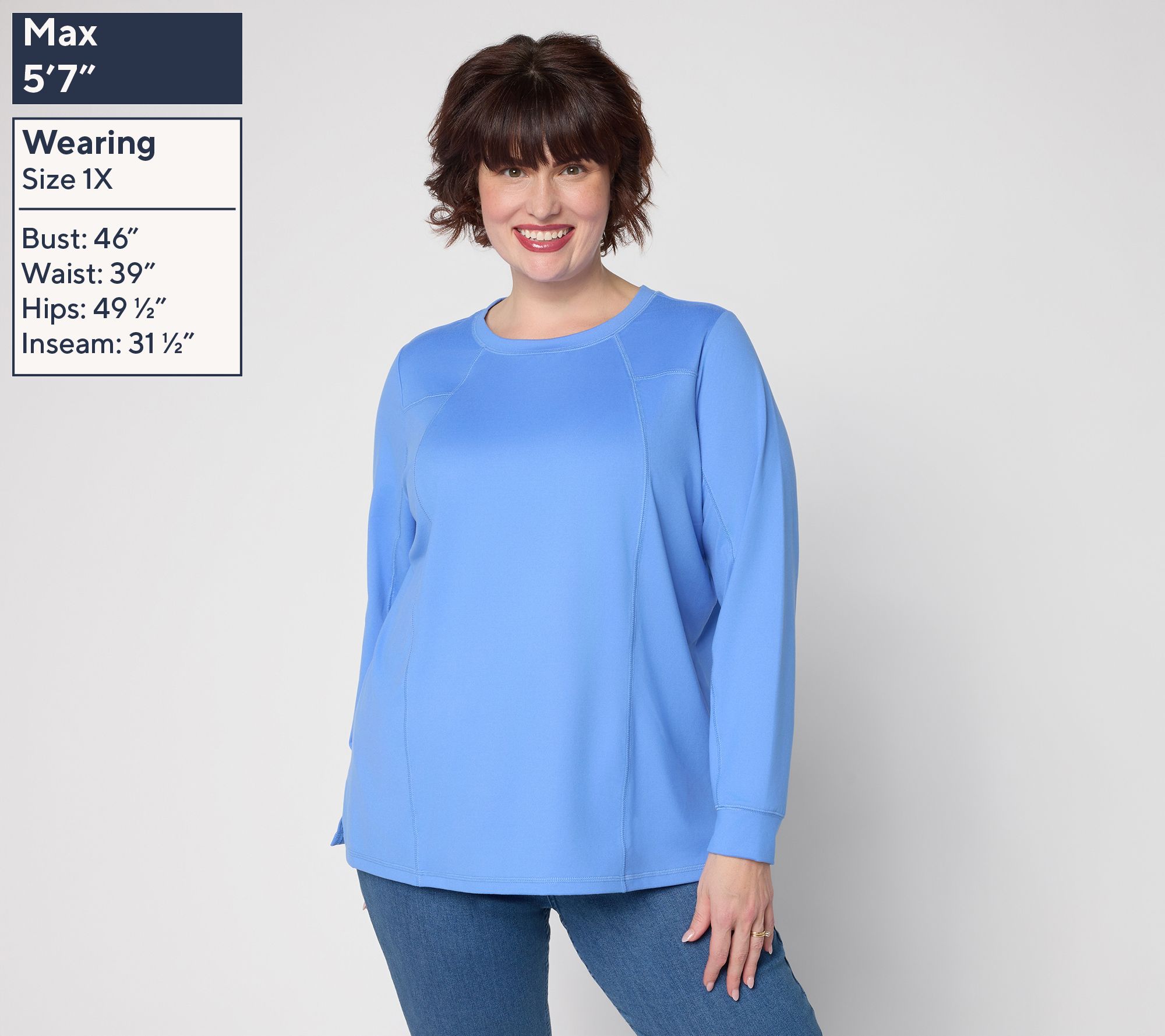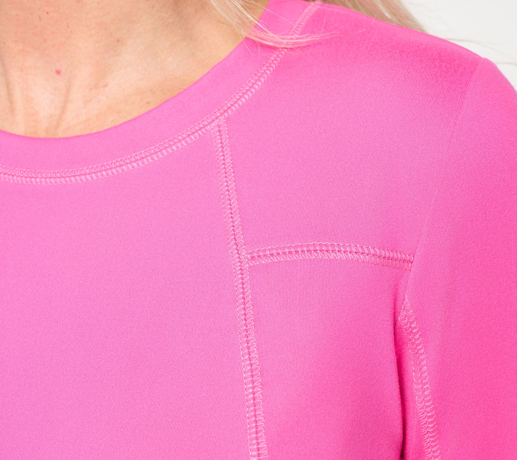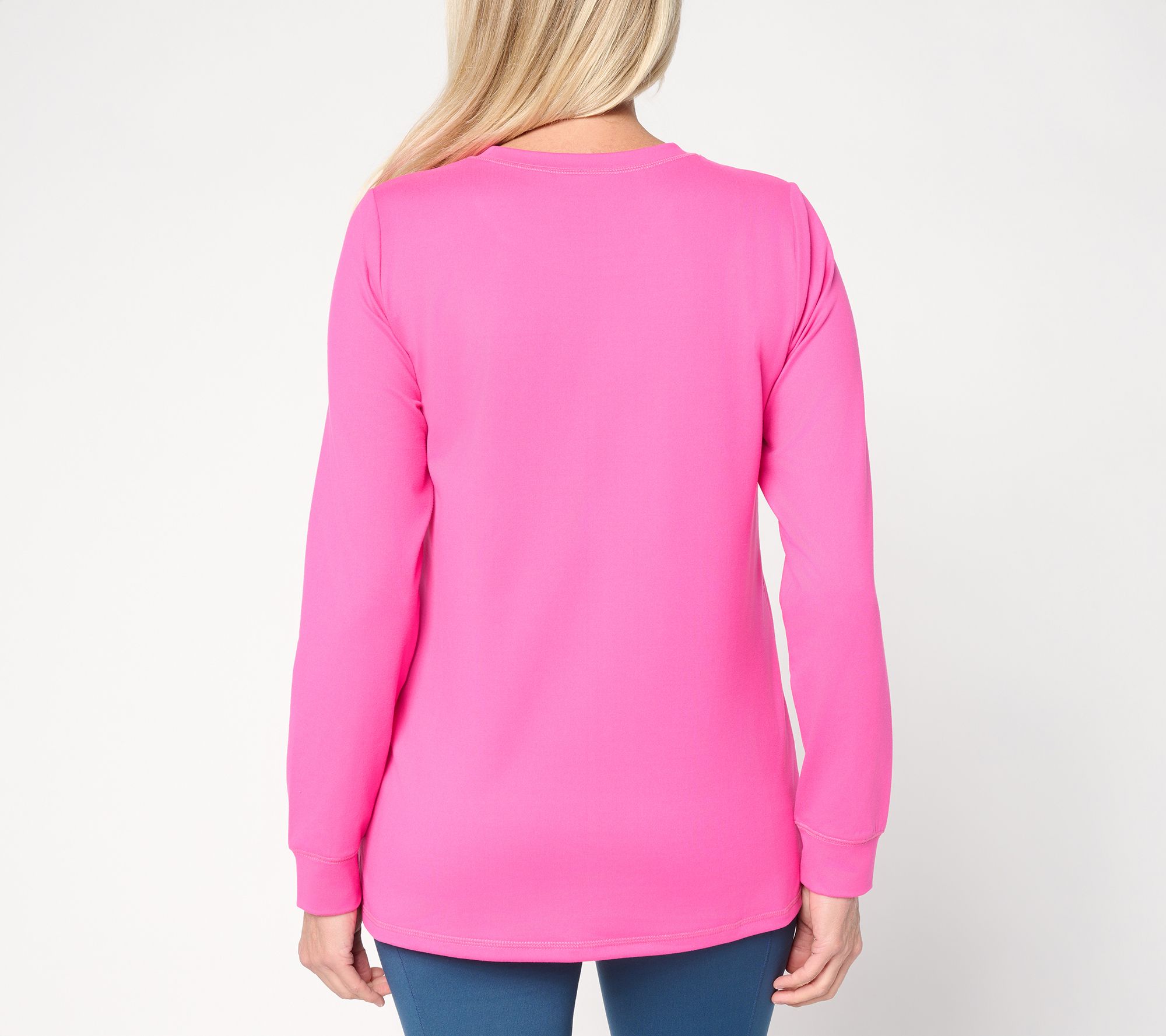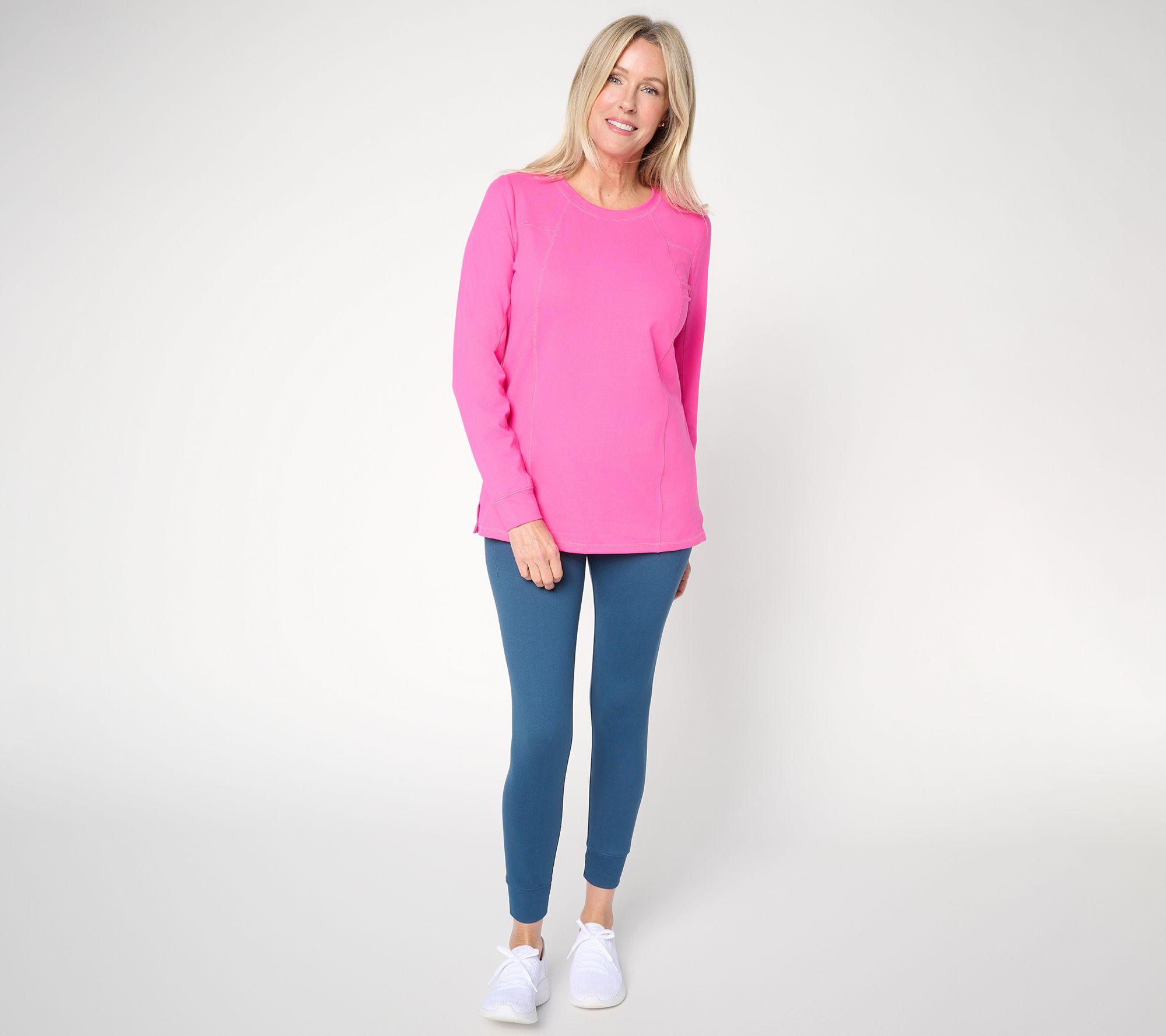 Pulling on this athletic jersey top means you're ready for everything from gym days to laid-back afternoons, thanks to the soft knit, easy straight hem, and movement-friendly side slits. Detailed with topstitching and crafted with comfortable long sleeves, it keeps up whether you're running errands or kicking back on the couch. From Belle by Kim Gravel.
