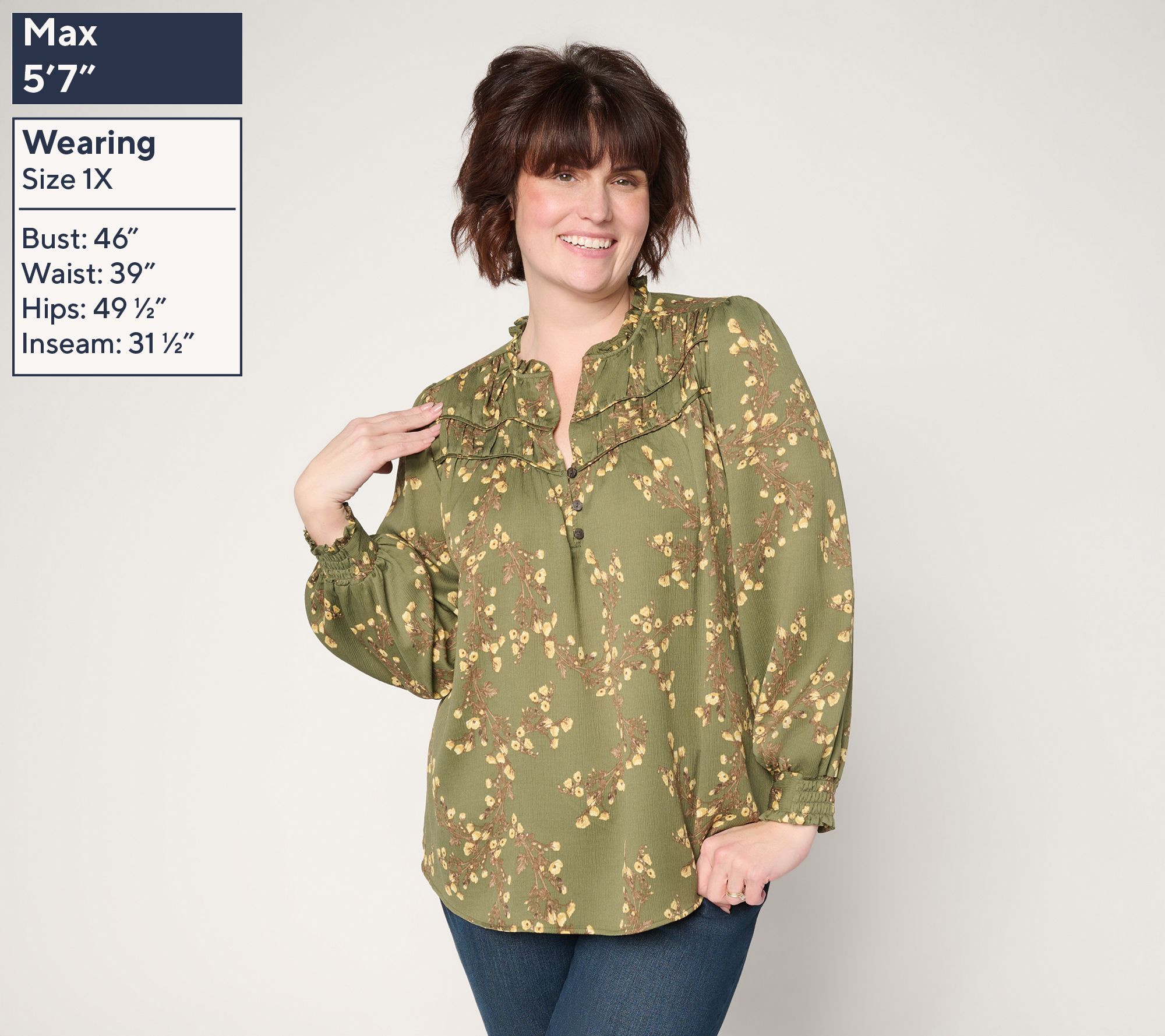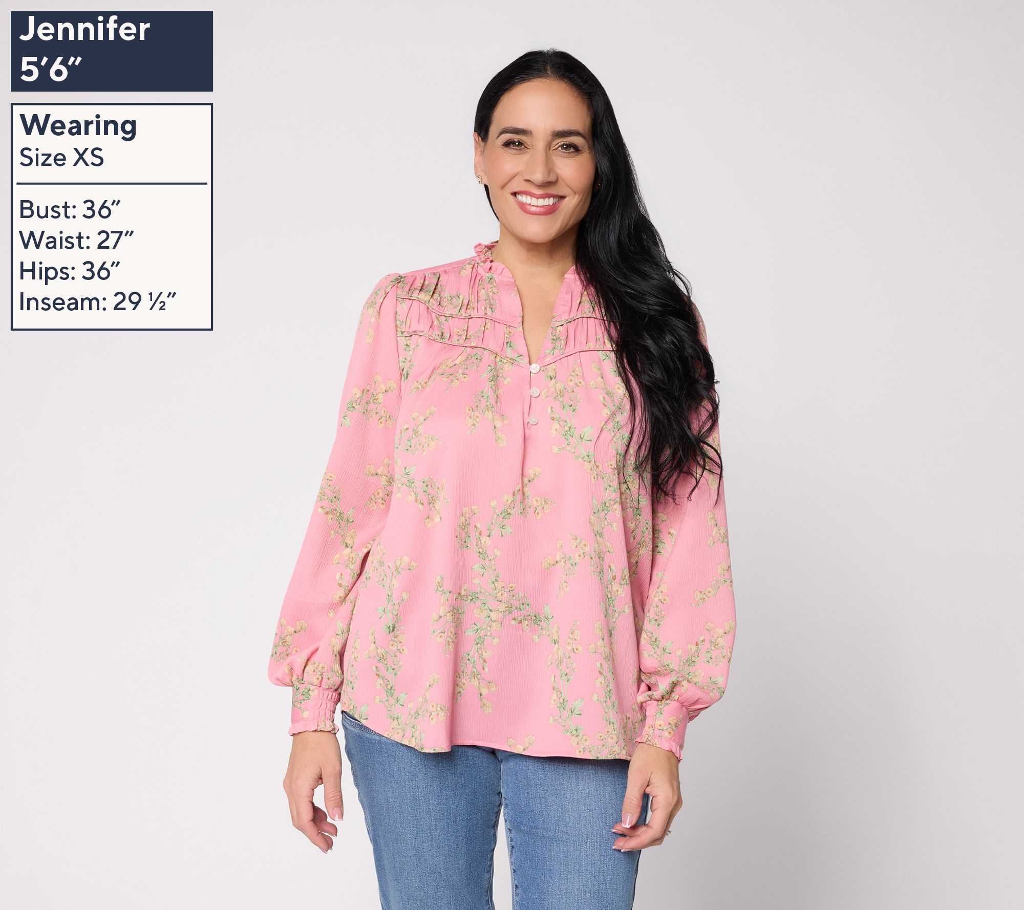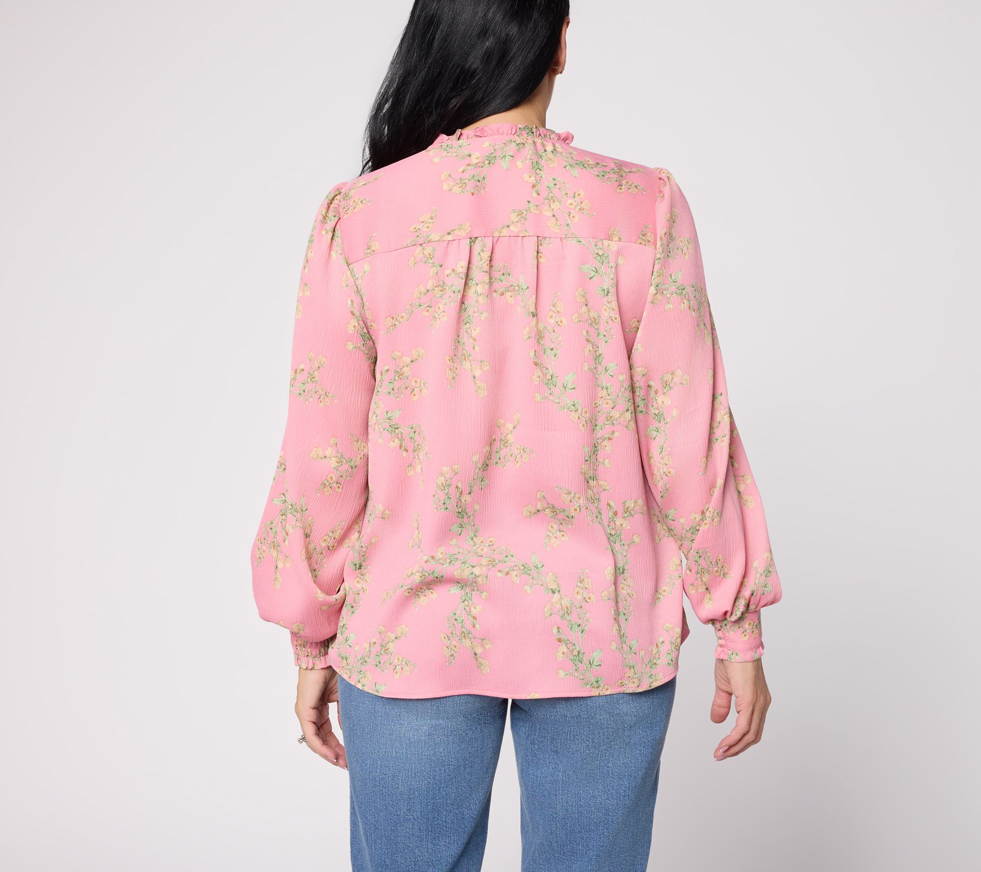 Features: split neckline with ruffle detail, kissing placket with three buttons, shirring at sleeve cap and front yoke, long sleeves with shirring and ruffle cuff, shirring at back yoke, straight bottom hem, printed