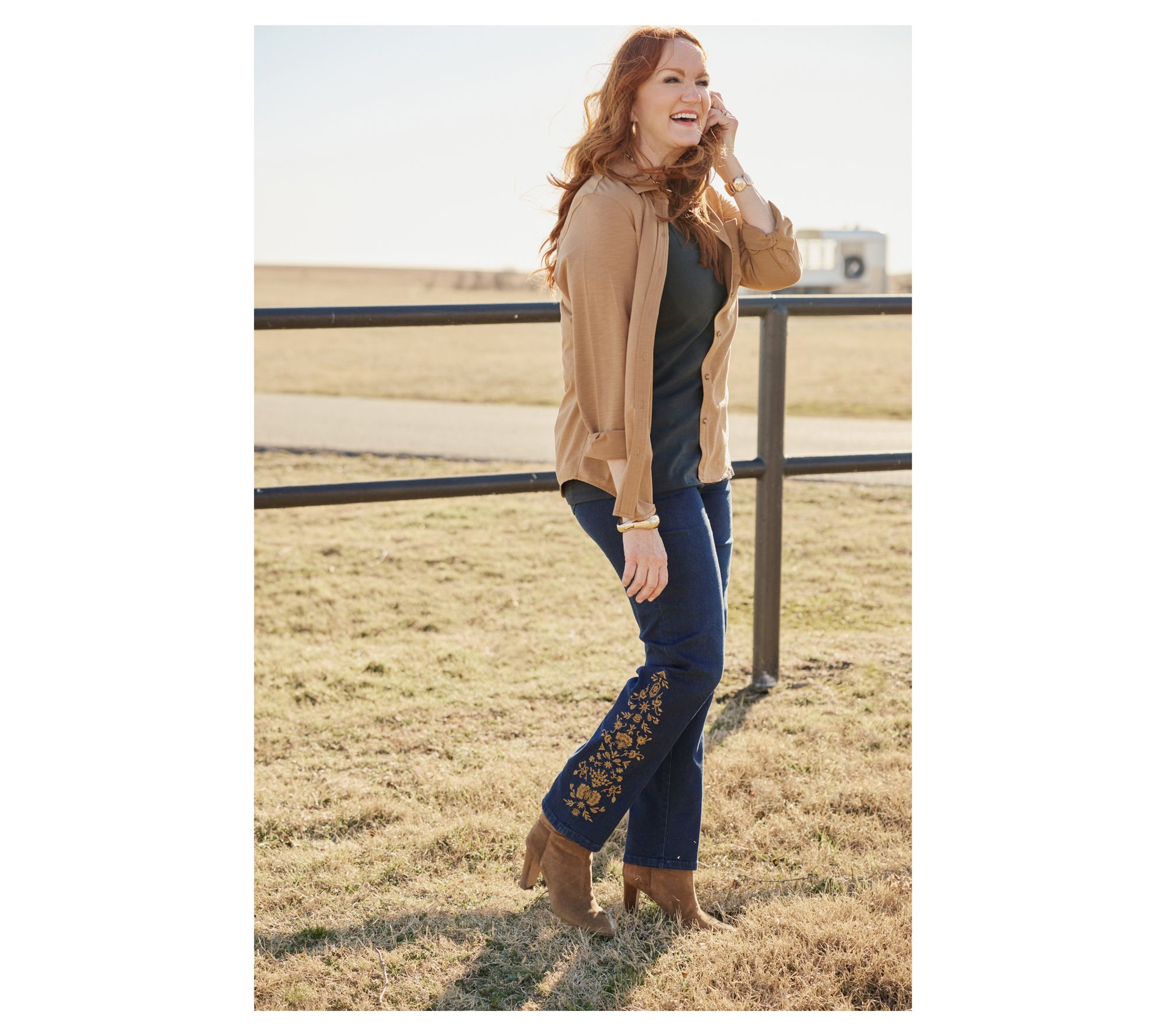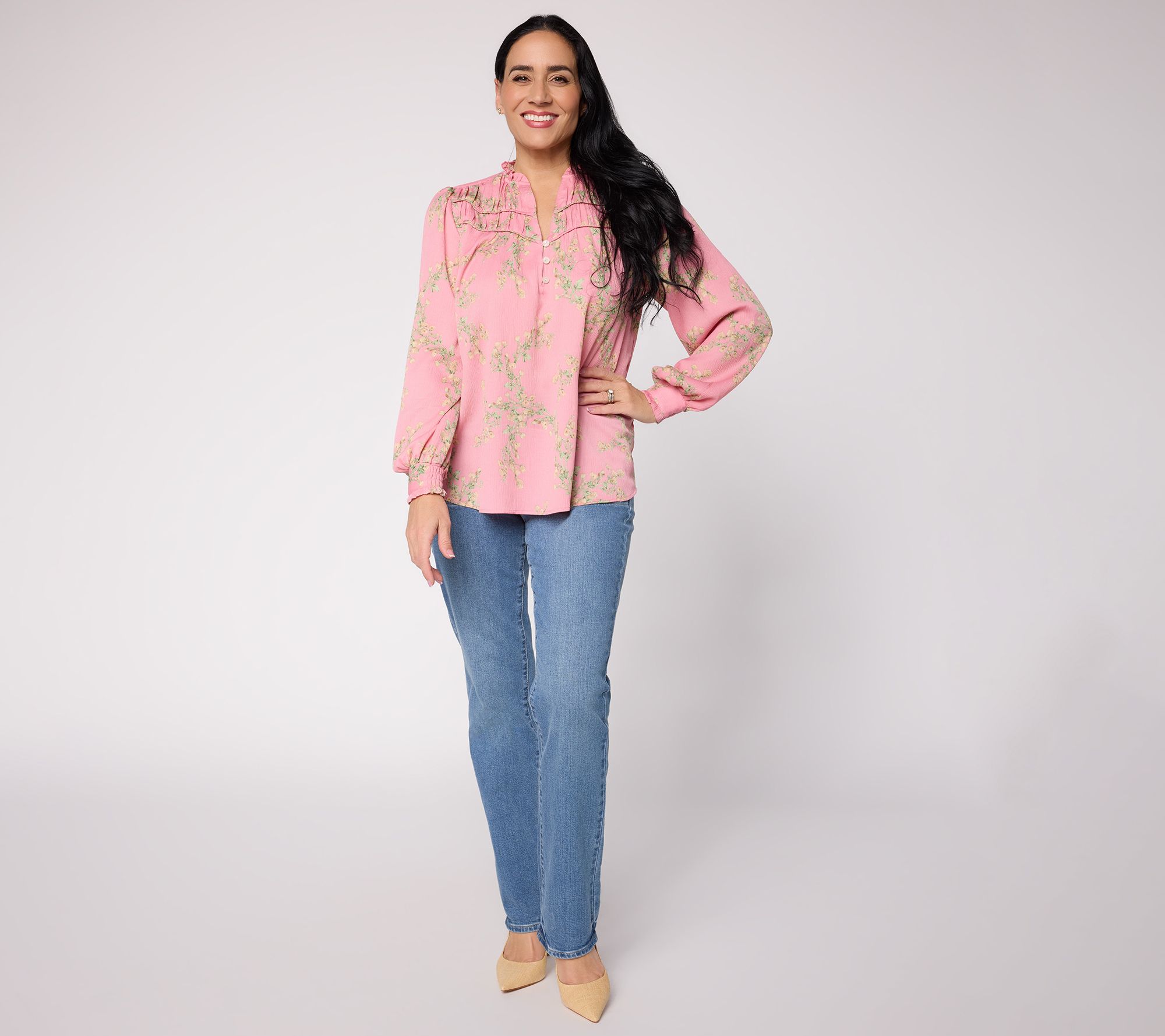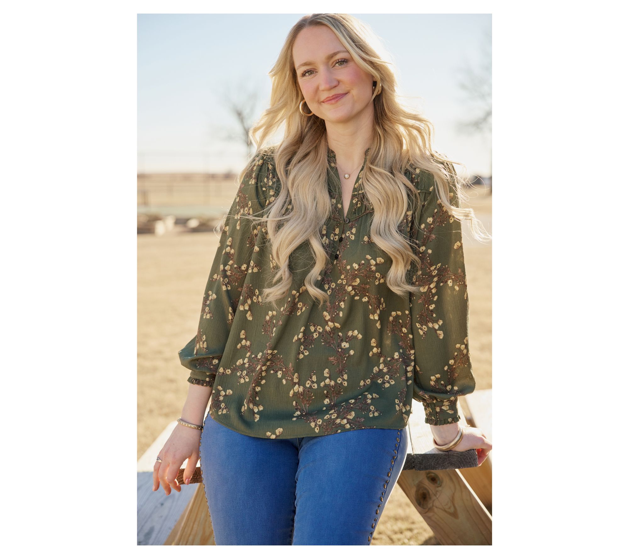 Sunny afternoon gatherings or spontaneous outings feel effortless in this woven blouse. Delicate ruffles frame the split neckline, while shirred details on the sleeves and yoke pair with a flowing, relaxed silhouette that moves with you from errands to evenings out. Button accents and pretty printed fabric give this long-sleeve top a charming finish. From Ree by the Pioneer Woman.