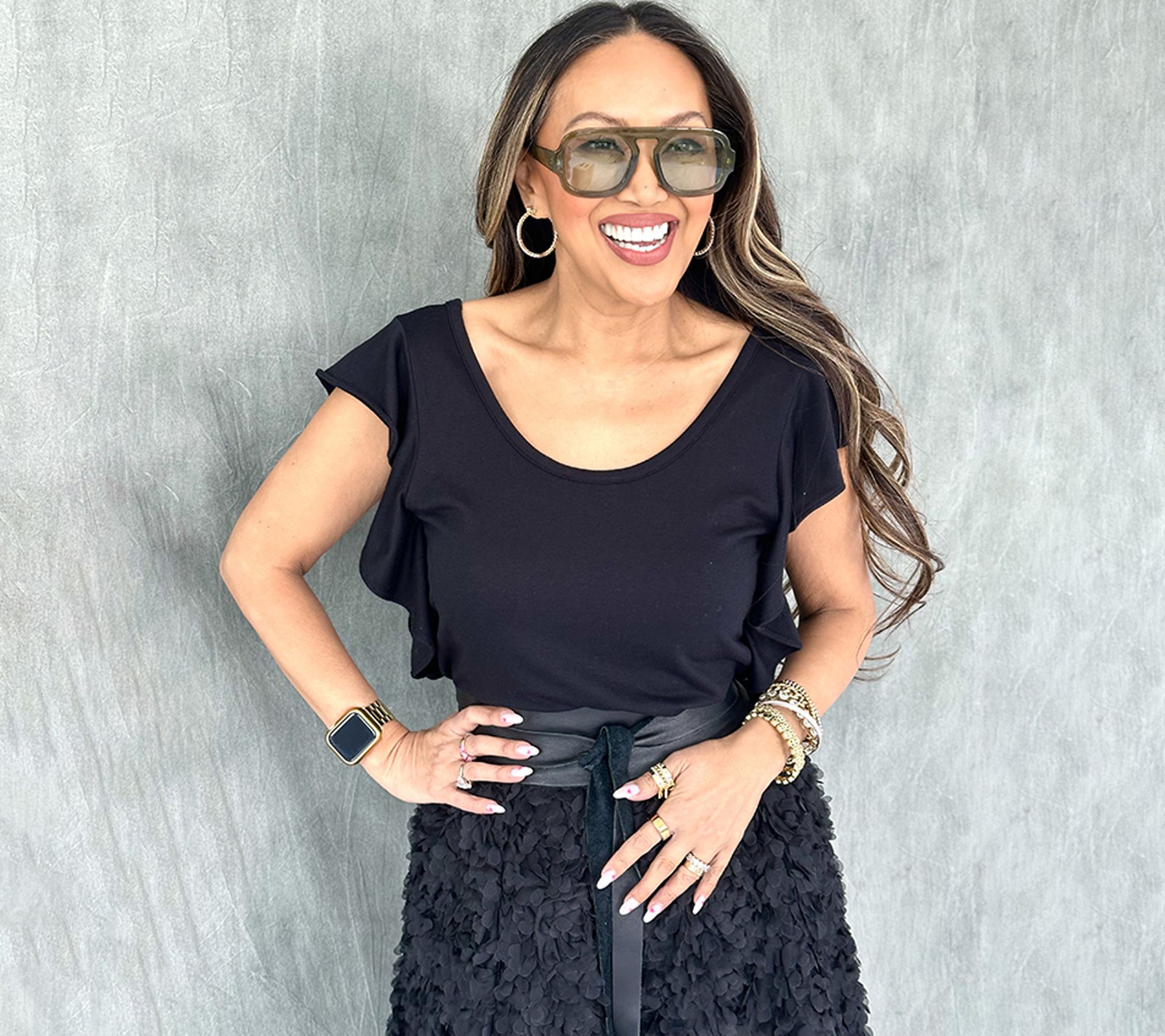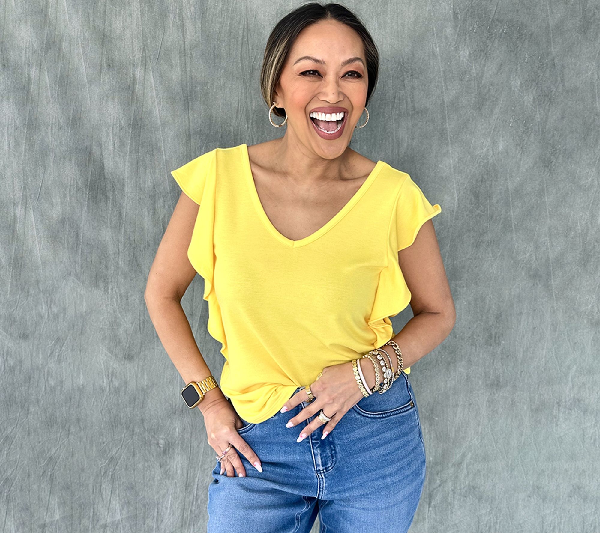 Whether it's a quick lunch date or an evening gathering, this flutter-sleeve blouse adapts seamlessly to your agenda. Flip between a classic V-neck or a relaxed scoop neckline for an instant style switch, and enjoy how the soft, flowing sleeves add a gentle, feminine touch wherever you go. From Mally Roncal.
