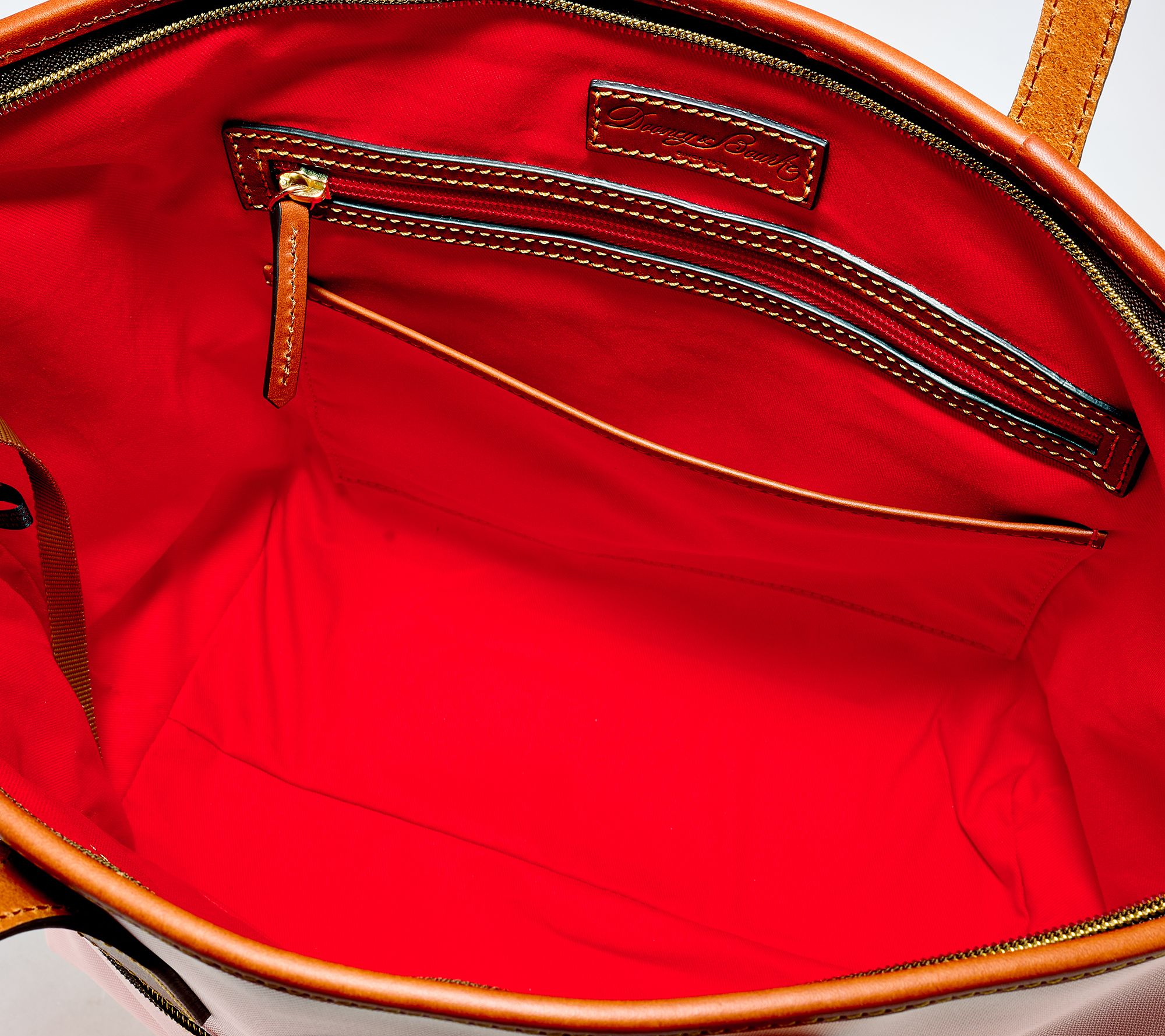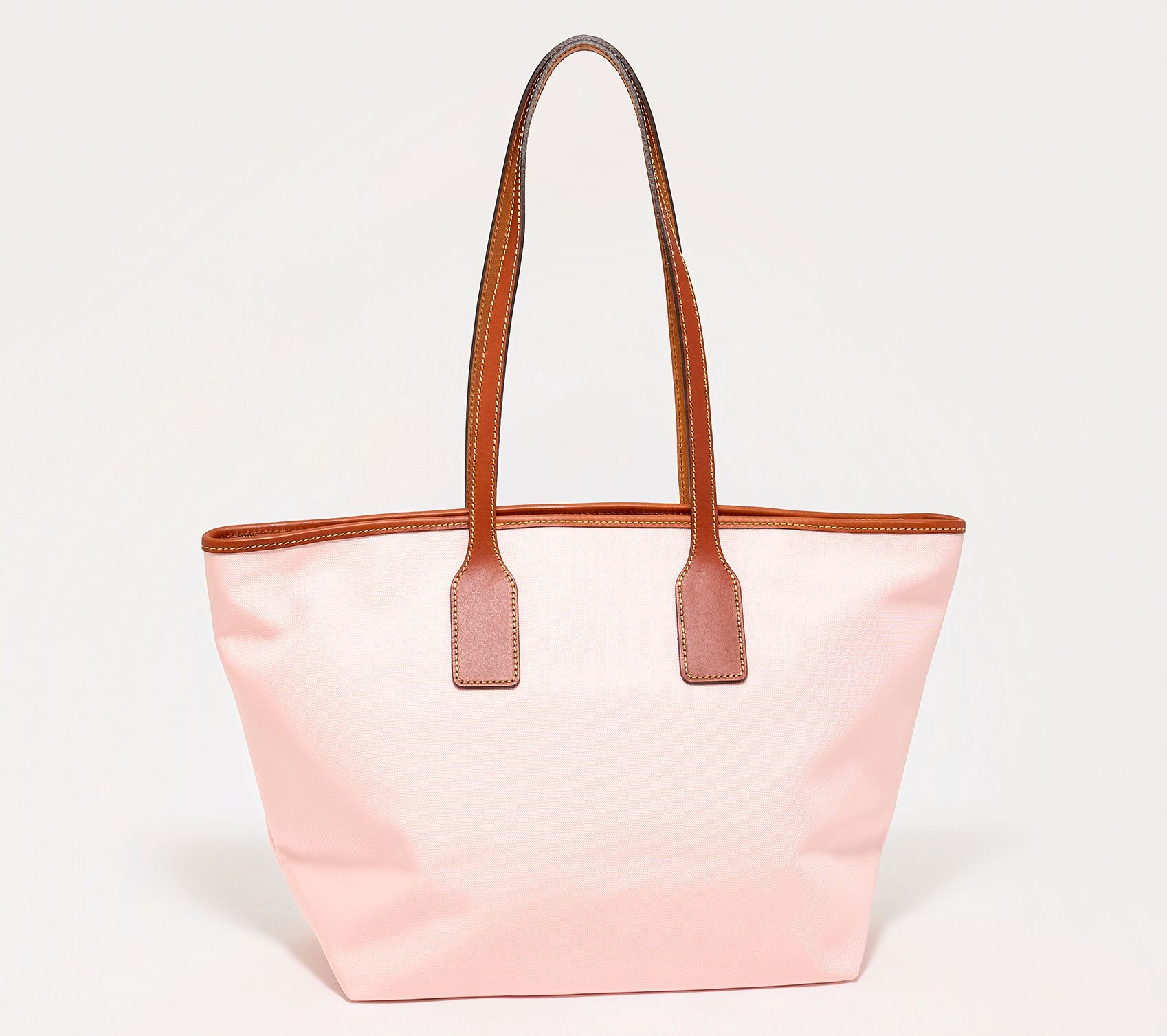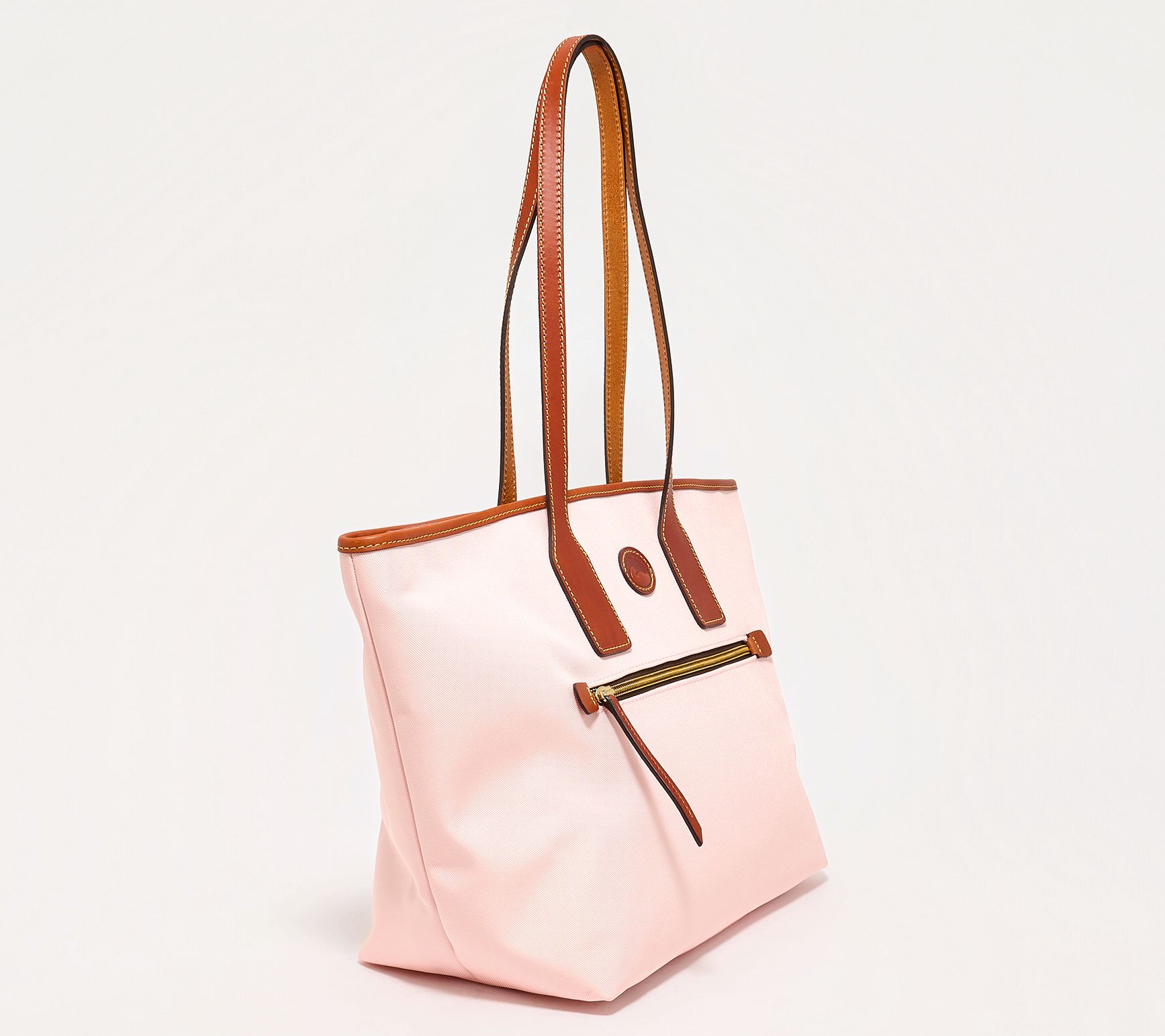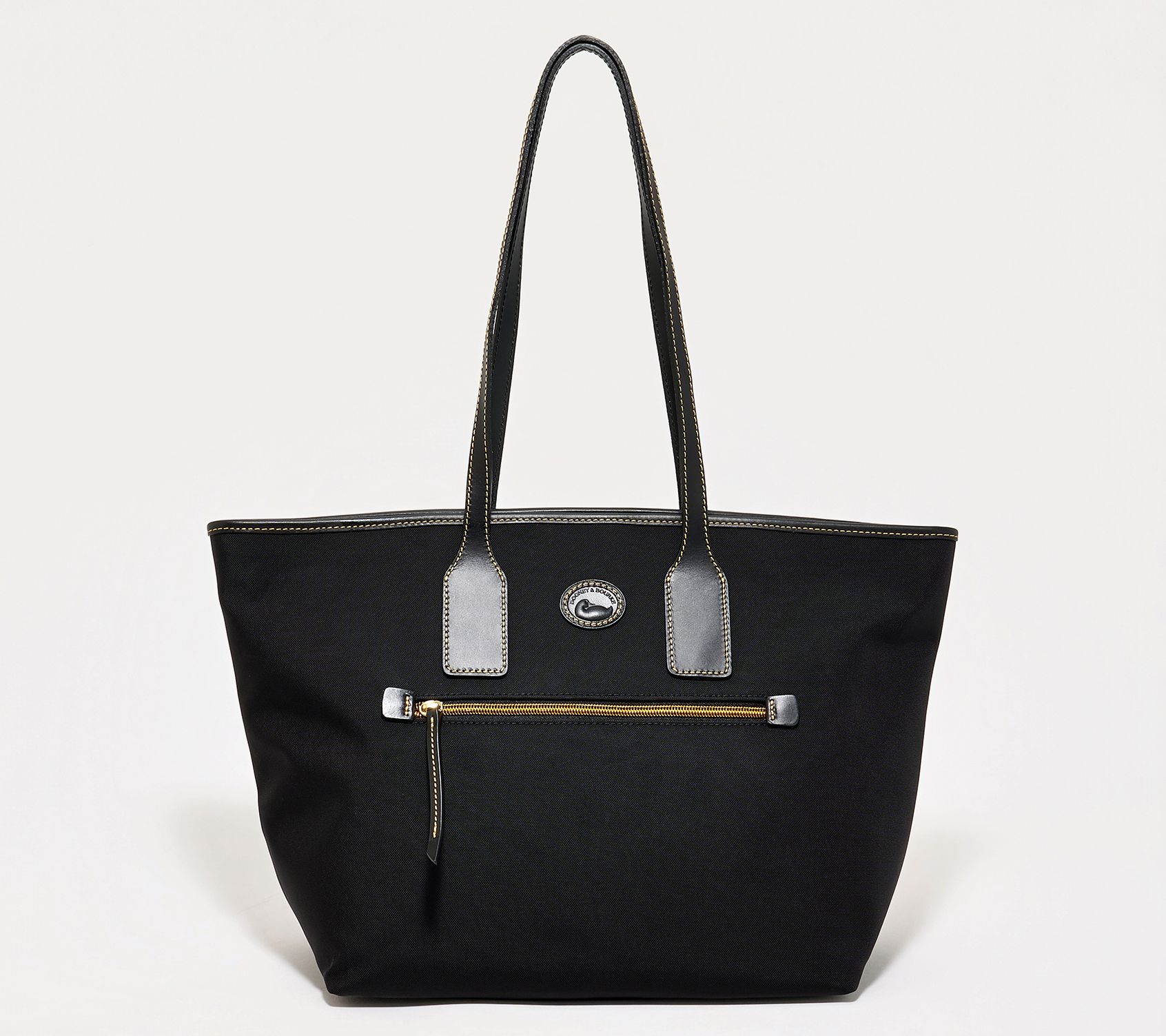 Slip this versatile nylon tote over your shoulder and find ample space for daily essentials, whether you're headed to the office or running errands downtown. Sturdy leather trim and protective bottom feet lend lasting style to a polished silhouette, while multiple interior and exterior pockets make it simple to stay organized on the go. From Dooney & Bourke.