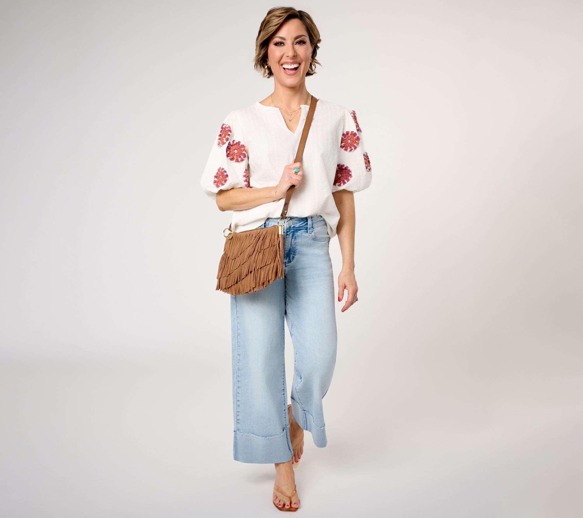 Whether mated with your favorite denim or a flowing skirt, this woven blouse infuses every fashion moment with joy. Embroidered puff sleeves and floral accents lend charm, while the graceful shape offers comfort and effortless polish from desk to dinner. From Studio Park™ x Amy Stran.