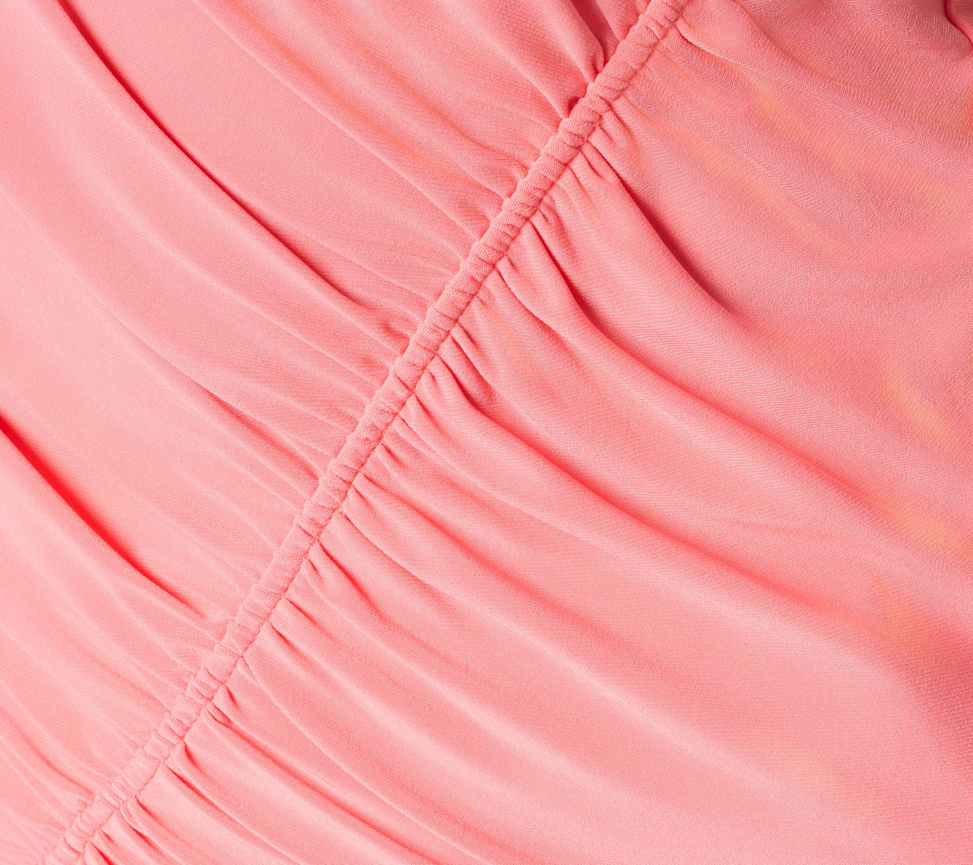 • Features: pullover, sleeveless, ruching front and back, high scoop neckline