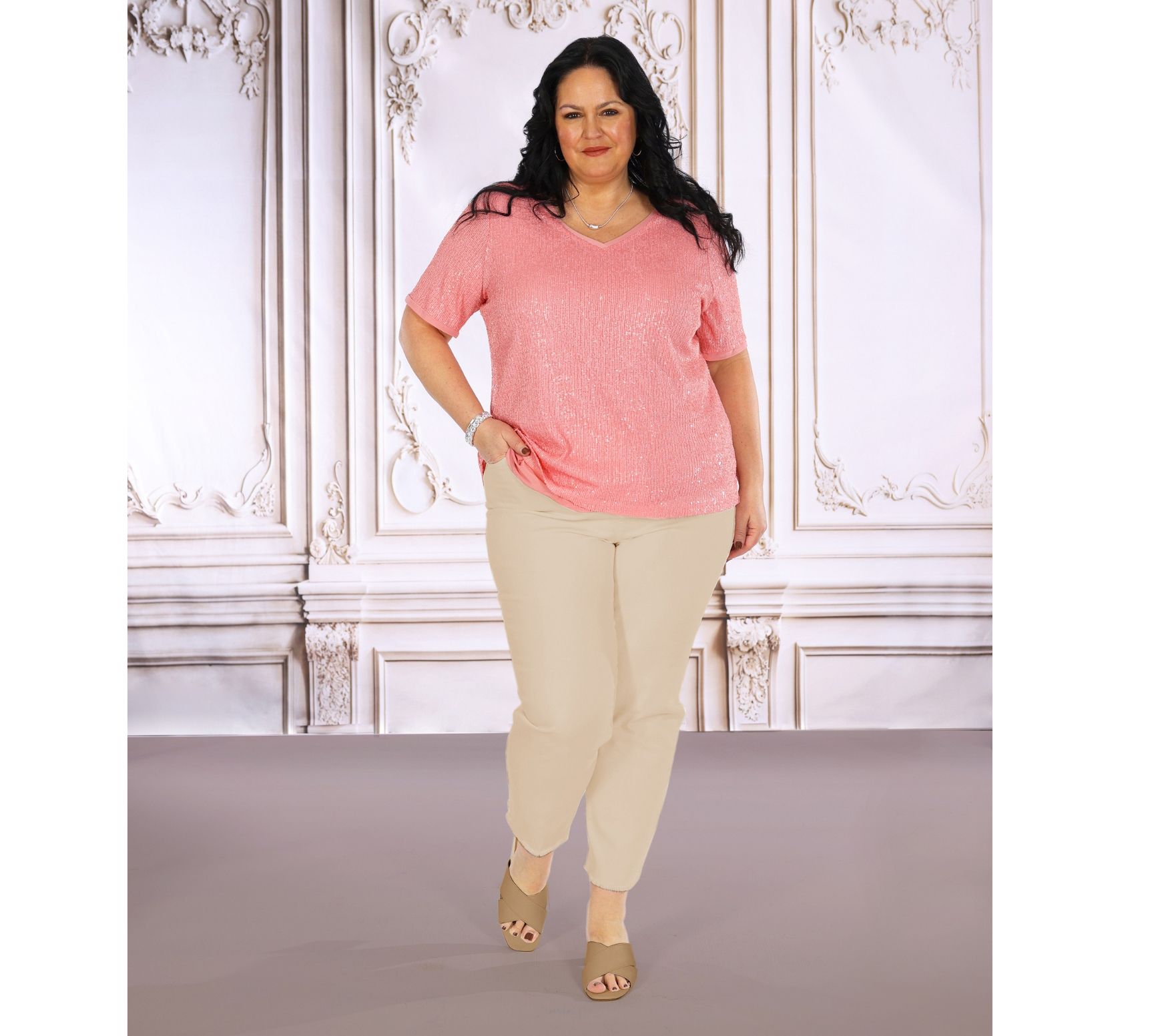Evenings out and festive get-togethers feel instantly more dazzling in this V-neck sequin tee. The mesh-lined design strikes a balance between comfort and radiance, while solid trim at the neckline and sleeves gives just enough definition for a sophisticated finish. Elbow-length sleeves keep things breezy for all your special moments. From Dennis Basso.
