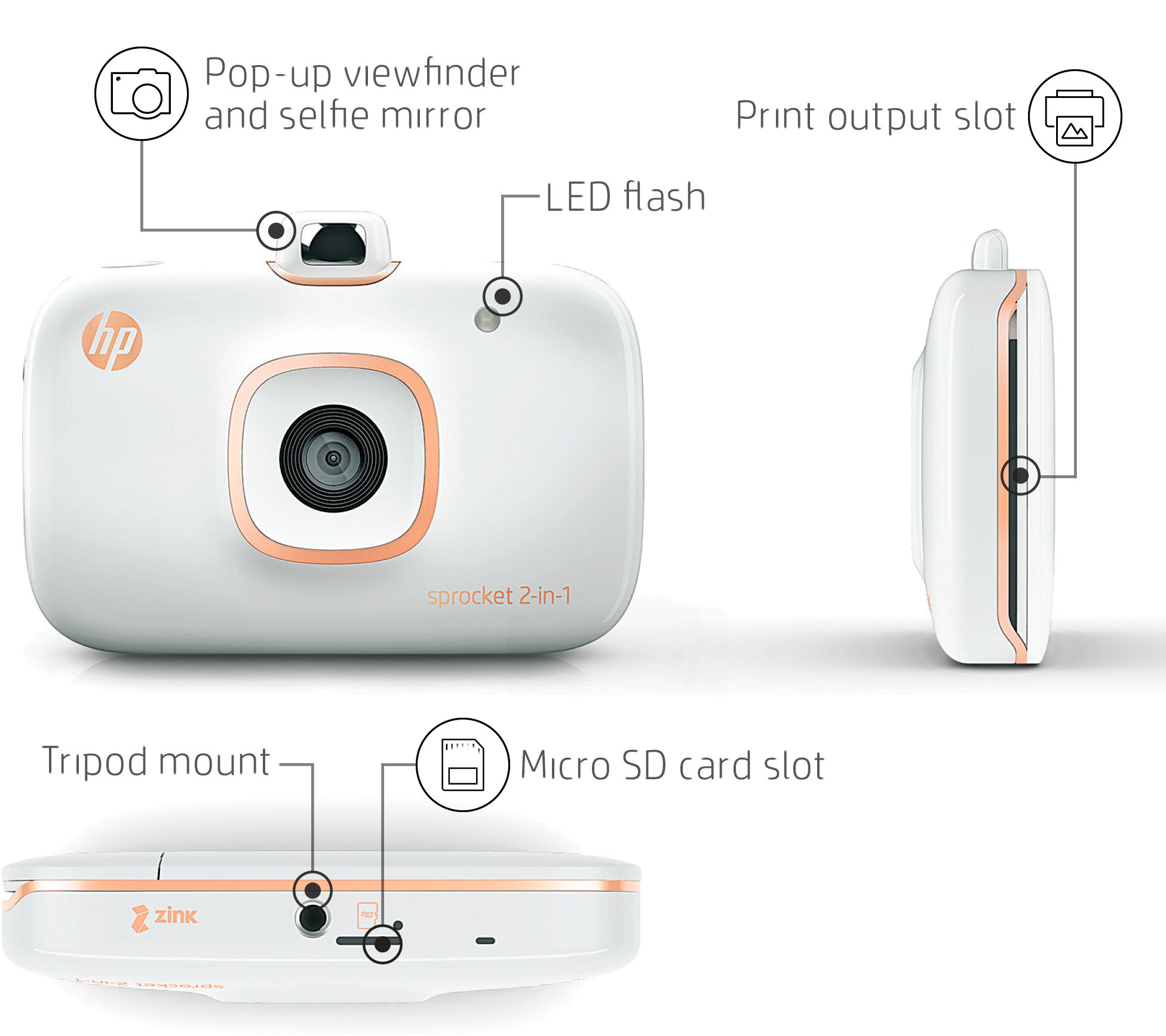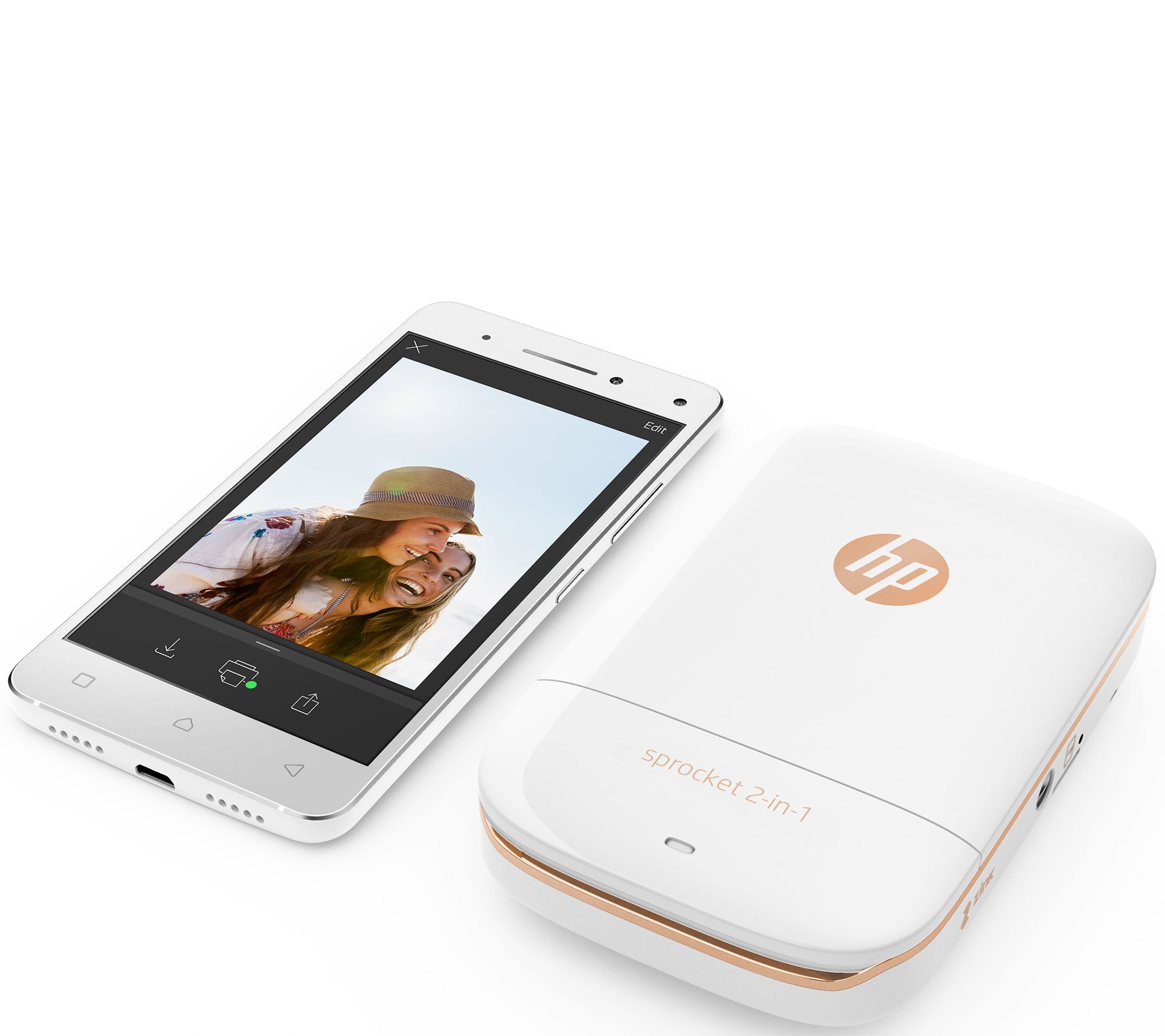 Snap and print in an instant with the HP Sprocket 2-in-1 smartphone printer and instant camera, which creates 2x3 color photos in an instant. Or, you can print pics straight from your smartphone, so you can share tangible, take-home keepsakes from any gathering. And there's no need for ink--the ultra-compact printer uses ZINK technology, taking the worry and wait out of the process. From HP.