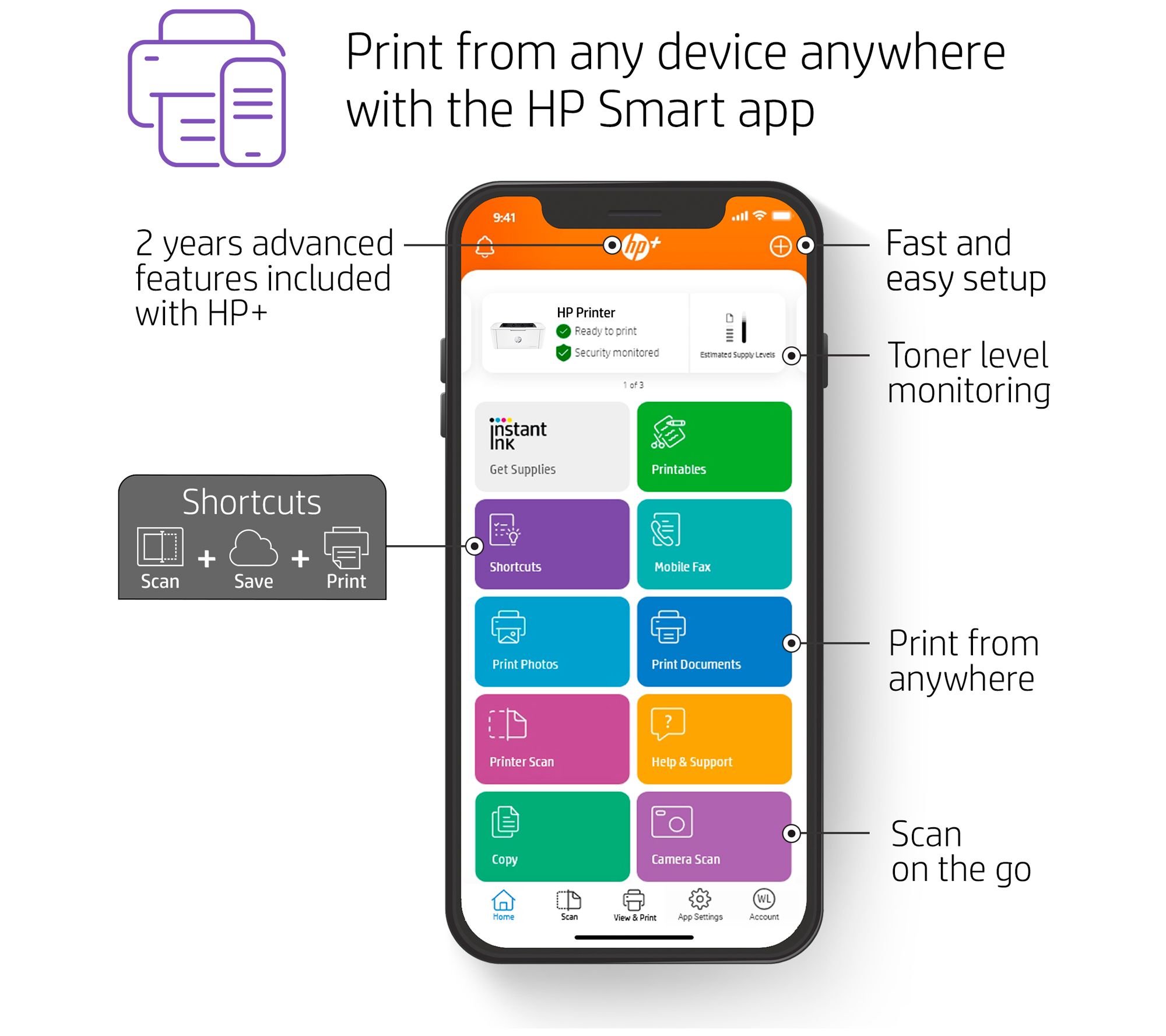 • HP Smart app; Apple AirPrint; Mopria-certified; Wi-Fi Direct printing