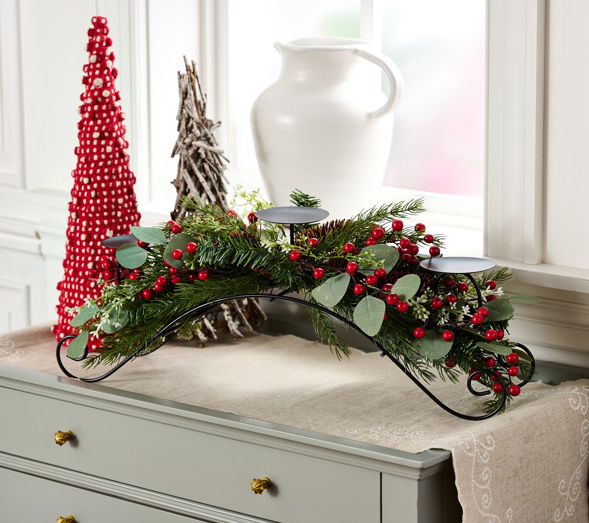 • Lifelike pine branches, eucalyptus leaves, pine cones, and red berries