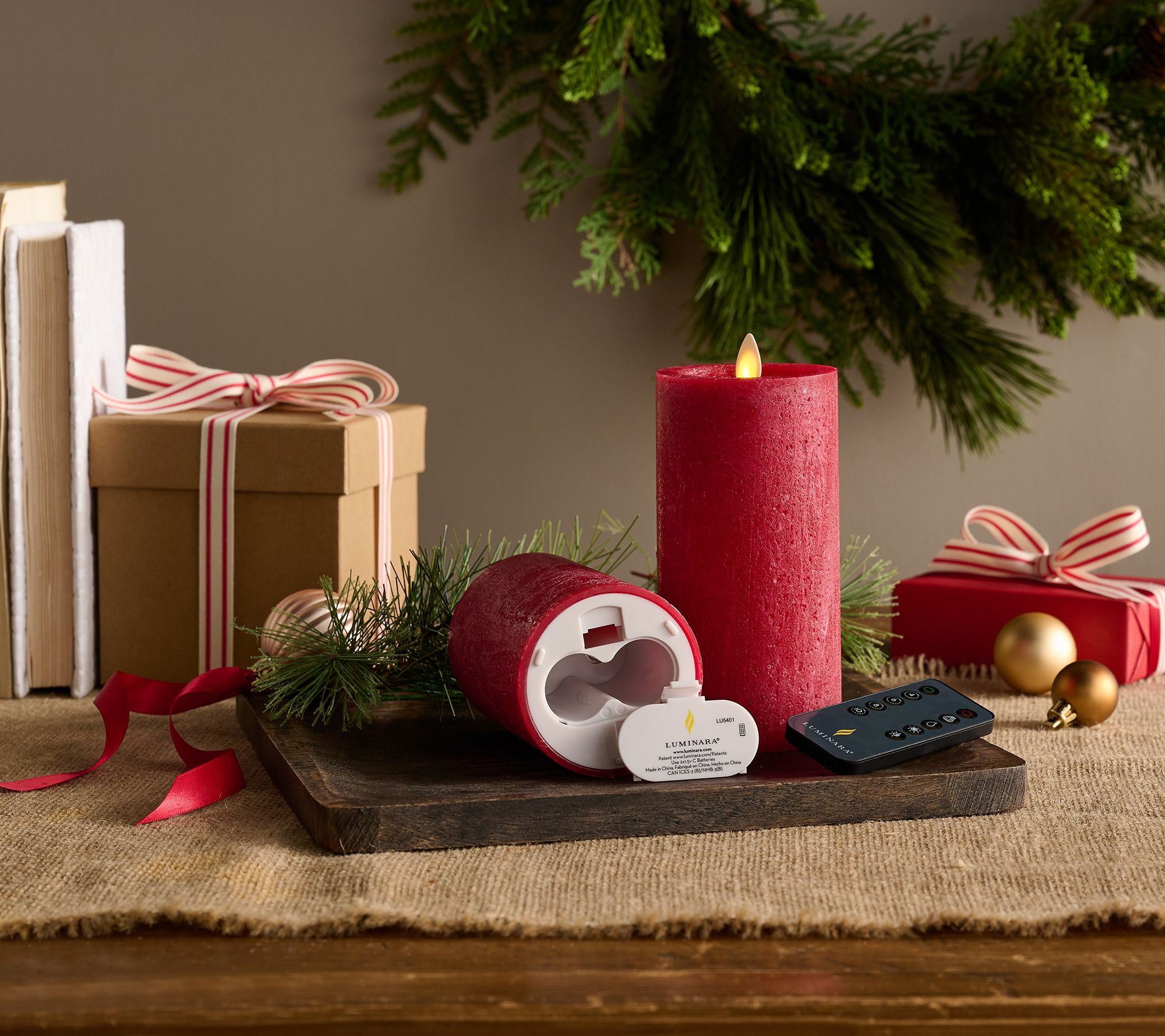 • Includes 6.5"H and 4.5"H flameless pillar candles and remote