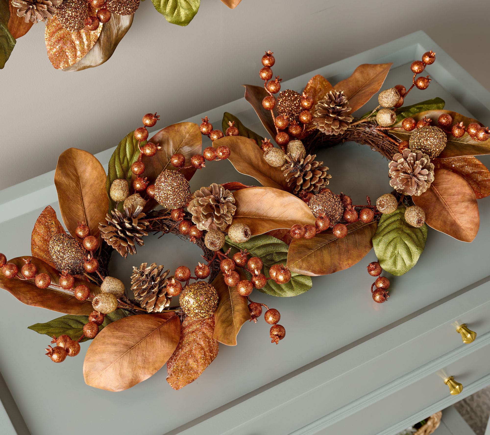 These chic and elegant candle rings feature magnolia leaves, beaded acorns, glittered berries, and pine cones. Display the autumnal hues in your home for a vibrant, upscale look. From the Valerie Parr Hill Collection.