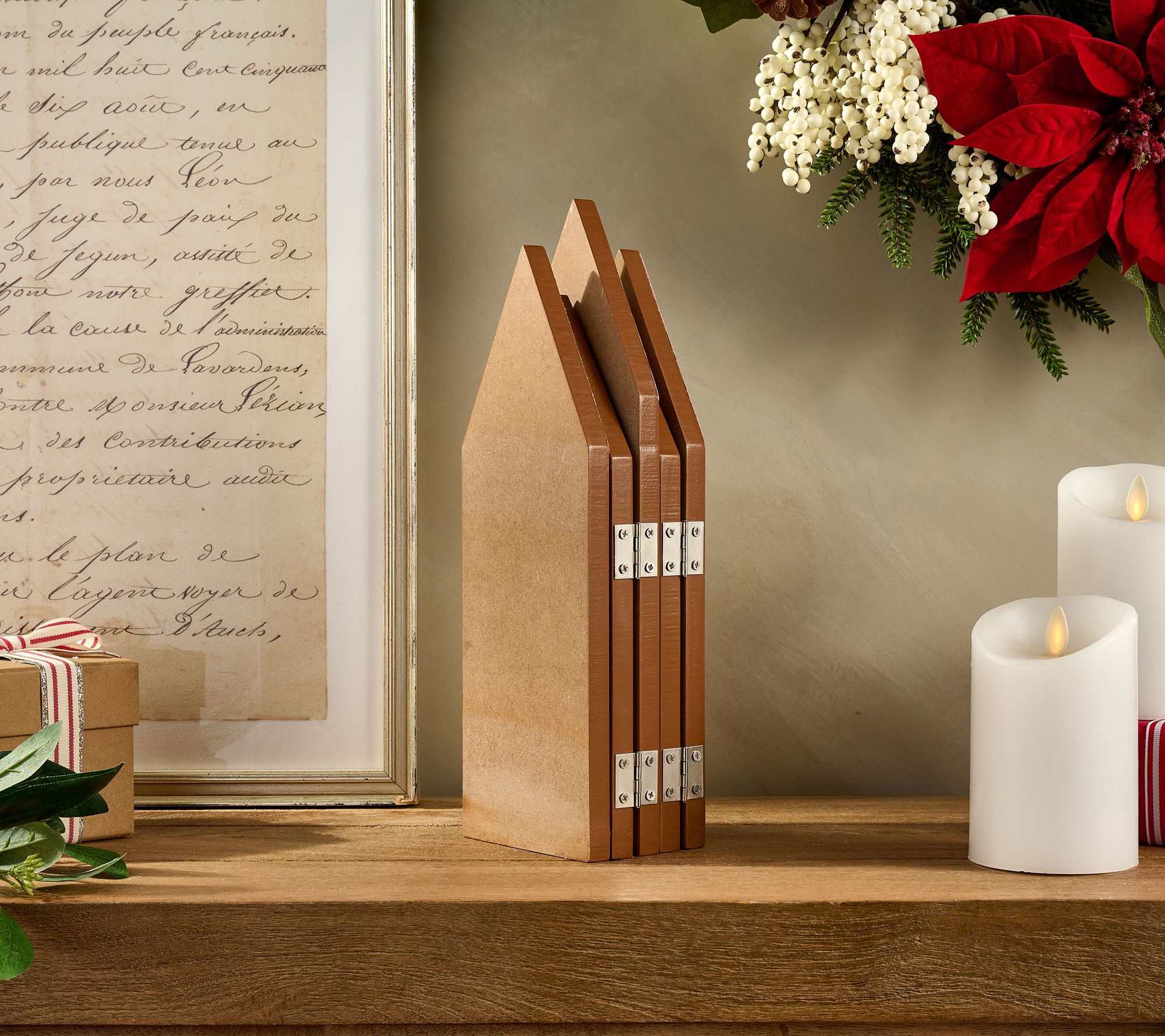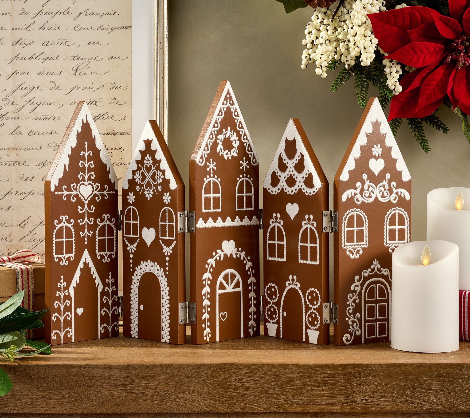 A holiday-home completer, use this decorative wooden screen as a wonderfully wintry backdrop to your candlescapes, gingerbread houses, or village scenes. Or display it solo on a mantel or window sill. From the Valerie Parr Hill Collection.