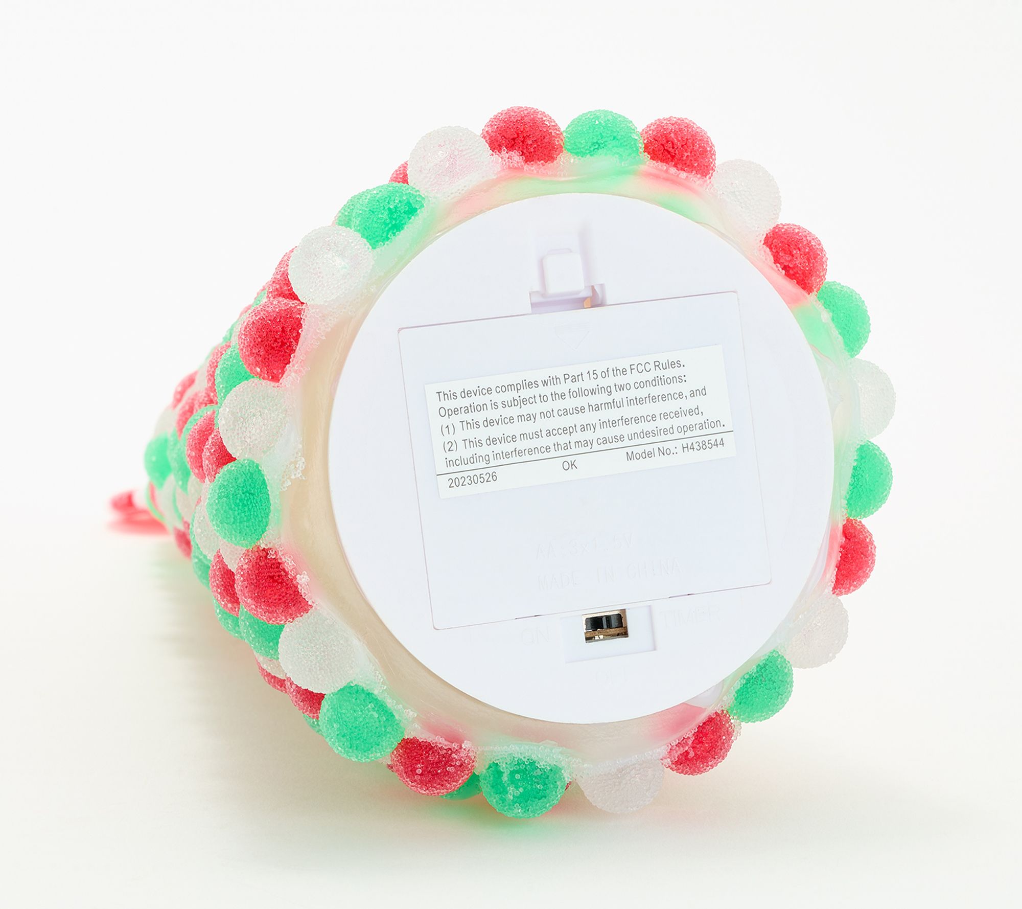 • Illuminated cone-shaped tree covered in faux gumdrops and topped with a peppermint candy