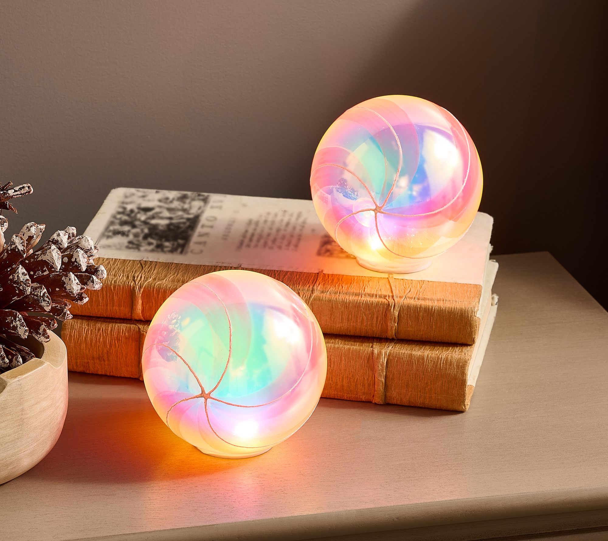 A sweet addition to your holiday home, these peppermint glass ornaments feature an iridescent finish for a lovely sheen. Use the convenient timer function to have them come on and go off at the same time each evening. From the Valerie Parr Hill Collection.
